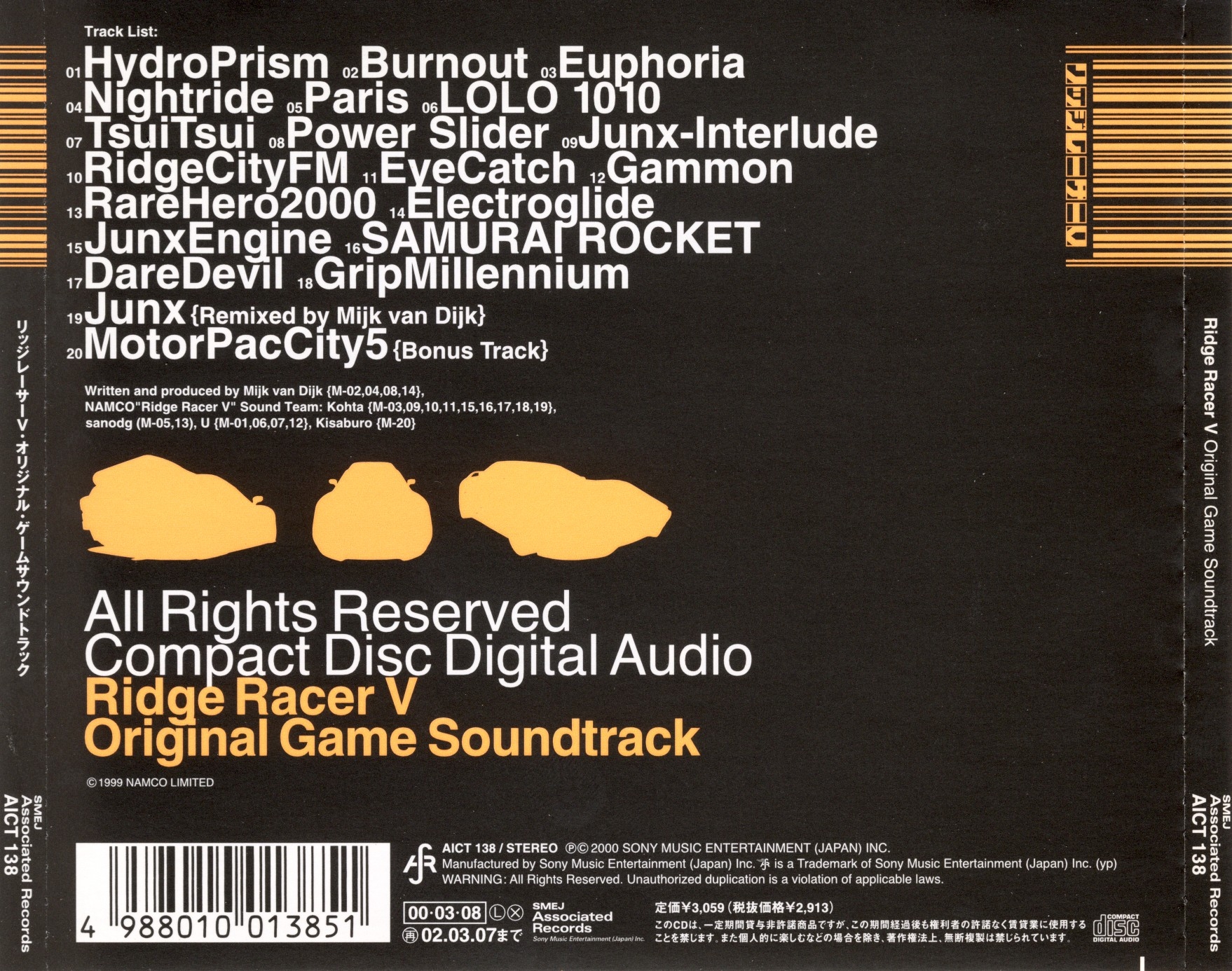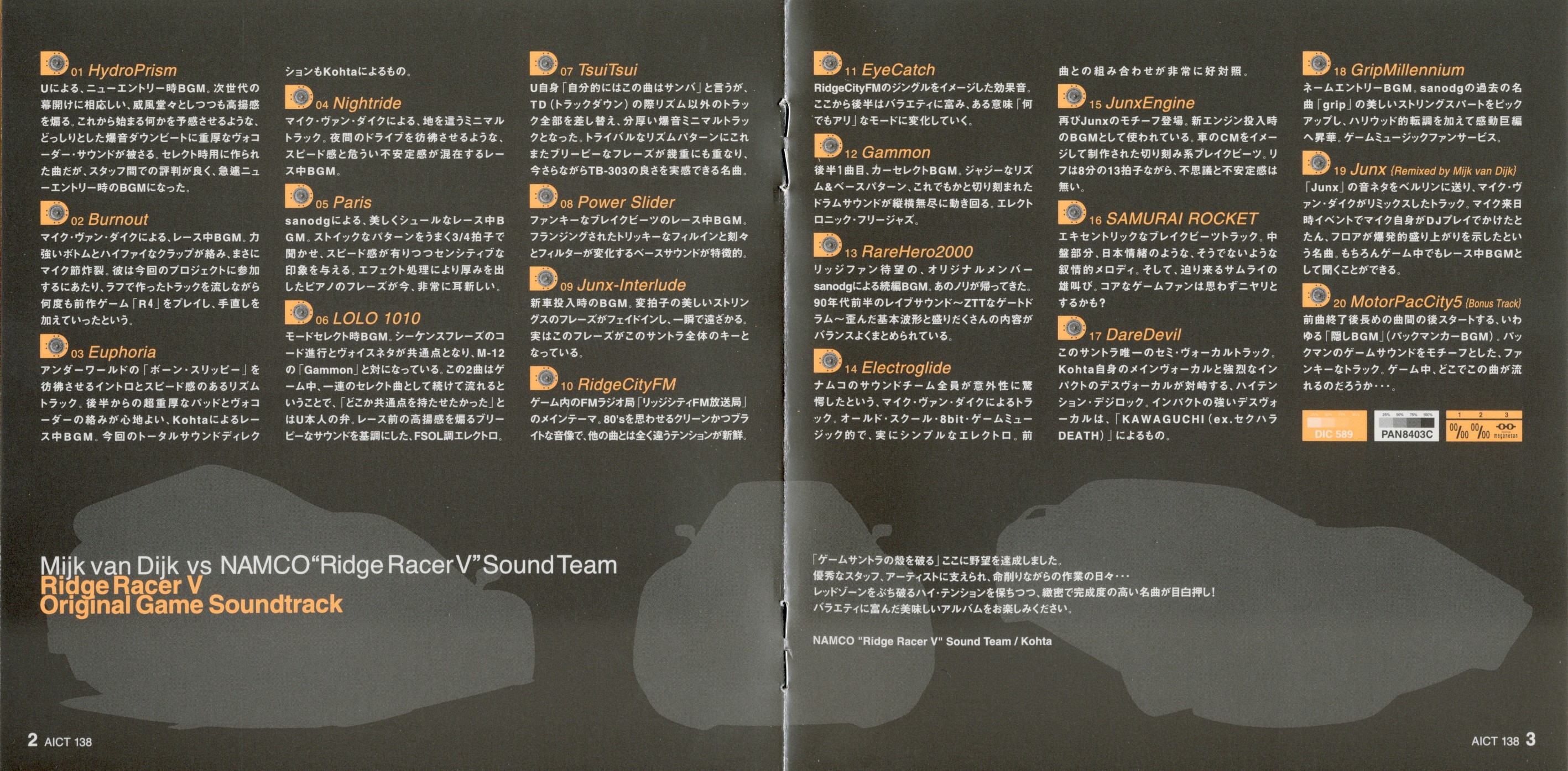 NAMCO "Ridge Racer V" Sound Team: Kohta (M-03,09,10,11,15,16,17,18,19), sanodg (M-05,13), U (M-01,06,07,12), Kisaburo (M-20).