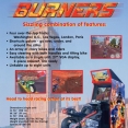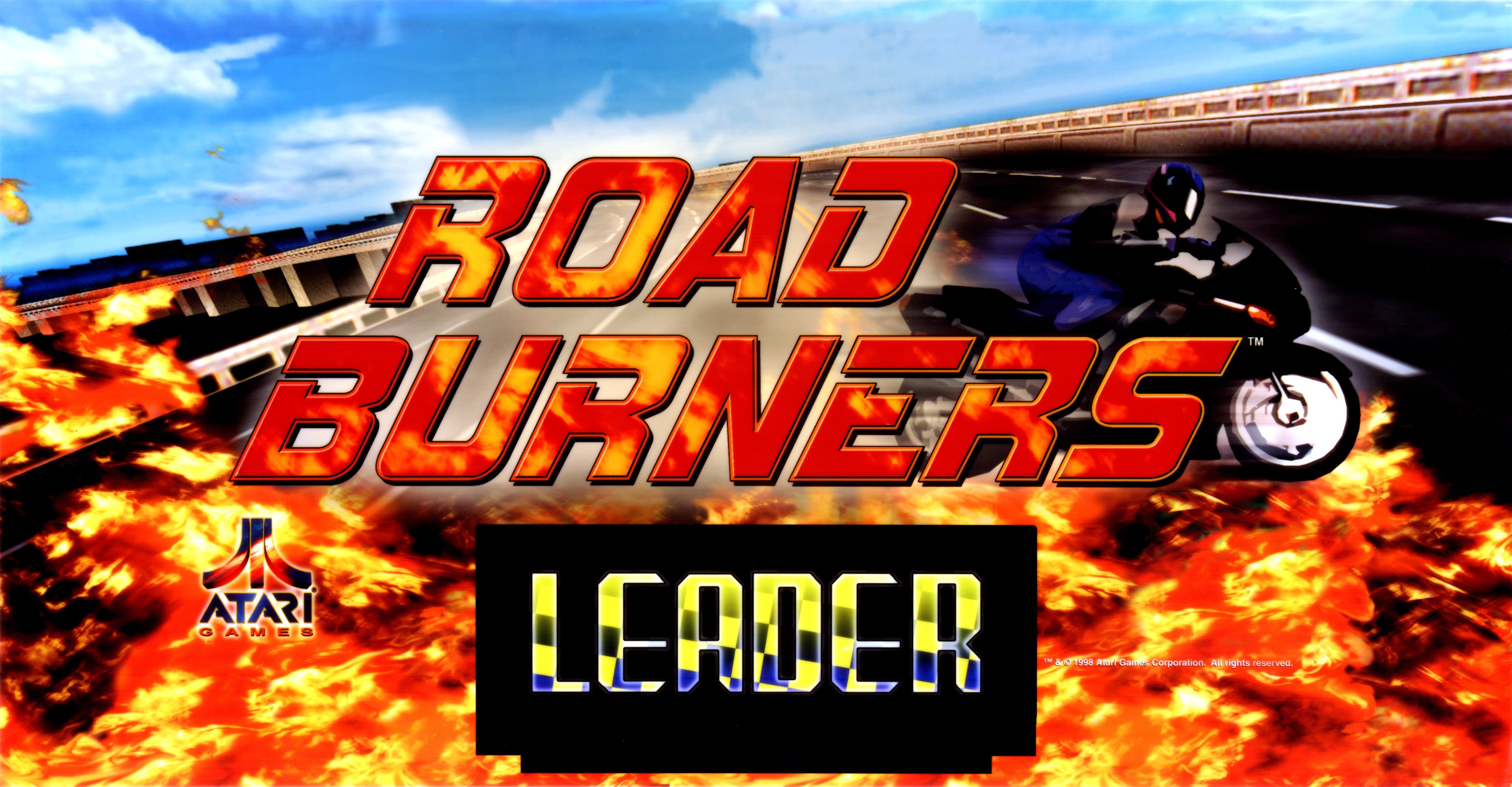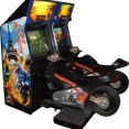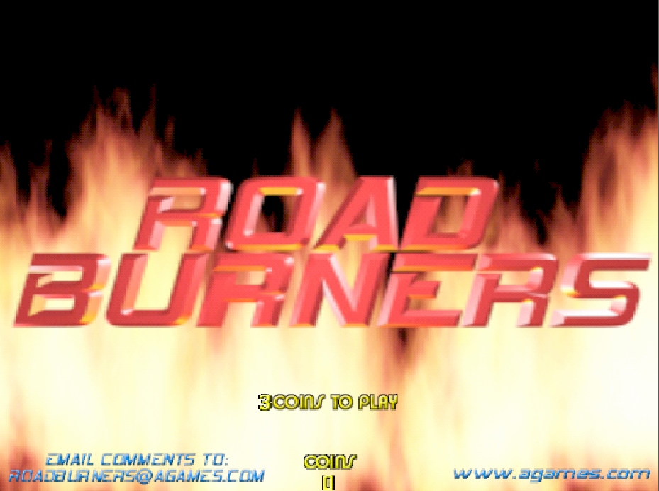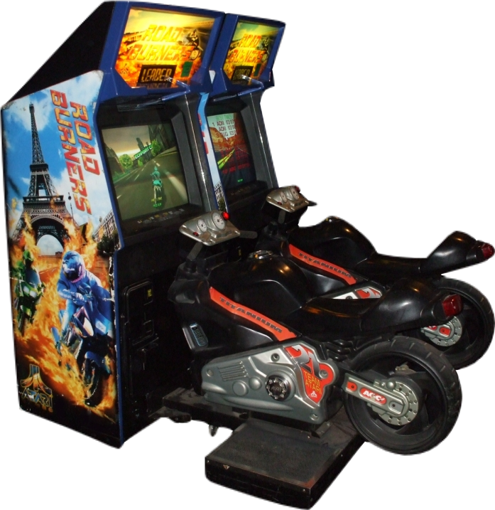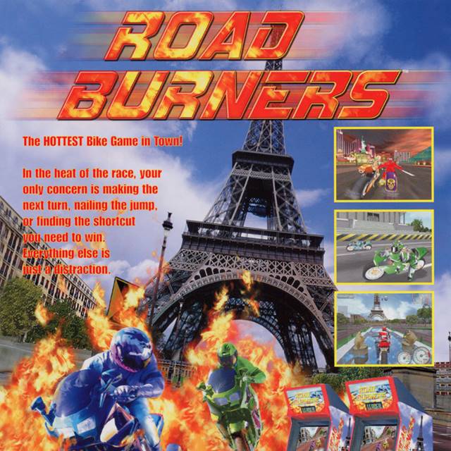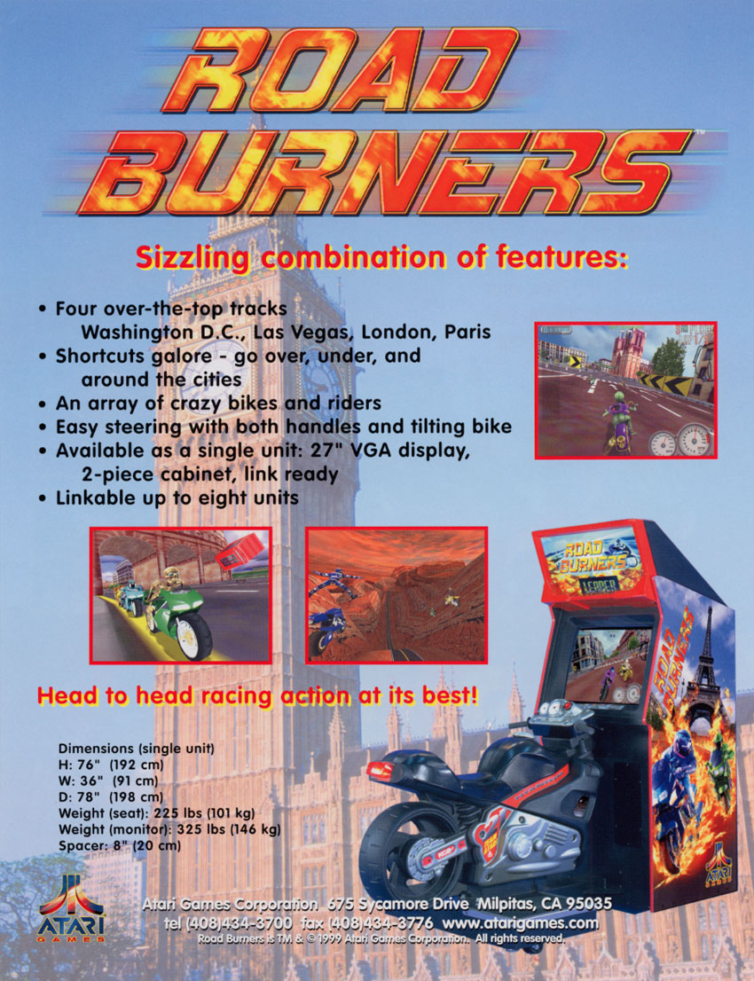 Road Burners was produced by Atari in 1999. A highly detailed motorcycle racing game in Washington D.C., London, Paris, Las Vegas, or the Isle of Man. It features a tilting motorcycle and the ability to be hooked to other like machines for up to 8 simultaneous players. The player's score is based upon the distance accumulated in the time limit. Players must pass checkpoints to earn additional time.