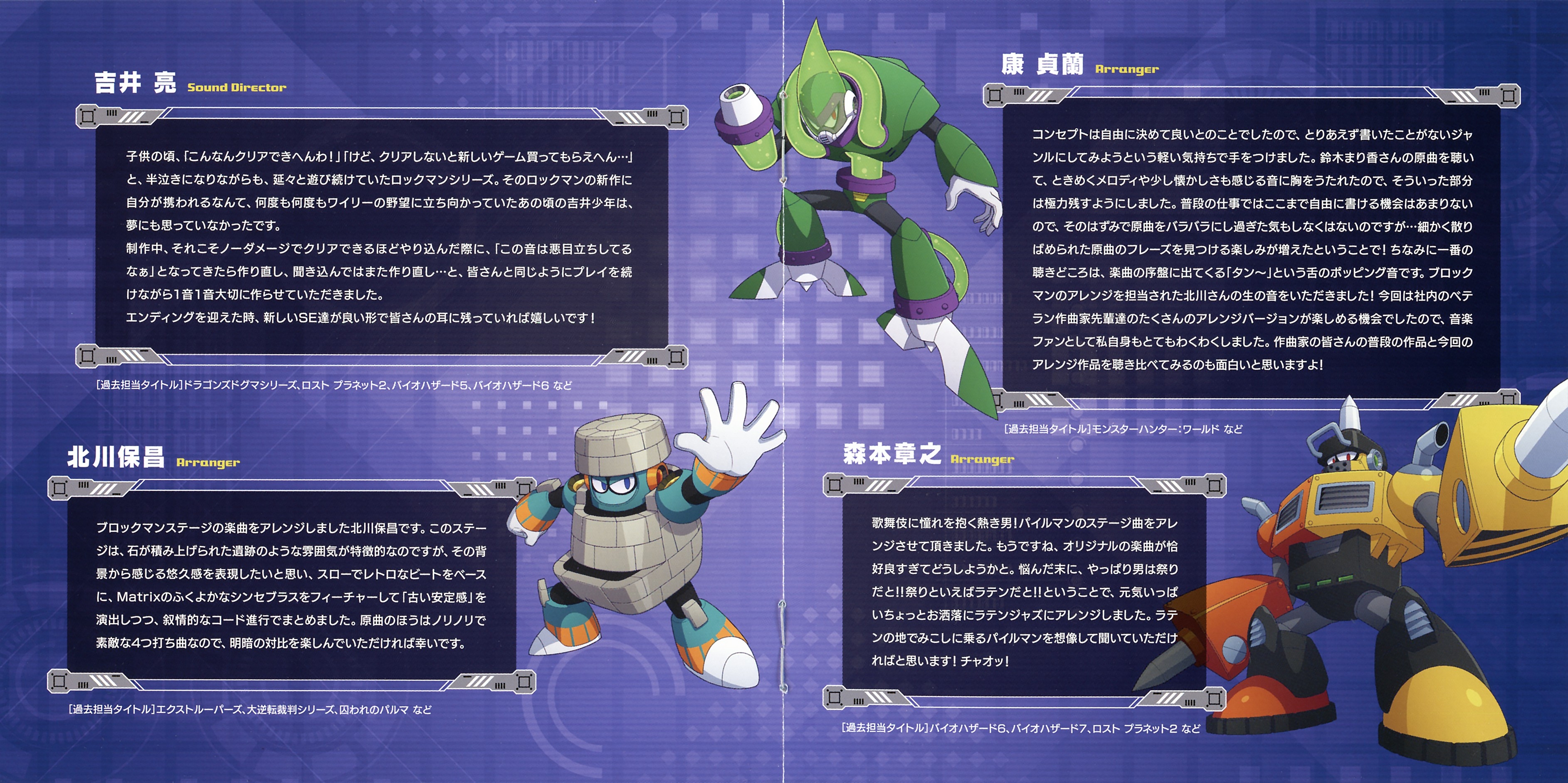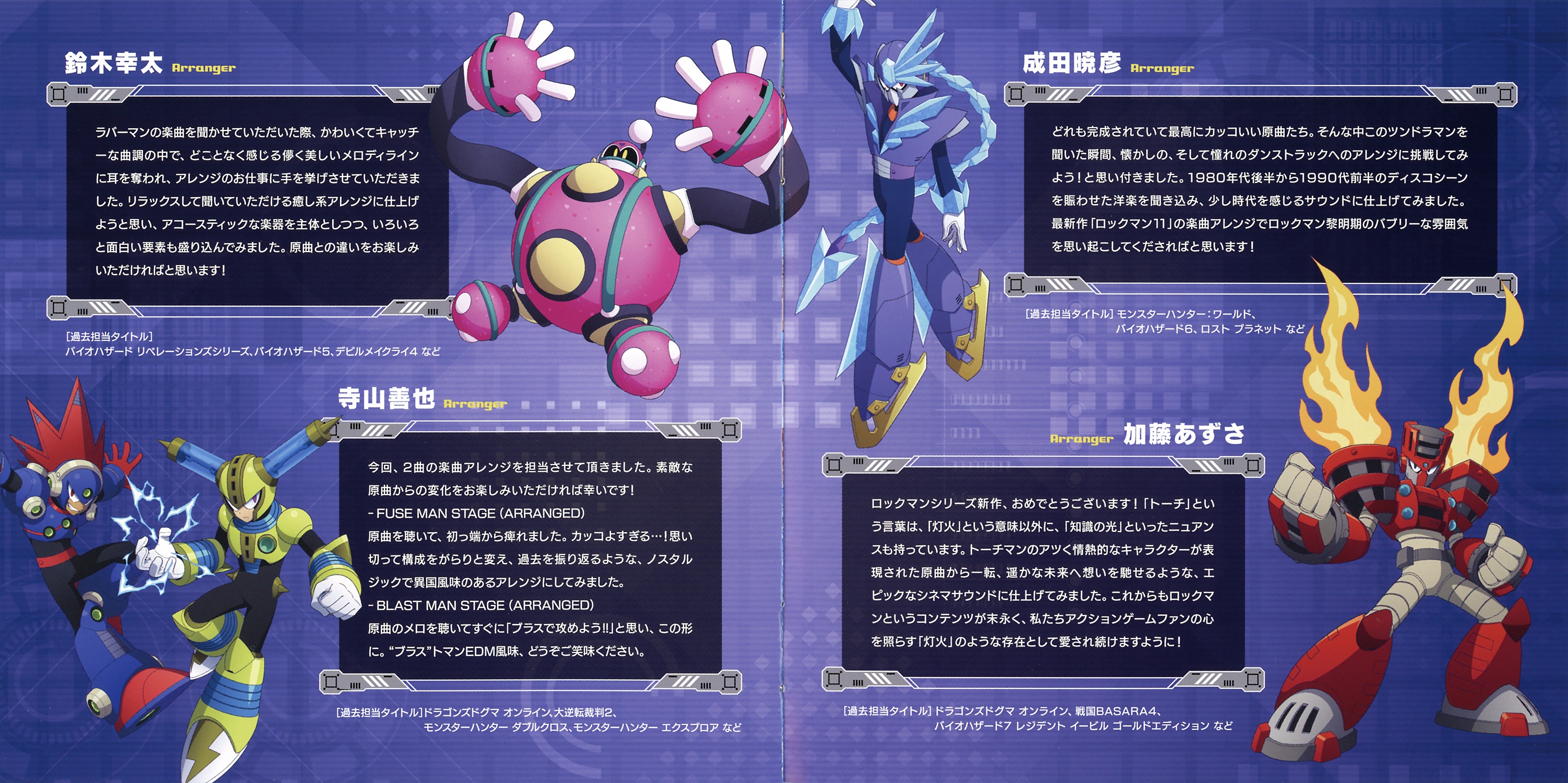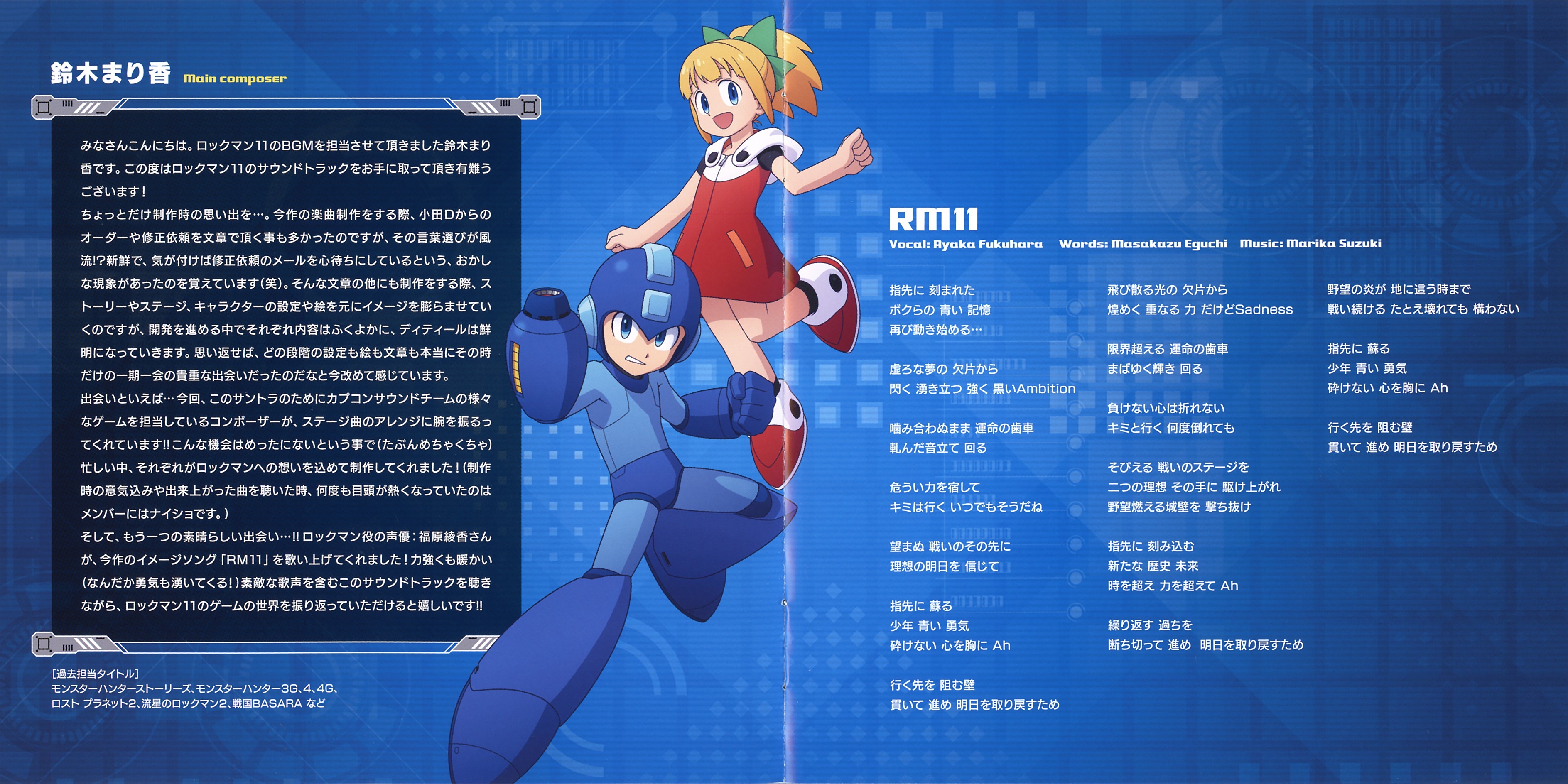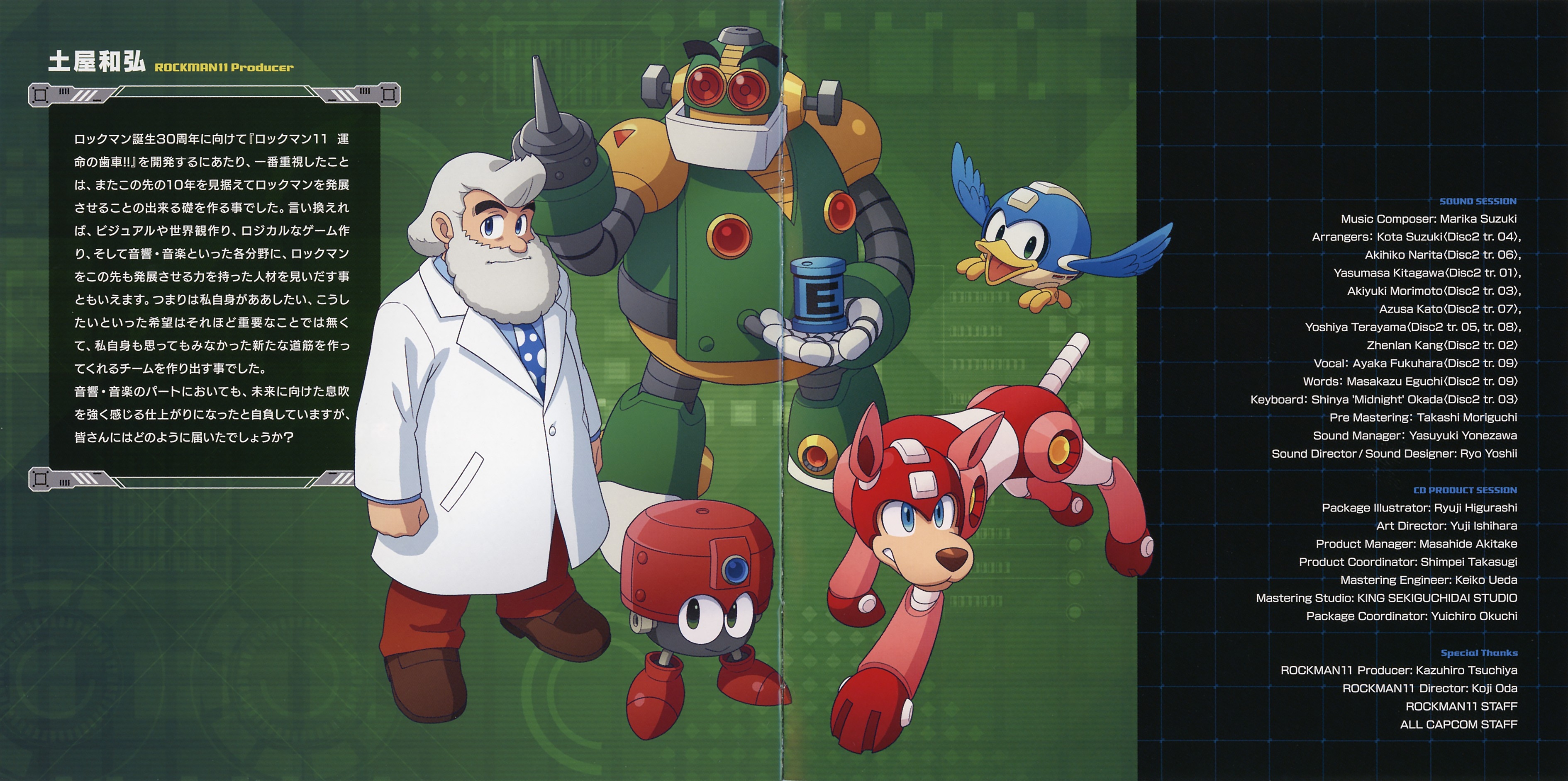 Liner Notes: Marika Suzuki (Main composer) (pg. 3), Ryo Yoshii (Sound Director) (pg. 5), Yasumasa Kitagawa (Arranger) (pg. 5), Zhenlan Kang (Arranger) (pg. 6), Akiyuki Morimoto (Arranger) (pg. 6), Kota Suzuki (Arranger) (pg. 7), Yoshiya Terayama (Arranger) (pg. 7), Akihiko Narita (Arranger) (pg. 8), Azusa Kato (Arranger) (pg. 8), Kazuhiro Tsuchiya (ROCKMAN11 Producer) (pg. 9)