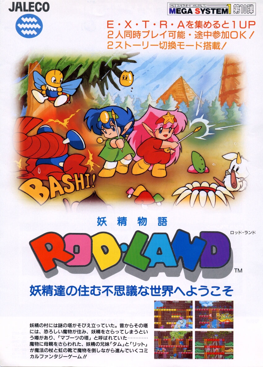 The player(s) control one or two fairies called Rit and Tam armed with a magic wand (rod). Following the concept of Taito's Bubble Bobble, the rod doesn't kill the monsters directly, but only leaves them immobilized, crying. To kill them, the rod can grasp them in a magic force-field and the player can smash them down over her head until they disappear and leave a power-up behind.