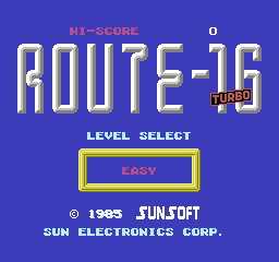 Route-16 Turbo, an improved version of Route-16 for the Famicom, was published on October 4, 1985, by Sunsoft only in Japan. Route-16 Turbo added multiple difficulty levels and improved graphics and music.
