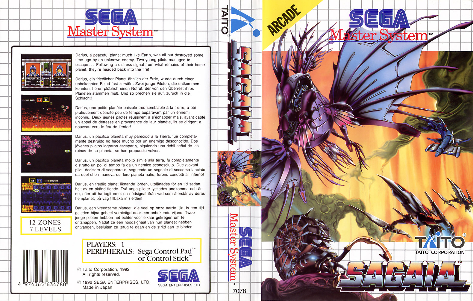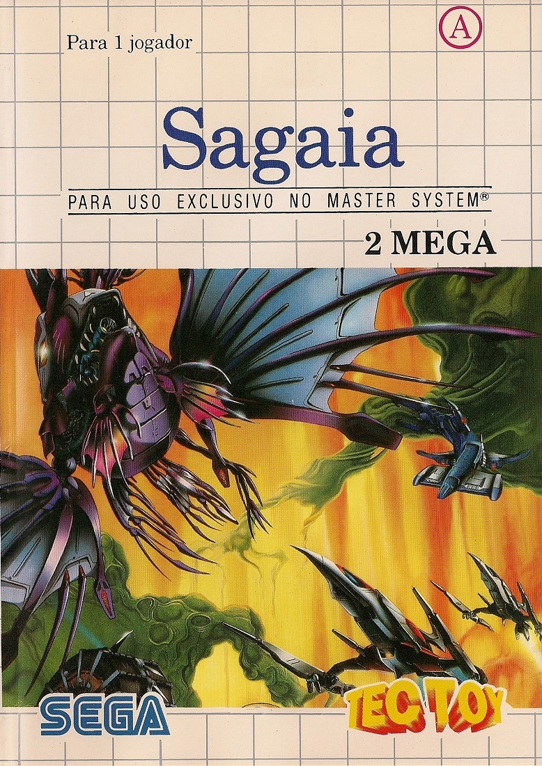 Sagaia is a shoot em up video game released for the Sega Master in 1992 only in Europe, Brazil and Australia. It is a conversion of Darius II, adapted for the Master System hardware with 8-bit graphics. This version features fewer levels and branching paths, while a few bosses were shuffled around.