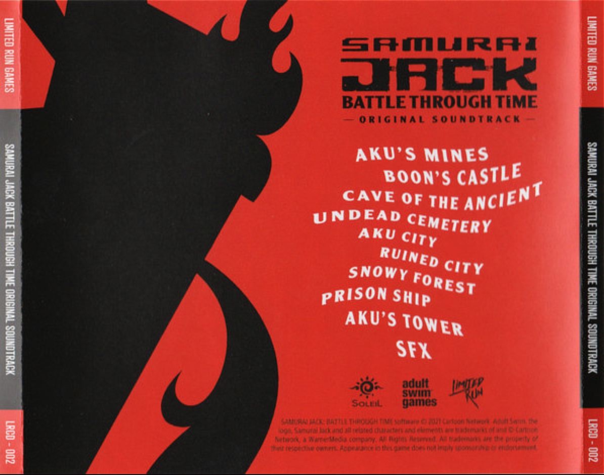 CD soundtrack available with the "Limited Run #356: Samurai Jack: Battle Through Time Collector's Edition" for PS4 and "Switch Limited Run #79: Samurai Jack: Battle Through Time Collector's Edition" for NSW.