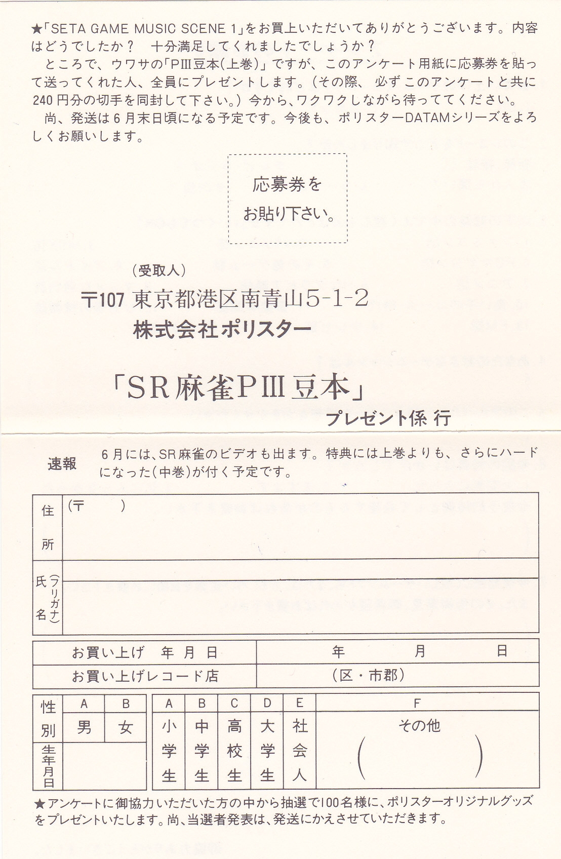 Seta Game Music Special Scene "Super Real Mahjong" Mitsumete Ii Yo First Issue (1989)