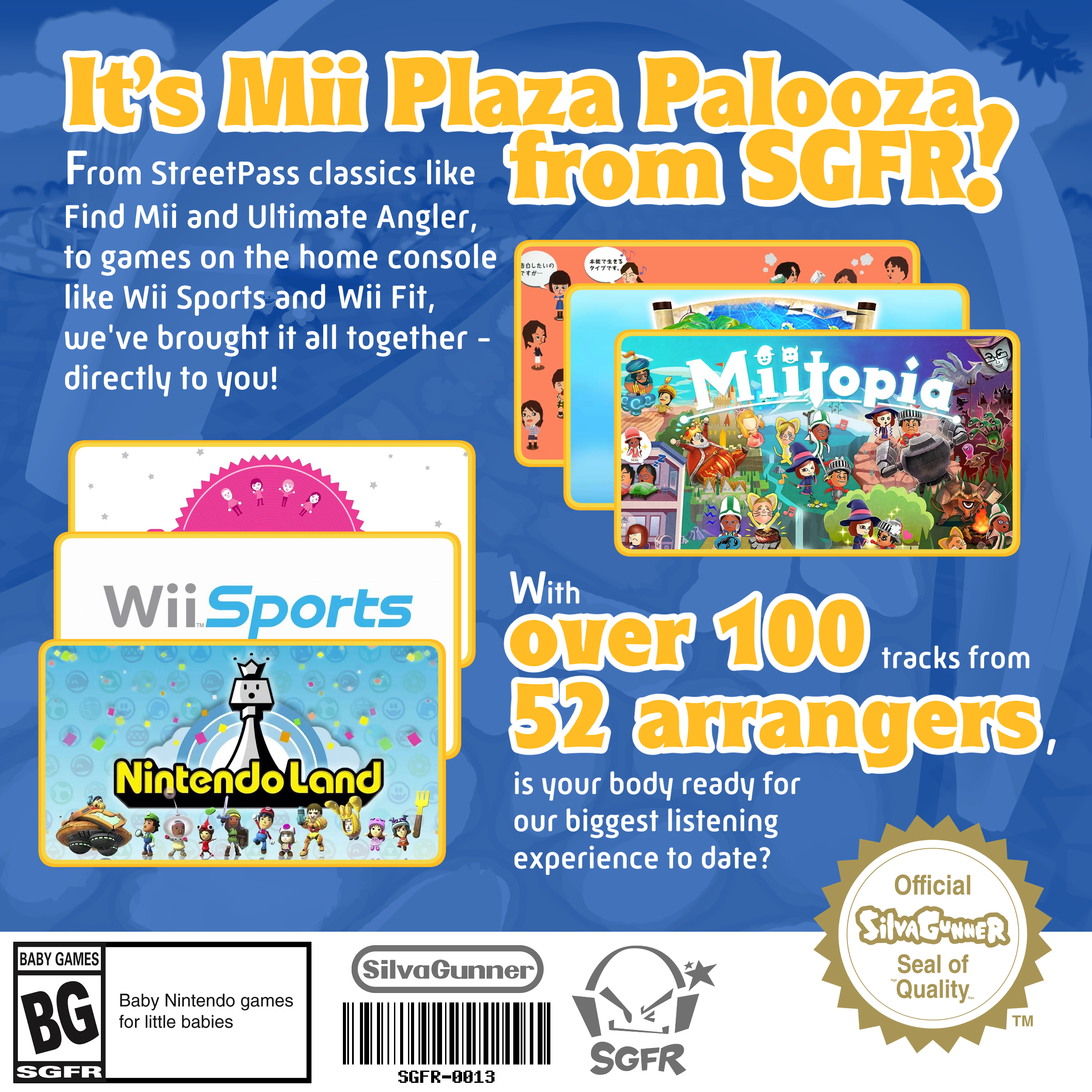 It's Mii Plaza Palooza from SGFR! From StreetPass classics like Find Mii and Ultimate Angler, to games on the home console like Wii Sports and Wii Fit, we've brought it all together - directly to you! With over 100 tracks from 52 unique arrangers, is your body ready for our biggest listening experience to date?
