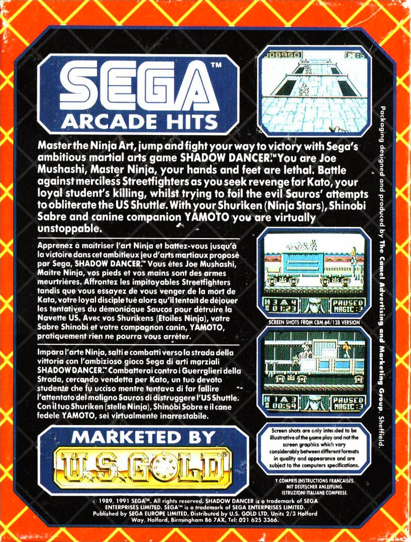 Master the Ninja Art, jump and fight your way to victory with Sega's ambitious martial arts game SHADOW DANCER! You are Joe Mushashi, Master Ninja, your hands and feet are lethal. Battle against merciless Streetfighters as you seek revenge for Kato, your loyal student's killing, whilst trying to foil the evil Sauros' attempts to obliterate the US Shuttle. With your Shuriken (Ninja Stars), Shinobi Sabre and canine companion YAMOTO you are virtually unstoppable.
