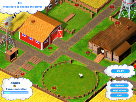 The main objective in Sheep's Quest is to direct a flock of sheep to an exit avoiding hazards along the way. The sheep blindly march along, only turning when they reach a blockage, such as a wall or other barrier. By placing arrows on the maze-like board, guide them where they should go. To finish a level and open the exit, all coins must be collected (as well as keys in some levels) by walking a sheep over them. Reach the destination by guiding them around falling boxes, trees and the like, and keeping them from falling into holes or running into enemies. Coins gathered are used to upgrade their farm.