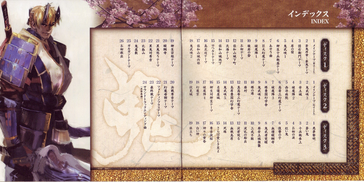 Onimusha 3's main theme motif, originally composed by Akari Kaida, is reused in a number of tracks (such as 1.13, 3.01, and chapter/character themes).