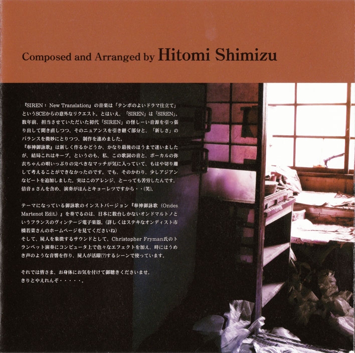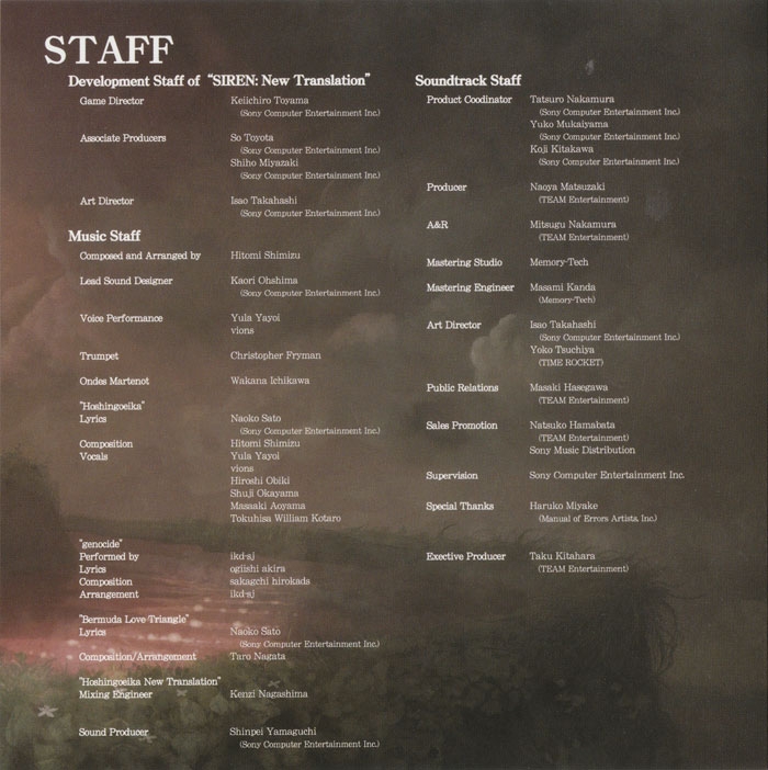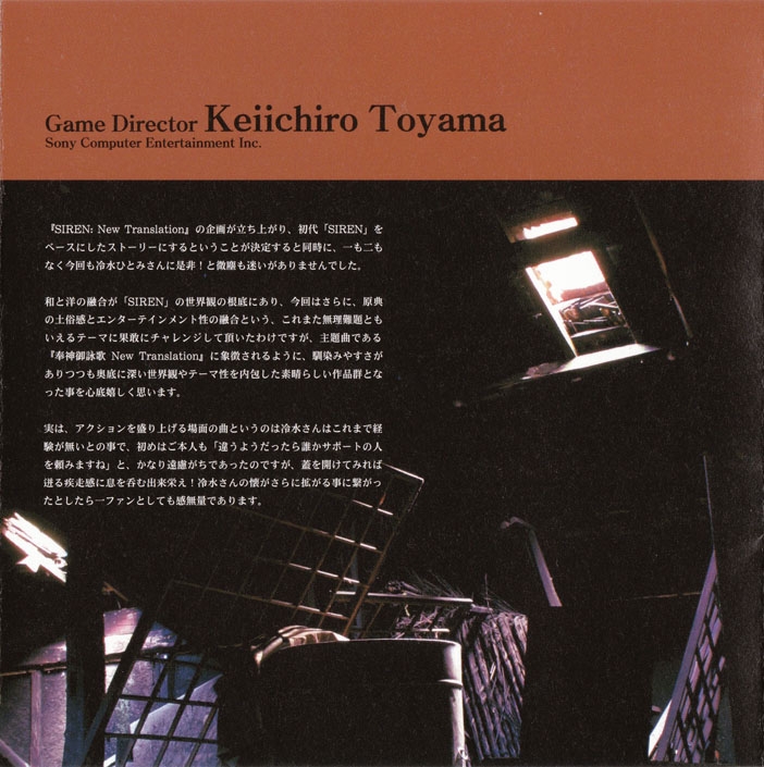 Liner Notes: Keiichiro Toyama (Game Director) (pg. 2), Hitomi Shimizu (pg. 3)