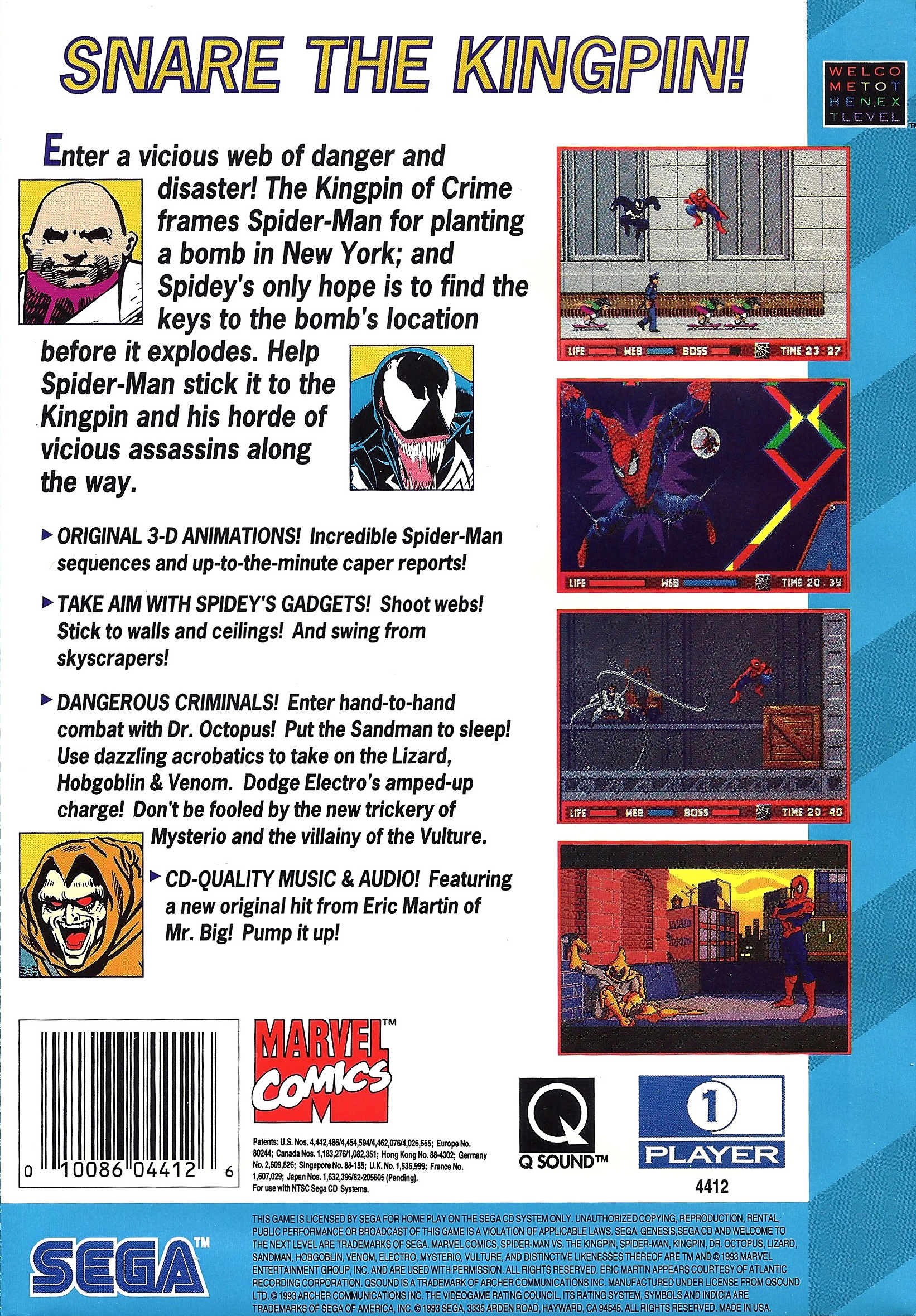 Enter a vicious web of danger and disaster! The Kingpin of Crime frames Spider-Man for planting a bomb in New York; and Spidey's only hope is to find the keys to the bomb's location before it explodes. Help Spider-Man stick it to the Kingpin and his horde of vicious assassins along the way. Enter hand-to-hand combat with Dr. Octopus! Put the Sandman to sleep! Use dazzling acrobatics to take on the Lizard, Hobgoblin and Venom! Dodge Electro's amped-up charge! Don't be fooled by the new trickery of Mysterio and the villainy of the Vulture! Take aim with Spidey's gadgets. Shoot webs! Stick to walls and ceilings! Swing from skyscrapers!