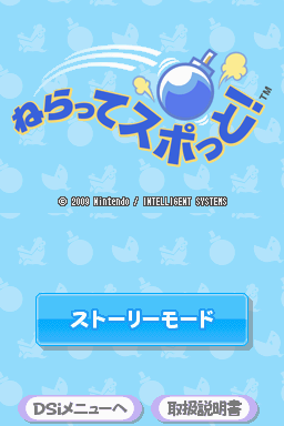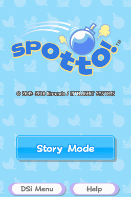 Spotto! is a puzzle game in which the player takes control of Spotto, adjusting his bomb toss trajectory with the stylus to throw bombs into the ghosts’ mouths, either directly or via obstacles located throughout the environment. While ghosts and obstacles may be moving in some of the fifty stages, Spotto remains stationary in the lower left corner all the time. In the Story Mode, the player gets five bombs at the beginning of each stage and loses one for every toss that doesn't kill an enemy. After a kill, a super bomb which causes more damage, is sometimes awarded. Besides the ghosts, some boss characters will have to be beaten.