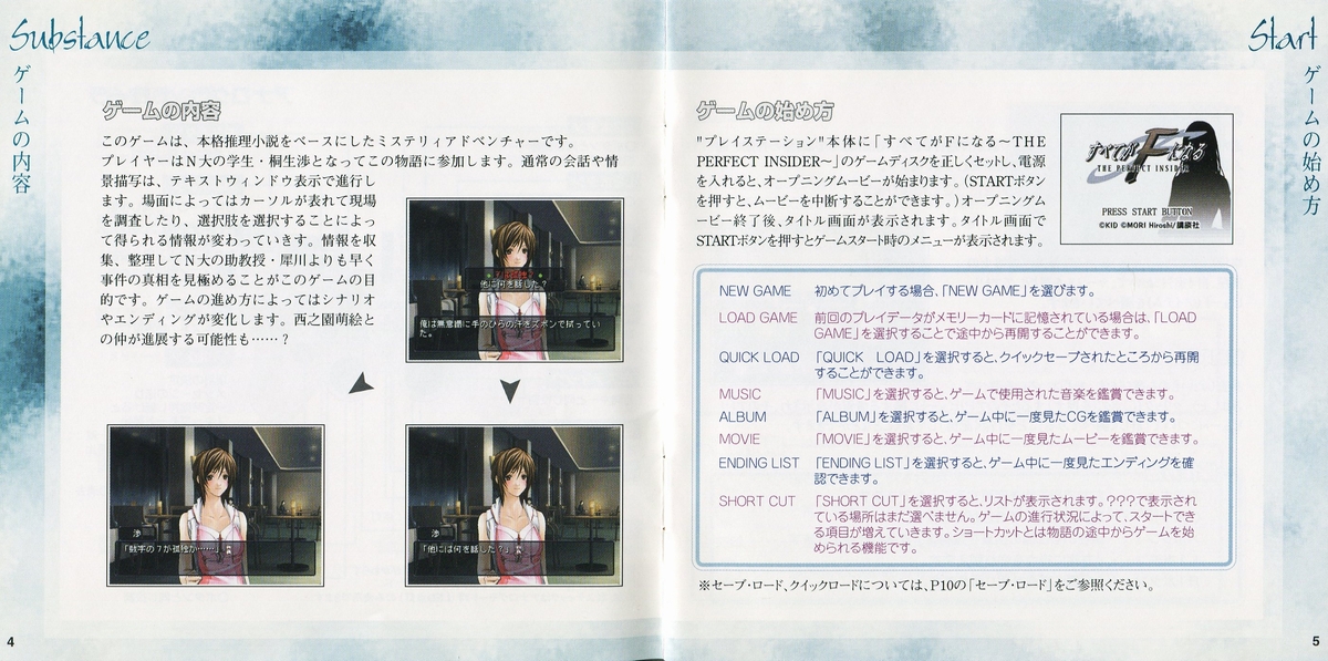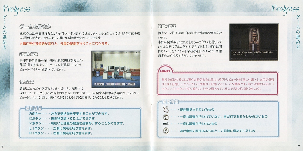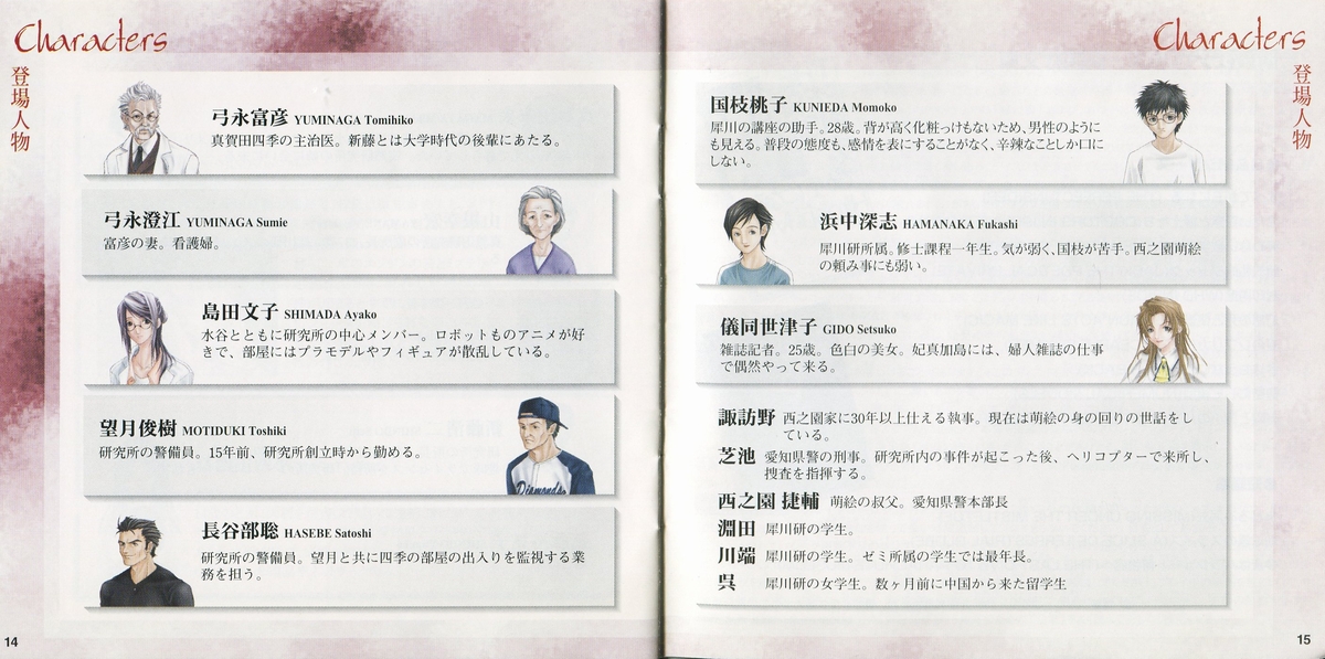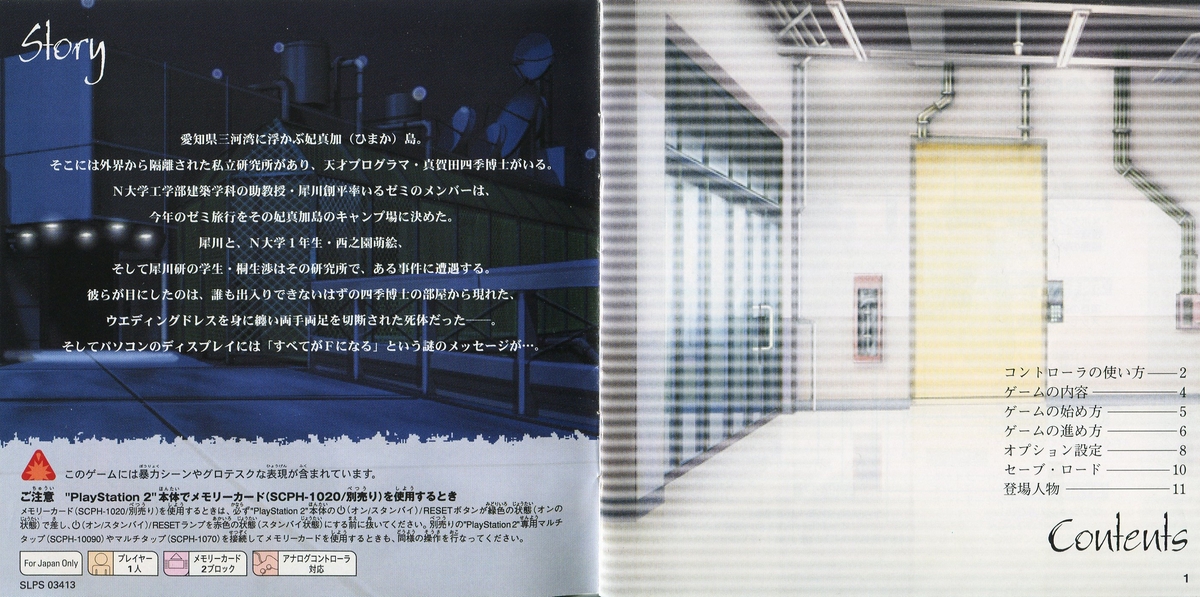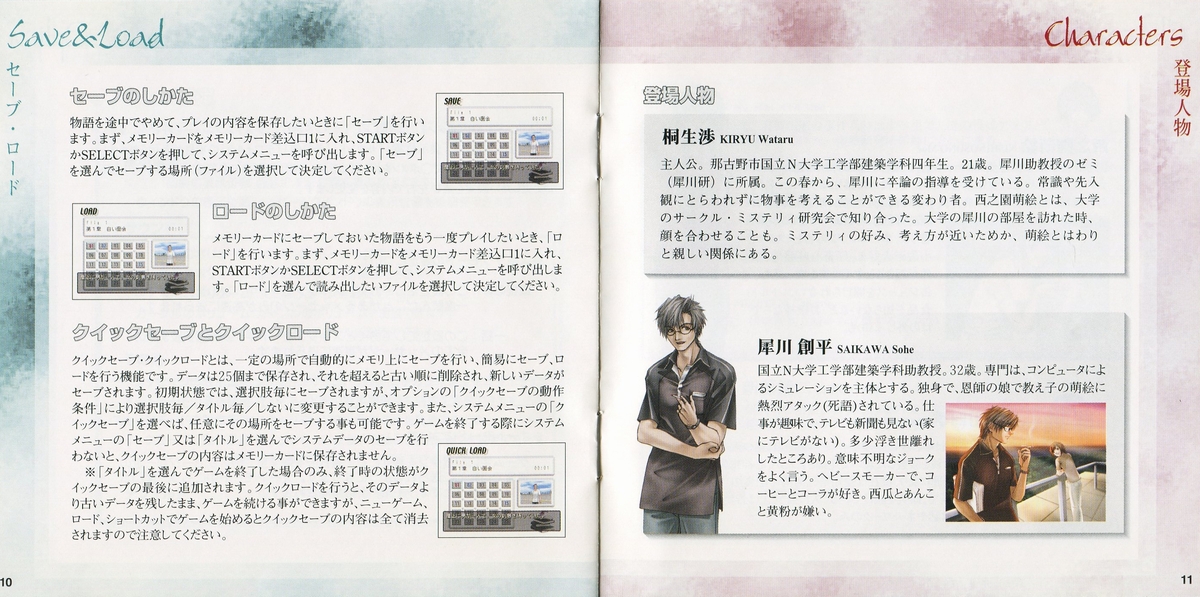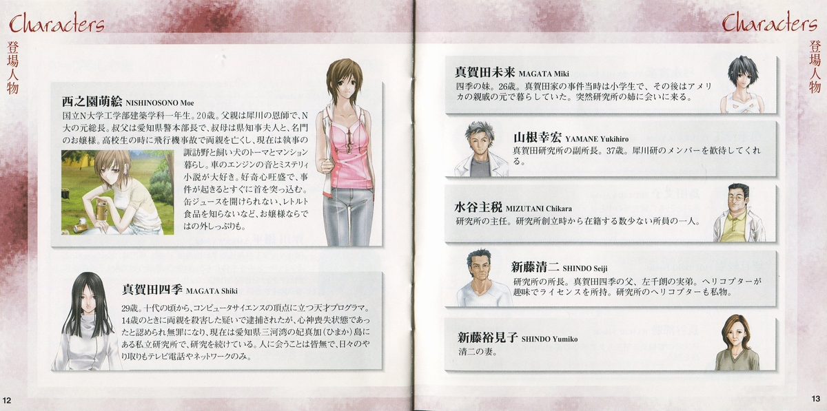 The player controls Seigawa Wataru a young fourth year university student in the faculty of engineering and architecture that his hobbies are the mystery novels. To help him solving this case he will have the help of Sanae Kobayashi (a first grader girl in the University Department of Architecture & Engineering) and Shigeru Shibuya (University Associate Professor, Faculty of Engineering, Architecture) and other characters.