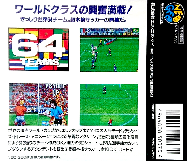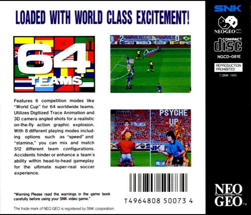Loaded with world class excitement! Features 6 competition modes like World Cup for 64 worldwide teams. Utilizes Digitized Trace Animation and 3D camera angled shots for a realistic on-the-fly action graphic explosion. With 8 different playing modes including options such as Speed and Stamina, you can mix and match 512 different team configurations. Accidents hinder or enhance a team's ability within head-to-head gameplay for the ultimate super-real soccer experience!