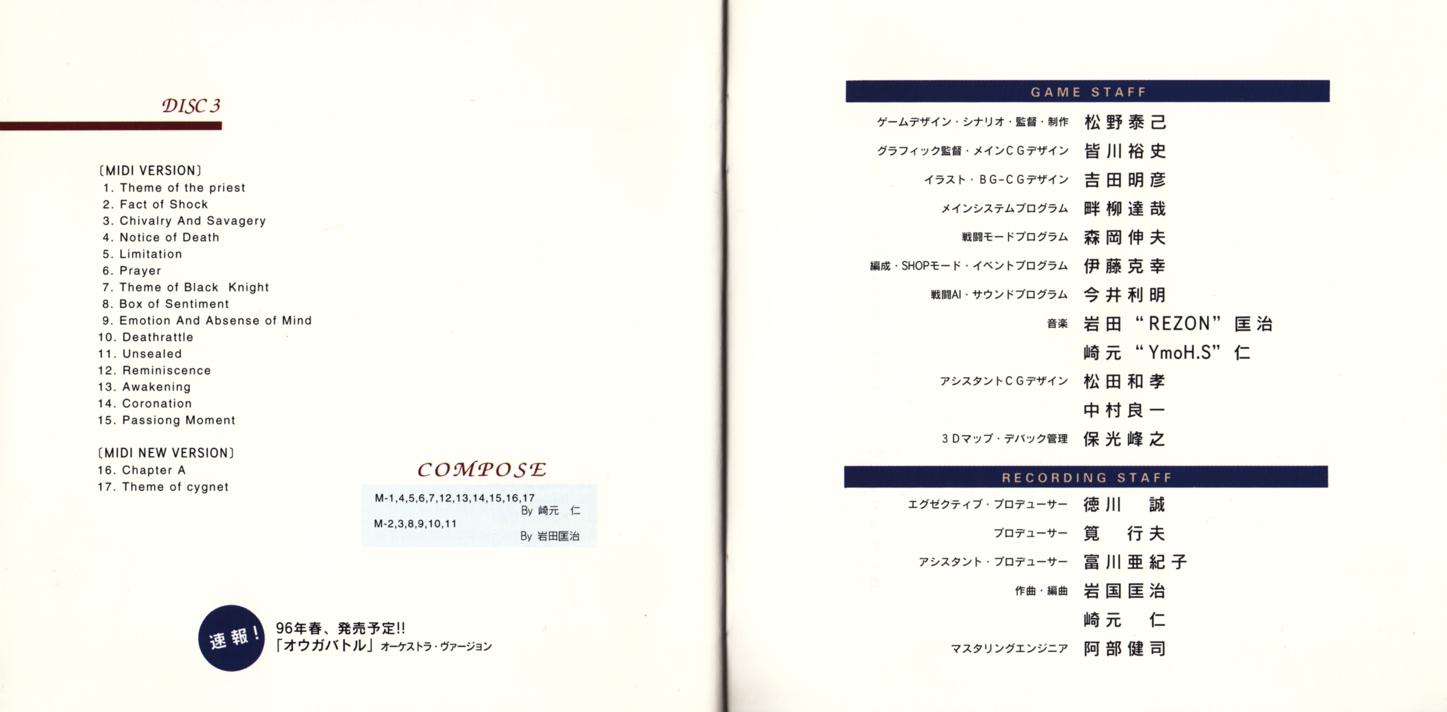 Liner Notes: Yasumi Matsuno (Quest), Hitoshi "YmoH.S" Sakimoto, Masaharu "Rezon" Iwata