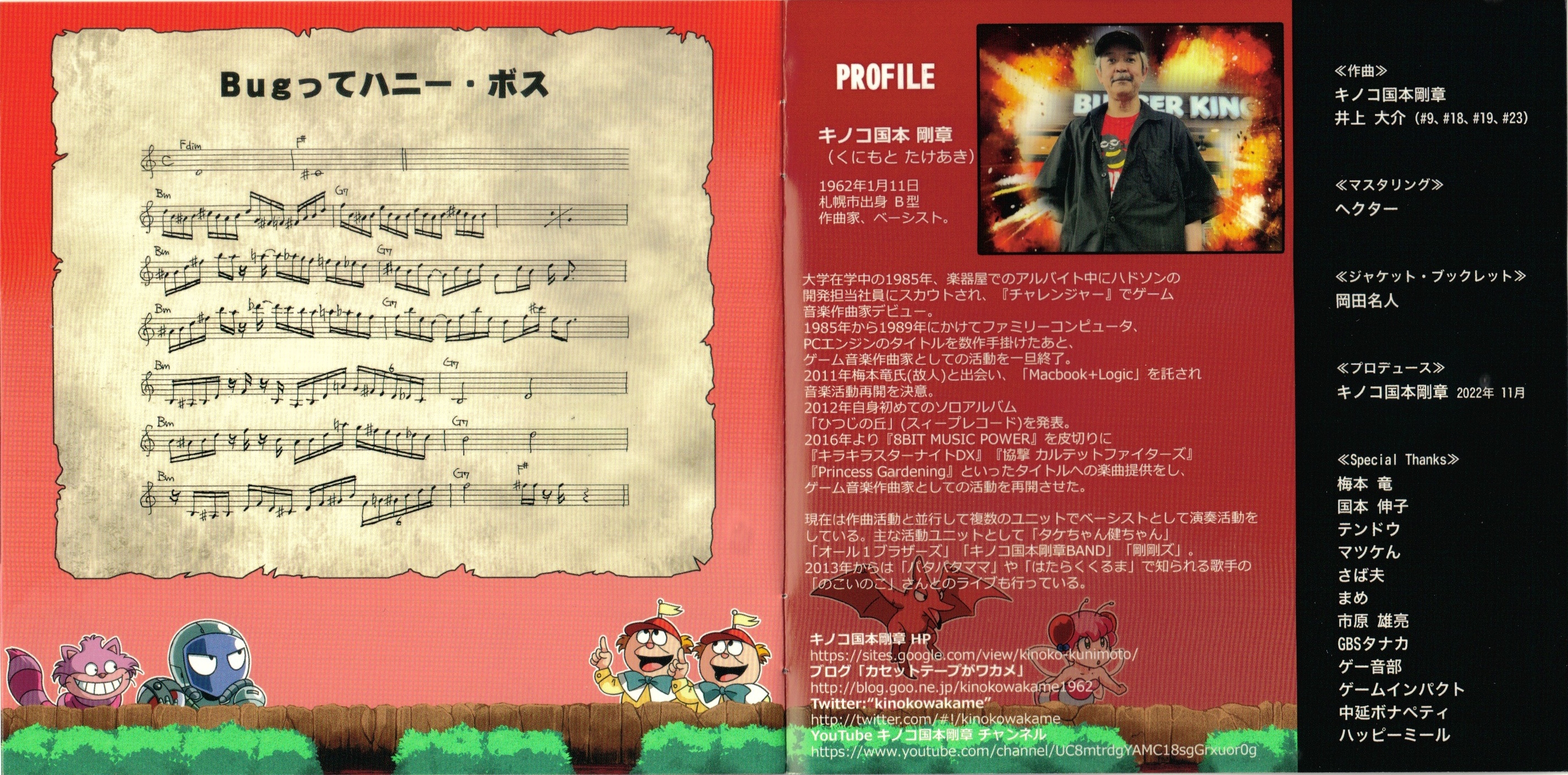 ハドソンのゲーム曲の作曲を多数されたキノコ国本さんによる、関わったファミコン・タイトル『ボンバーキング』『新人類』『ミッキーマウス不思議の国の大冒険』『Bugってハニー』『桃太郎伝説』BGMにまつわるアレンジ曲集。未発表音源多数収録。