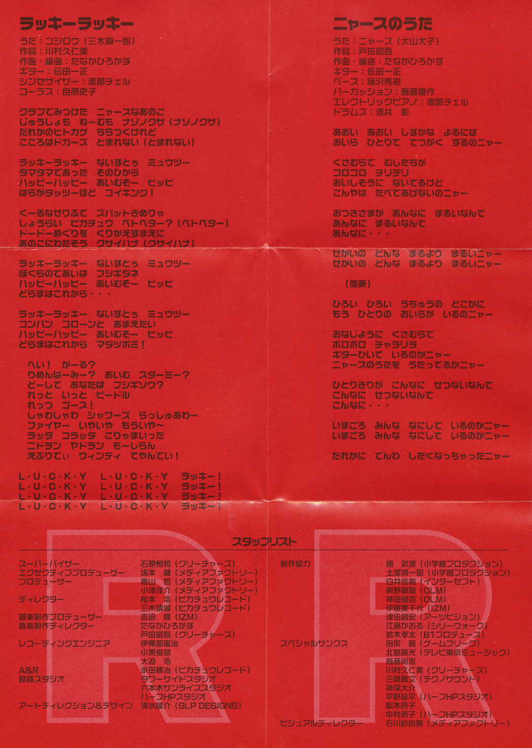 Special Thanks: Satoshi Tajiri (GAME FREAK), Hidemitsu Kitajima (TV TOKYO Music), Takeshi Shudo, Kunimi Kawamura (Creatures), Masafumi Mima (Techno Sound), Daisuke Jinbo, Nobuhira Hirano (HALF H·P STUDIO), Ryoko Nashimoto, Akiko Nakamura (HALF H·P STUDIO)