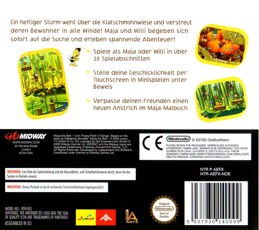 Mostly based on Maya the Honey Bee anime, The Bee Game (Die Biene Maja: Klatschmohnwiese in Gefahr) is a 2D platformer, released in the United States and Germany in 2007 for the Nintendo DS. Unlike the Game Boy Advance version, this version has mini-games, and different music.