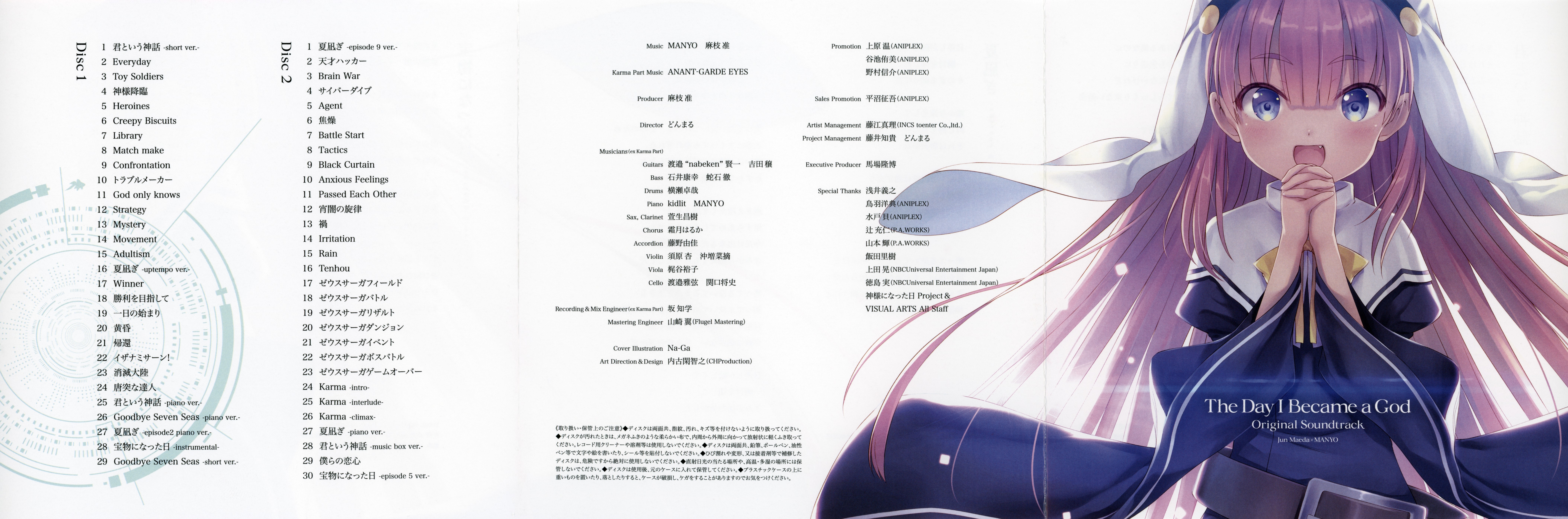 Special Thanks: Yoshiyuki Asai, Yousuke Toba (ANIPLEX), Kai Mito (ANIPLEX), Mitsuhito Tsuji (P.A.WORKS), 山本輝 (P.A.WORKS), Satoki Iida, Akira Ueda (NBCUniversal Entertainment Japan), Minoru Tokushima (NBCUniversal Entertainment Japan), "The Day I Became a God" Project & VISUAL ARTS All Staff