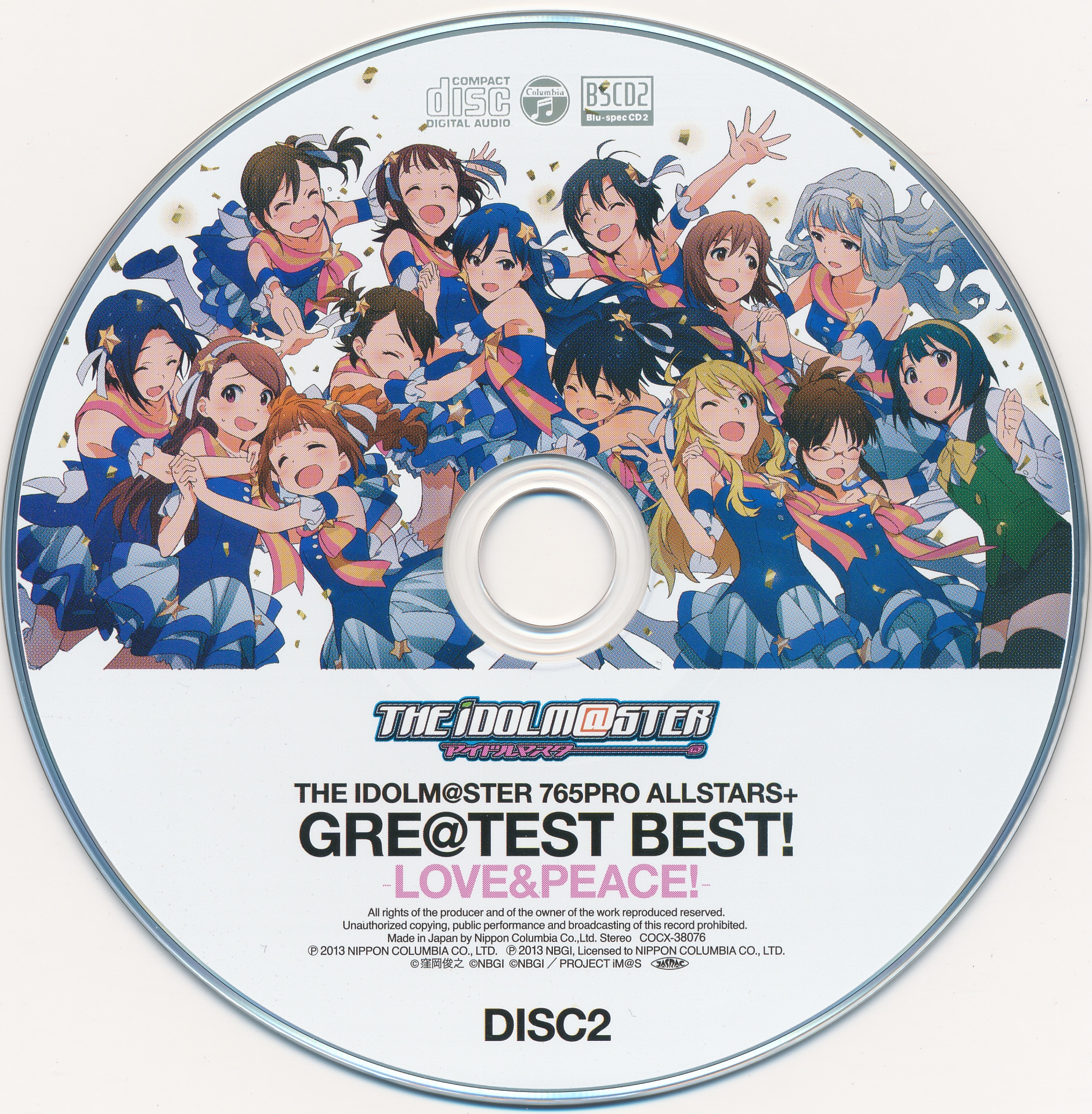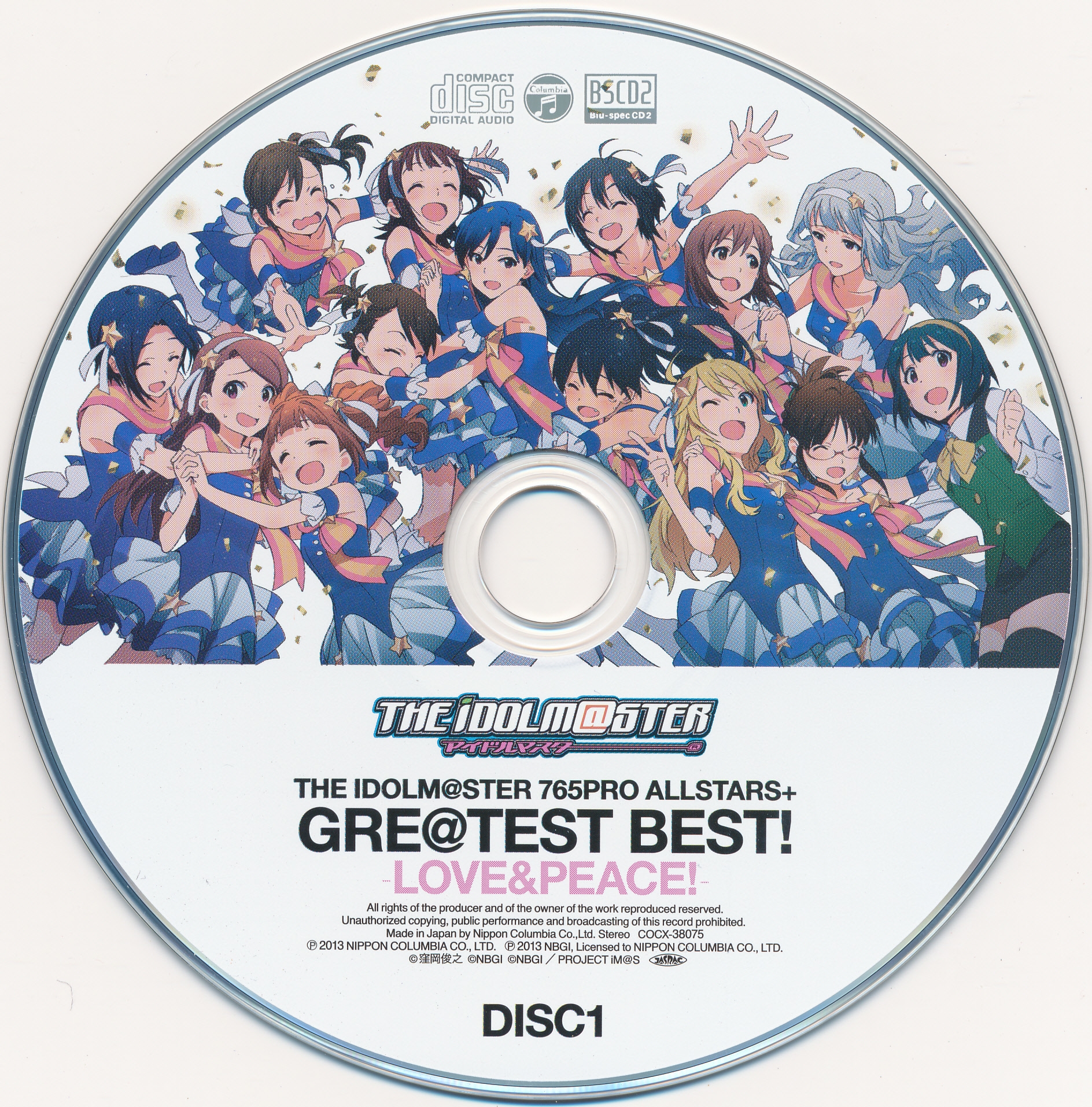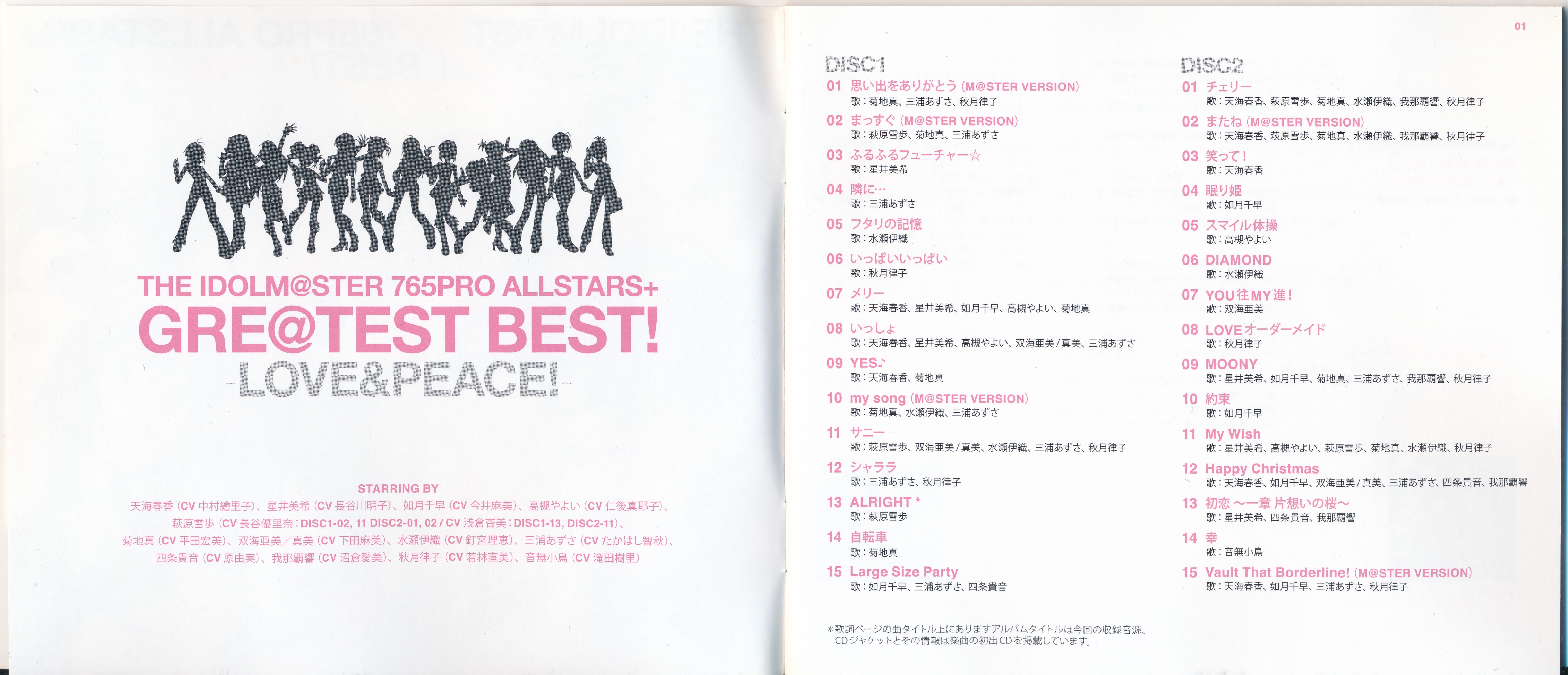 Haruka Amami (CV: Eriko Nakamura), Miki Hoshii (CV: Akiko Hasegawa), Chihaya Kisaragi (CV: Asami Imai), Yayoi Takatsuki (CV: Mayako Nigo), Yukiho Hagiwara (CV: Yurina Hase DISC1-02,11 DISC2-01,02 / CV: Azumi Asakura DISC1-13 DISC2-11), Makoto Kikuchi (CV: Hiromi Hirata), Ami/Mami Futami (CV: Asami Shimoda), Iori Minase (CV: Rie Kugimiya), Azusa Miura (CV: Chiaki Takahashi), Takane Shijou (CV: Yumi Hara), Hibiki Ganaha (CV: Manami Numakura), Ritsuko Akizuki (CV: Naomi Wakabayashi), Kotori Otonashi (CV: Juri Takita)