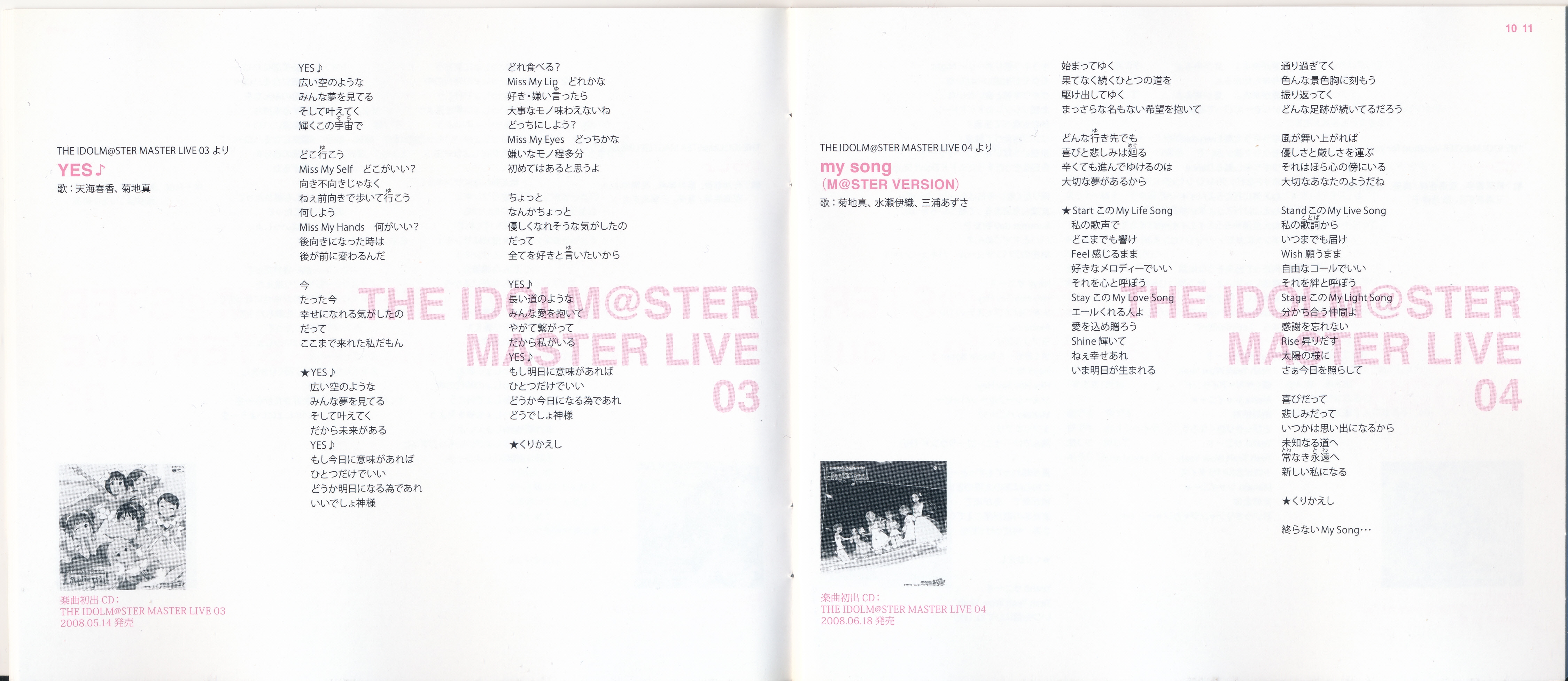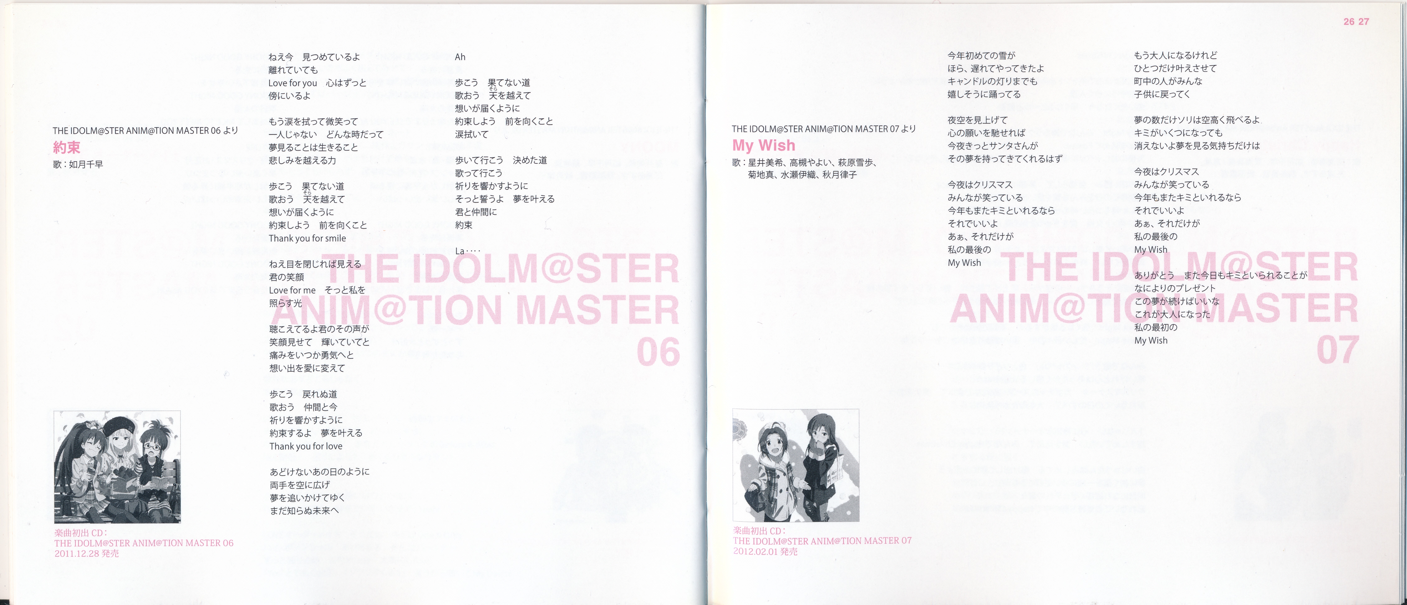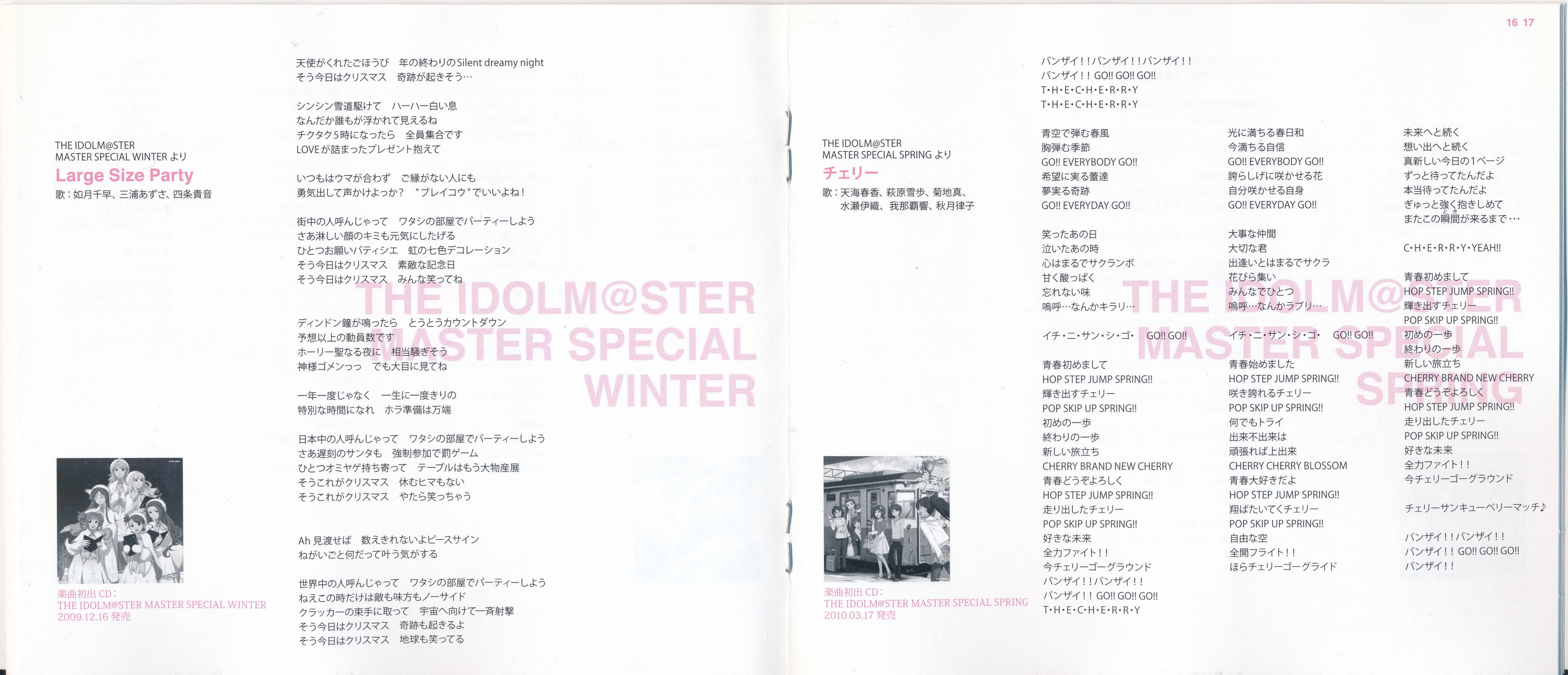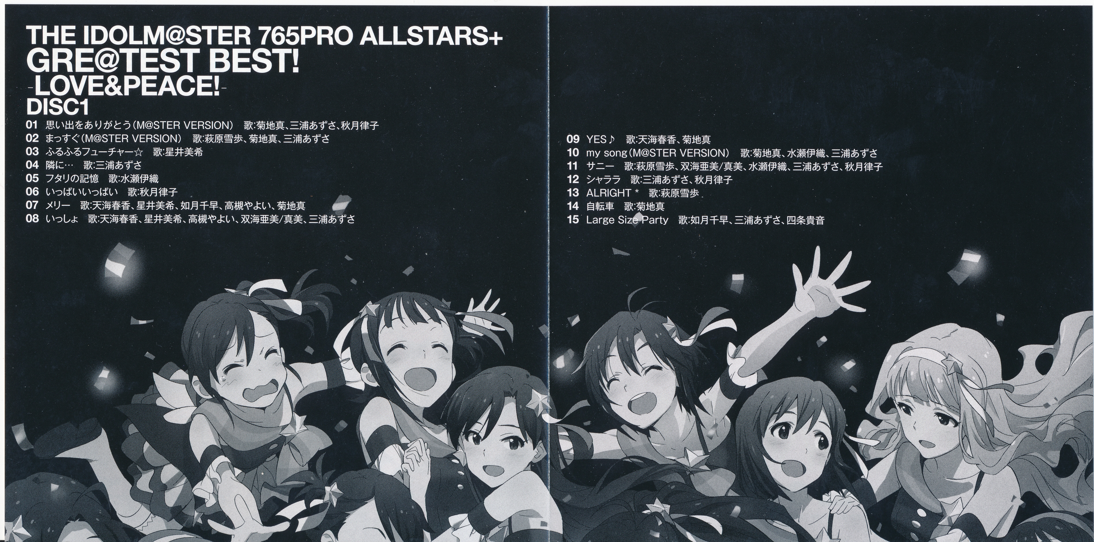 Vocals: Miki Hoshii (CV: Akiko Hasegawa), Yayoi Takatsuki (CV: Mayako Nigo), Yukiho Hagiwara (CV: Azumi Asakura), Makoto Kikuchi (CV: Hiromi Hirata), Iori Minase (CV: Rie Kugimiya), Ritsuko Akizuki (CV: Naomi Wakabayashi)