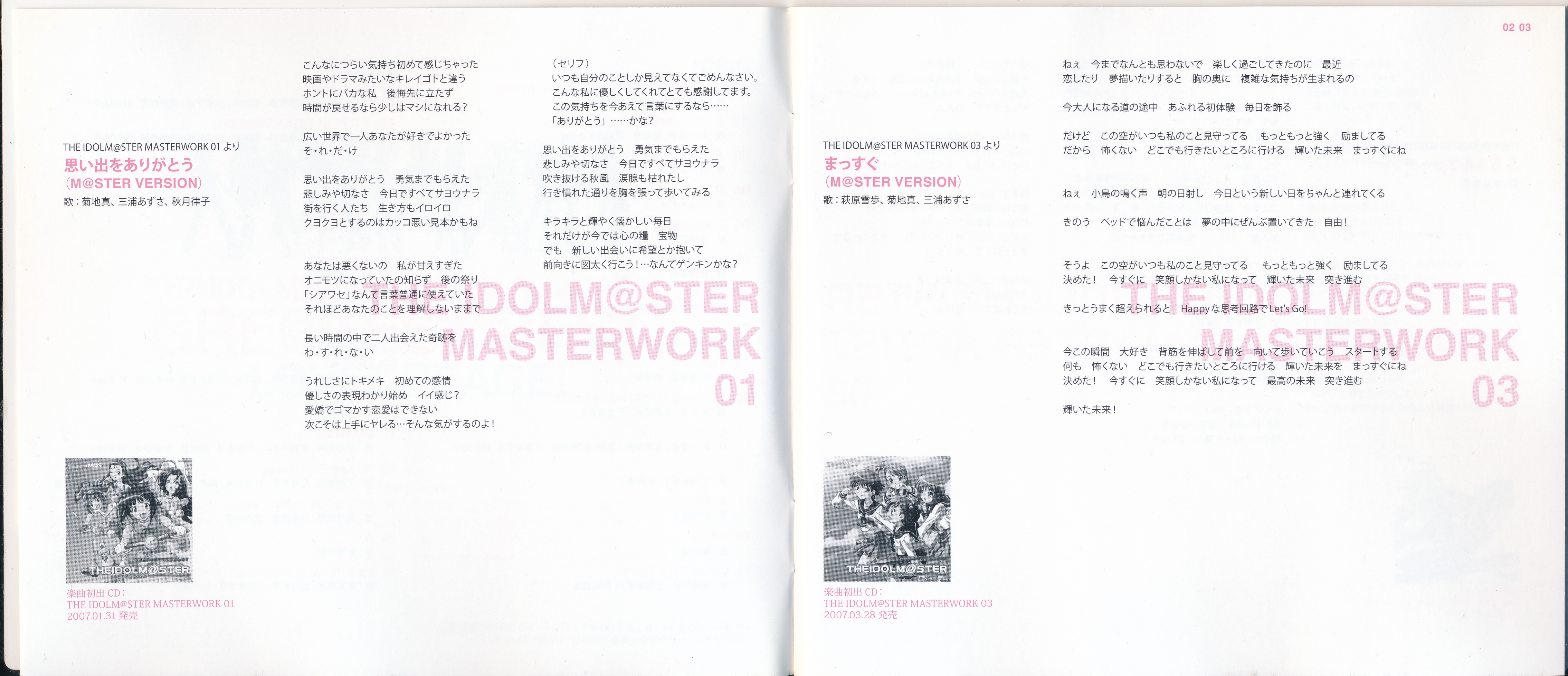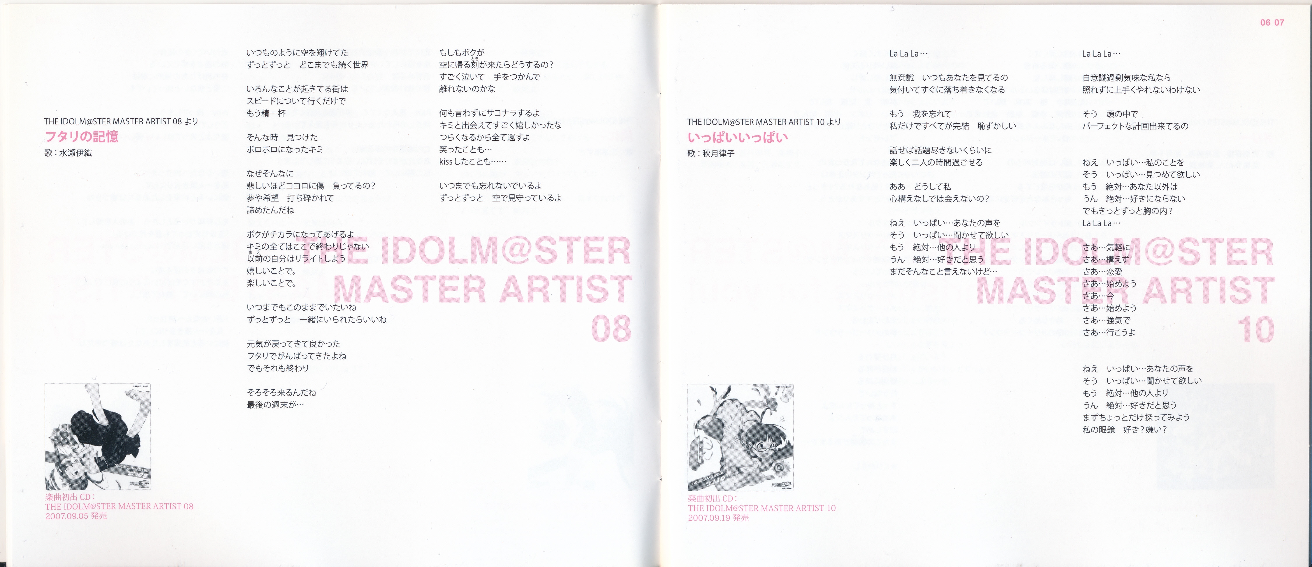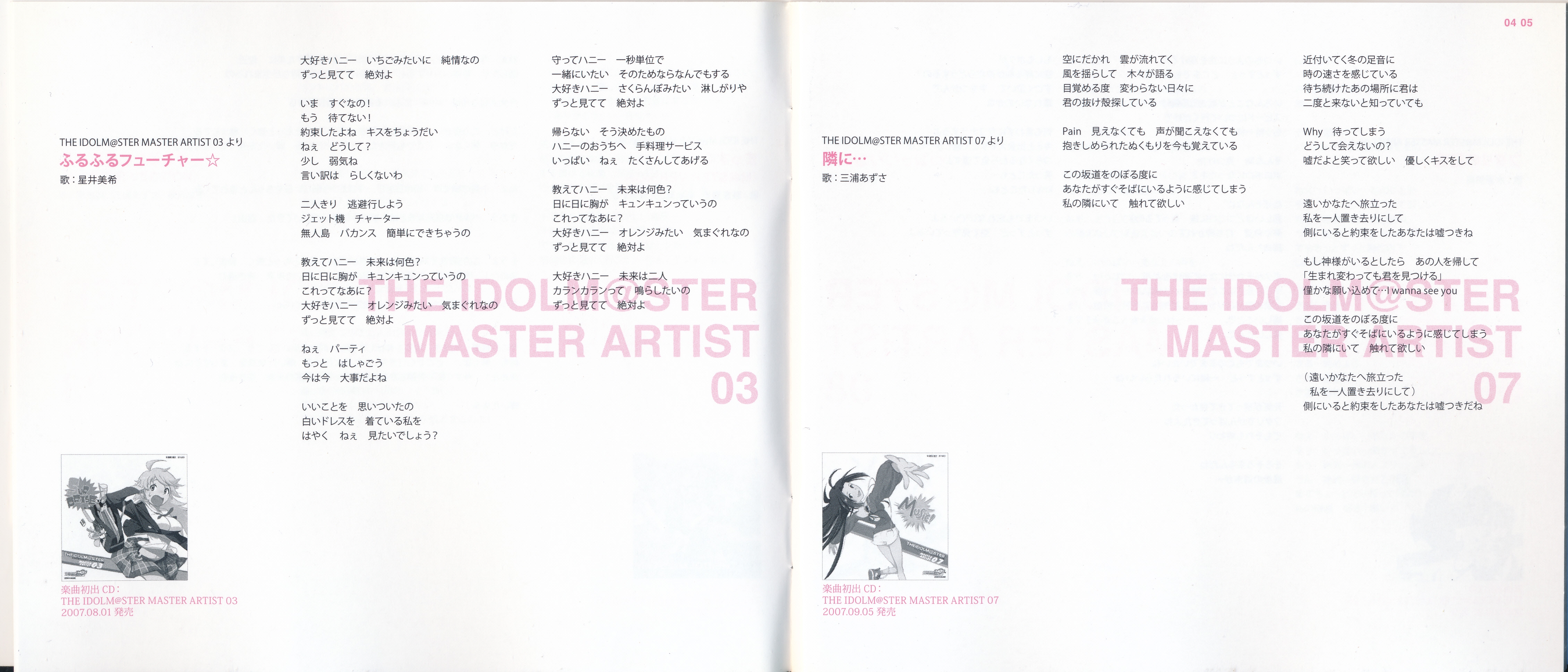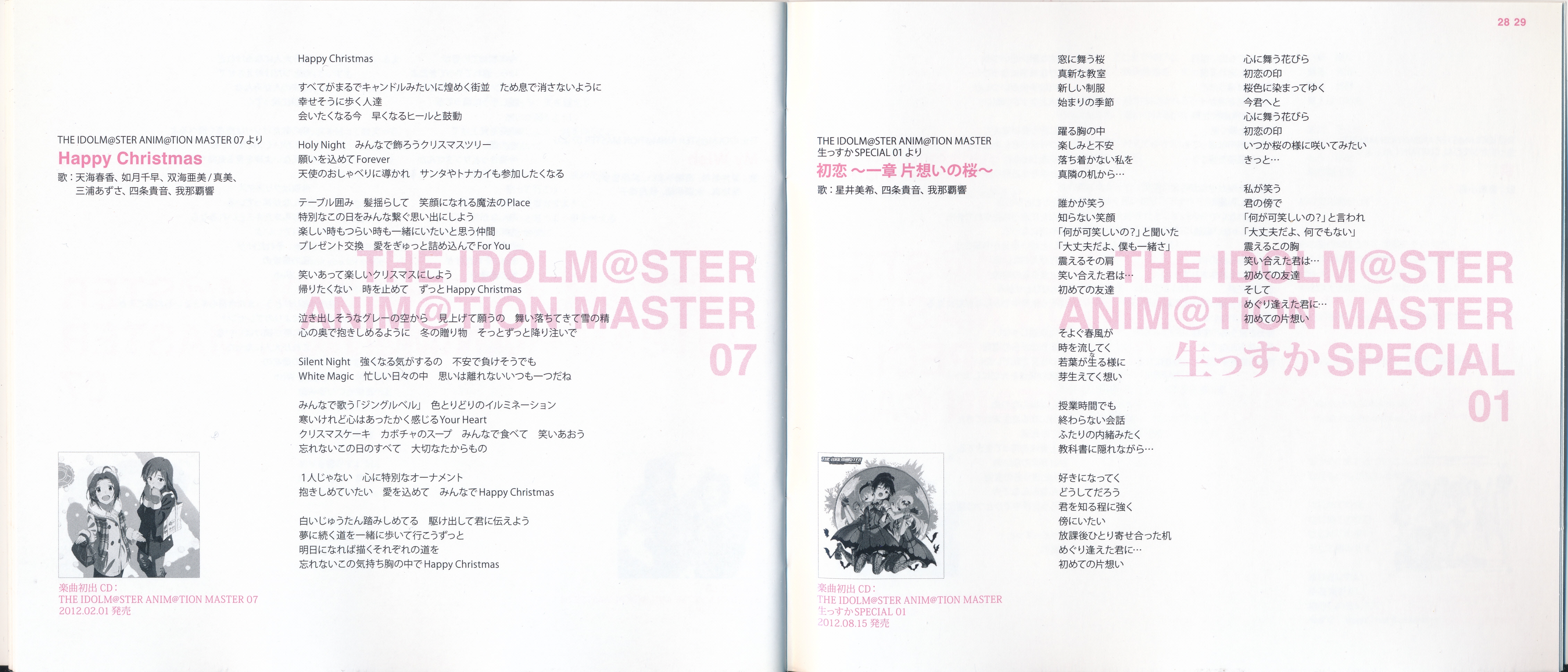 Vocals: Miki Hoshii (CV: Akiko Hasegawa), Yayoi Takatsuki (CV: Mayako Nigo), Yukiho Hagiwara (CV: Azumi Asakura), Makoto Kikuchi (CV: Hiromi Hirata), Iori Minase (CV: Rie Kugimiya), Ritsuko Akizuki (CV: Naomi Wakabayashi)