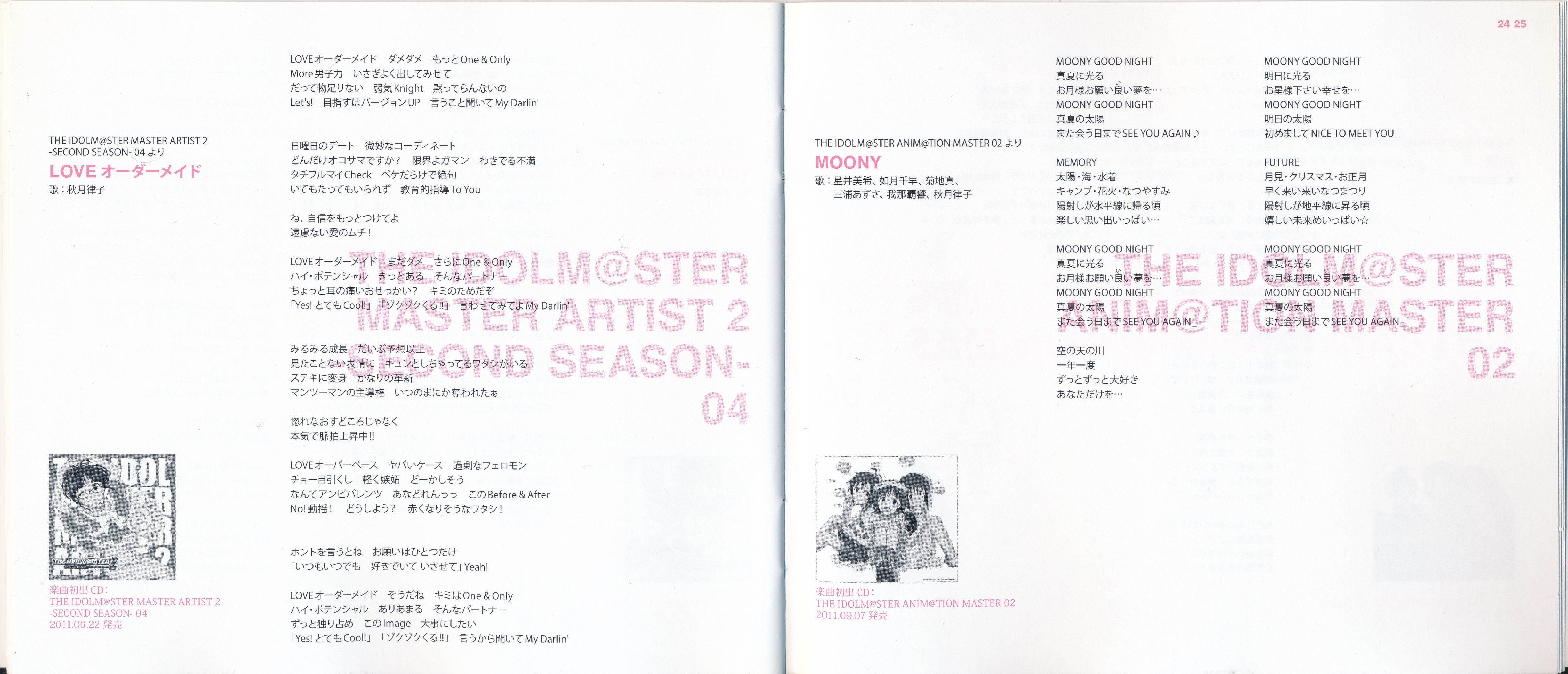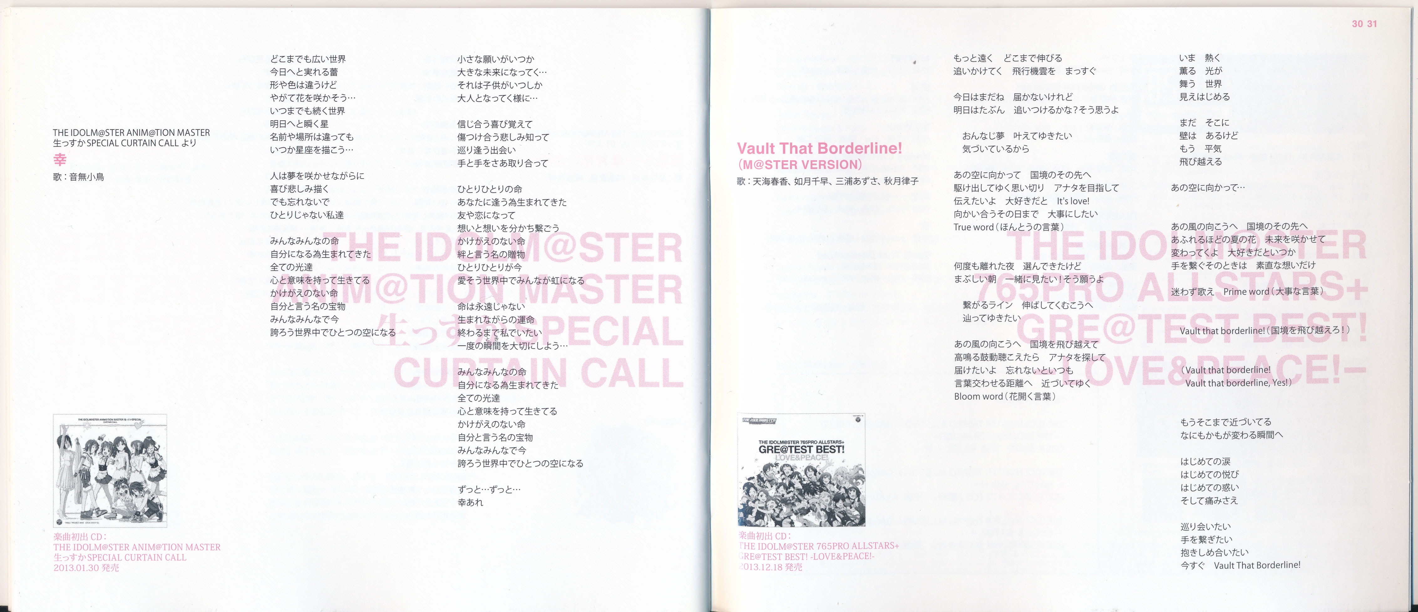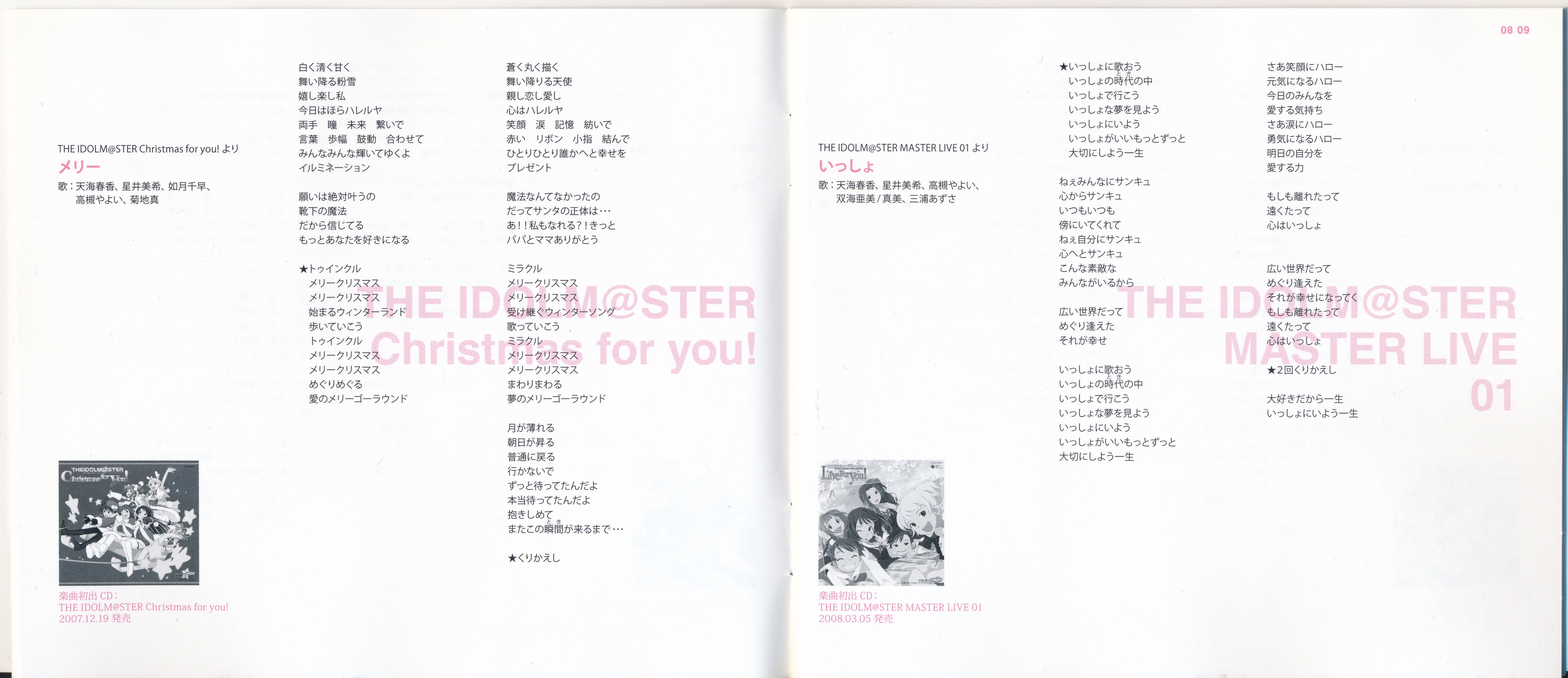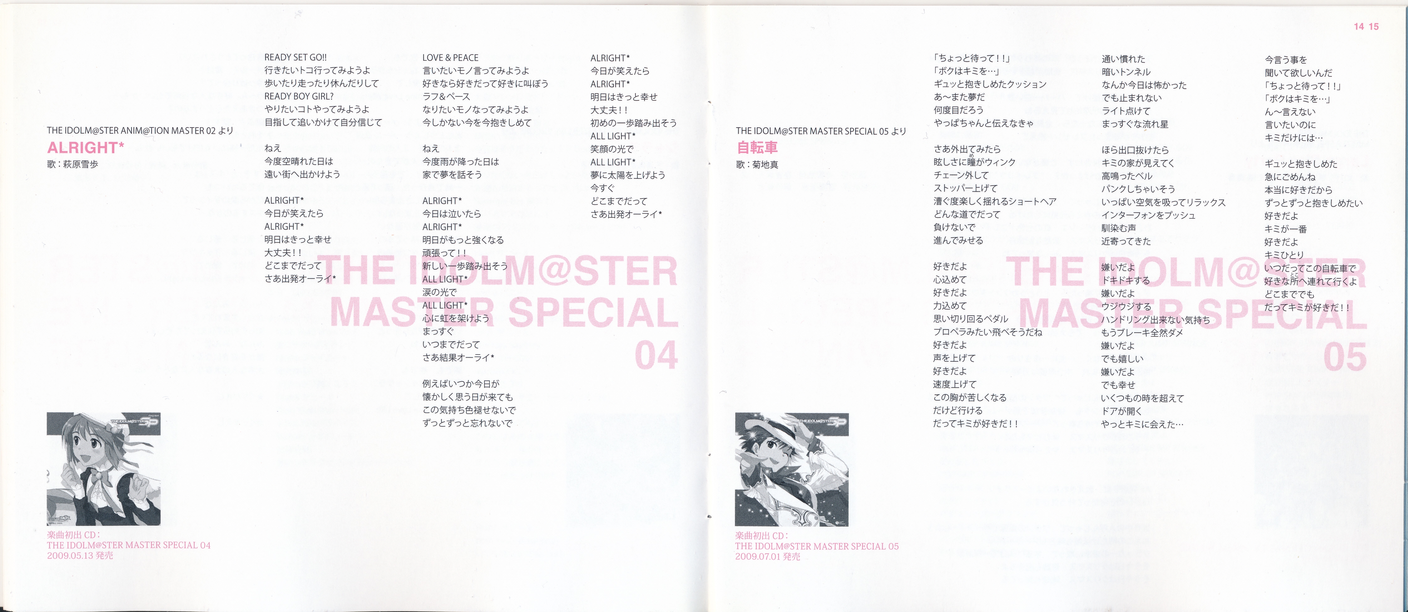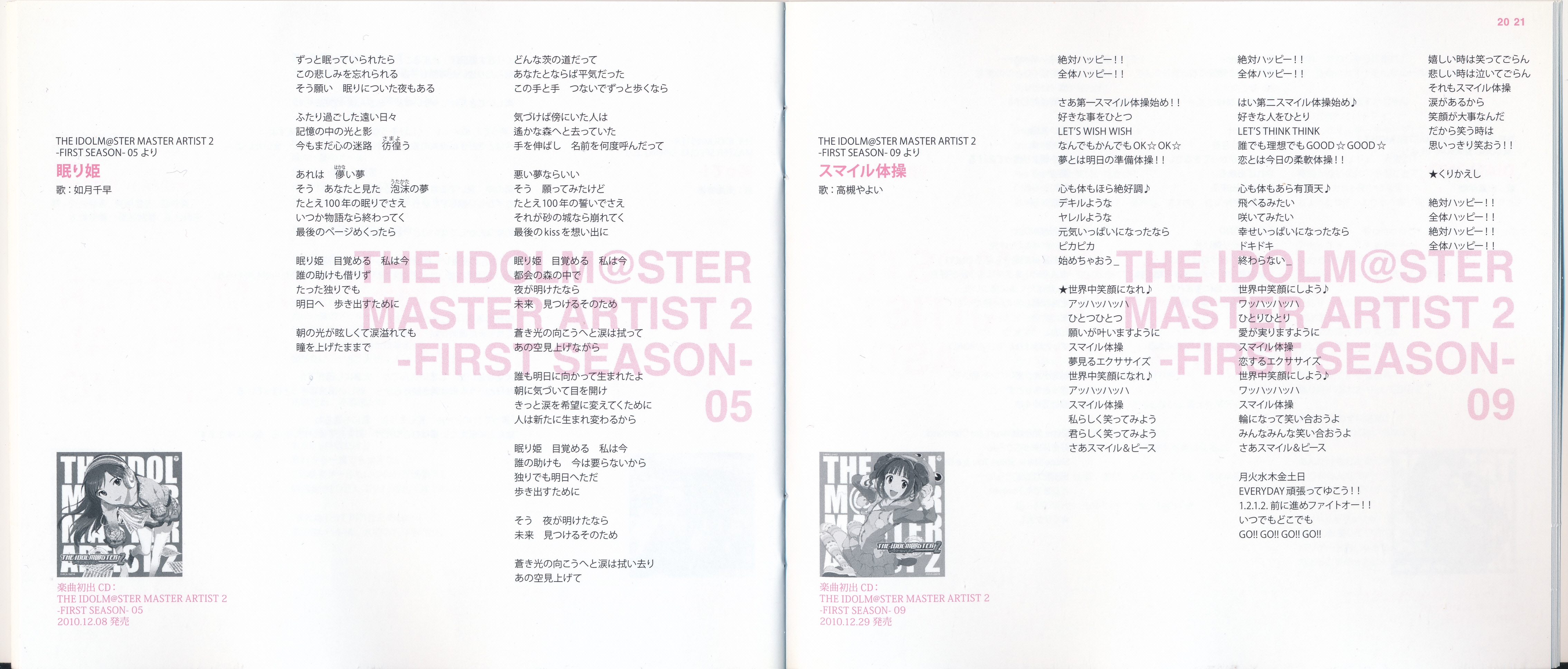 Vocals: Miki Hoshii (CV: Akiko Hasegawa), Yayoi Takatsuki (CV: Mayako Nigo), Yukiho Hagiwara (CV: Azumi Asakura), Makoto Kikuchi (CV: Hiromi Hirata), Iori Minase (CV: Rie Kugimiya), Ritsuko Akizuki (CV: Naomi Wakabayashi)