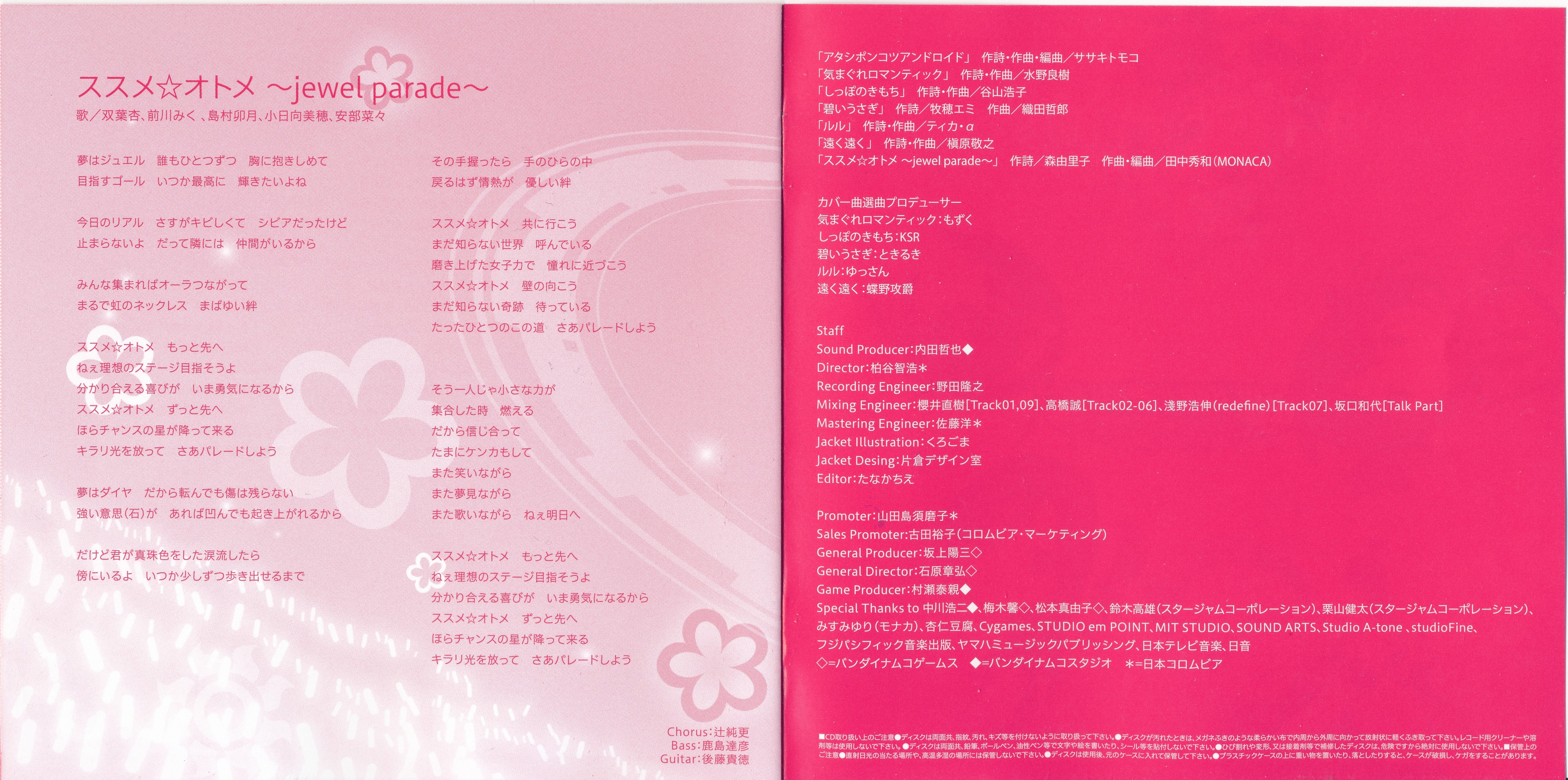 Special Thanks to Koji Nakagawa◆, Kei Umeki◇, Mayuko Matsumoto◇, Takao Suzuki (StarJam Corporation), Kenta Kuriyama (StarJam Corporation), Yuri Misumi (MONACA), Annindofu, Cygames, STUDIO em POINT, MIT STUDIO, SOUND ARTS, Studio A-tone, studioFine, FUJIPACIFIC MUSIC, Yamaha Music Publishing, Nippon Television Music, NICHION