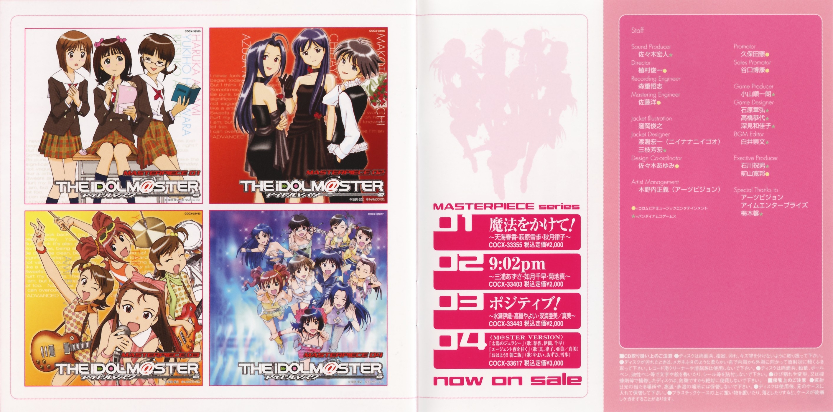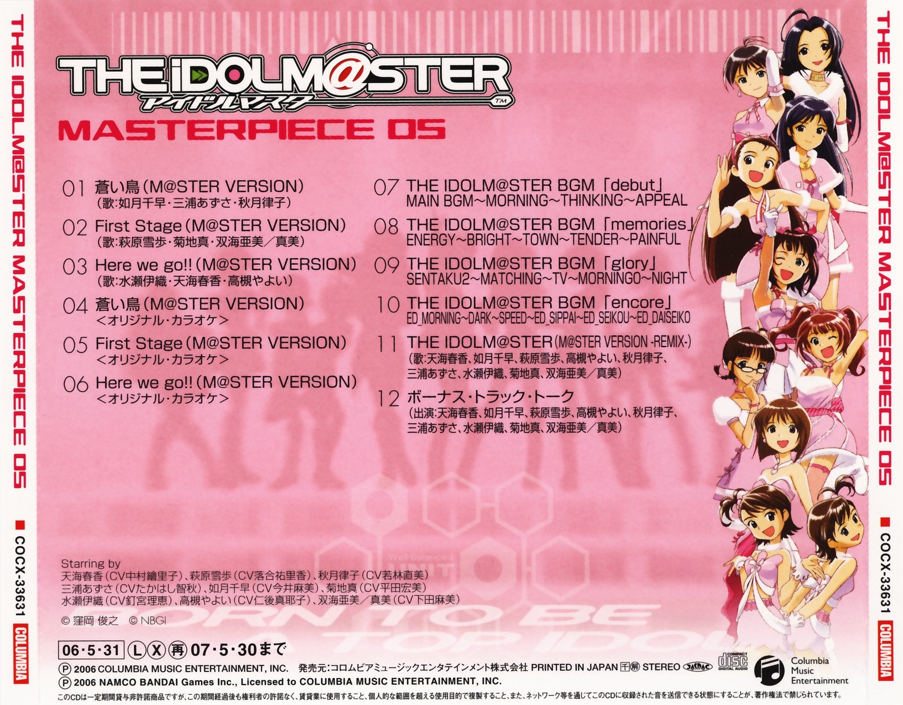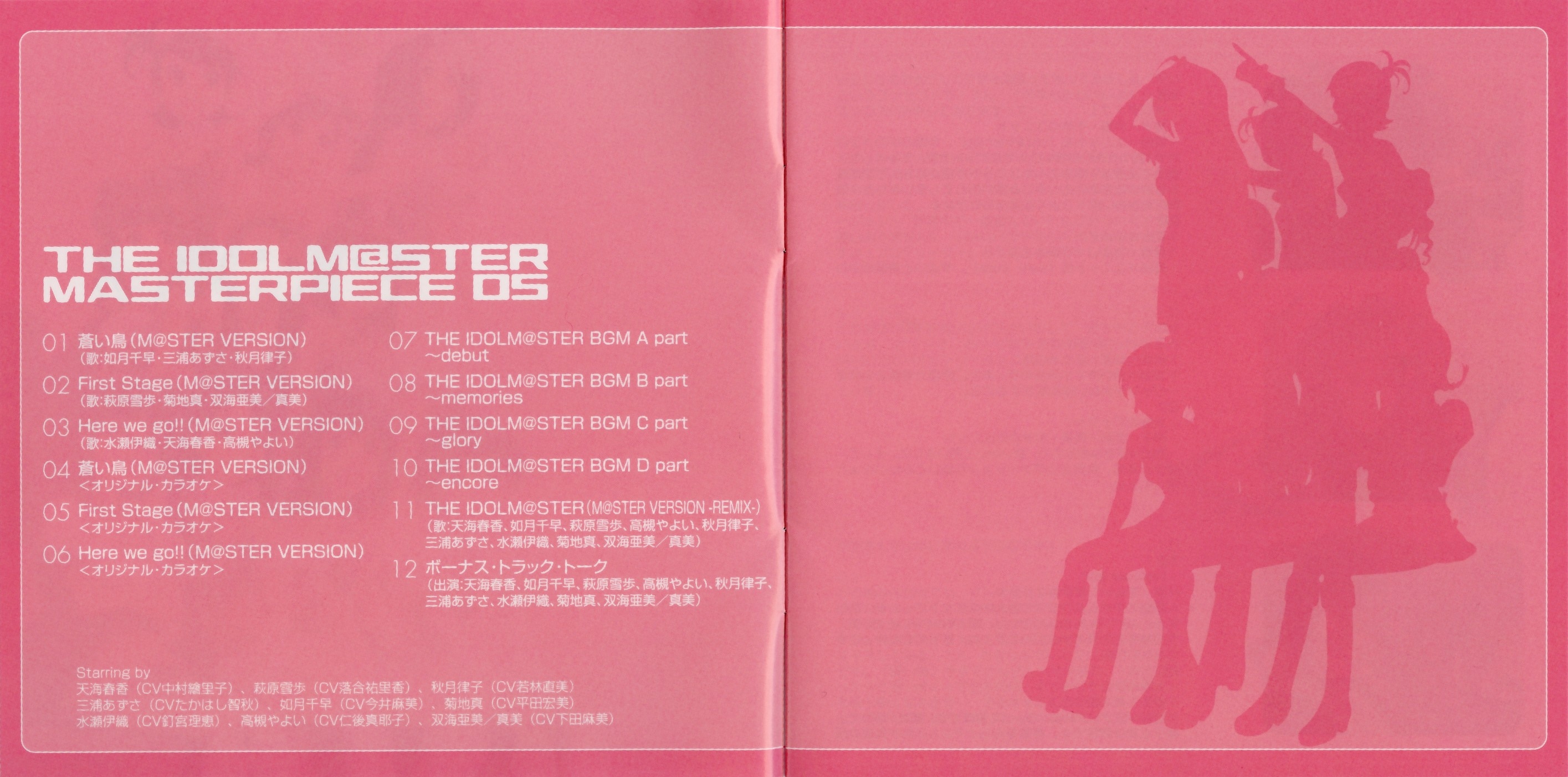 Vocals: Haruka Amami (CV: Eriko Nakamura), Chihaya Kisaragi (CV: Asami Imai), Yukiho Hagiwara (CV: Yurika Ochiai), Yayoi Takatsuki (CV: Mayako Nigo), Ritsuko Akizuki (CV: Naomi Wakabayashi), Azusa Miura (CV: Chiaki Takahashi), Iori Minase (CV: Rie Kugimiya), Makoto Kikuchi (CV: Hiromi Hirata), Ami/Mami Futami (CV: Asami Shimoda)