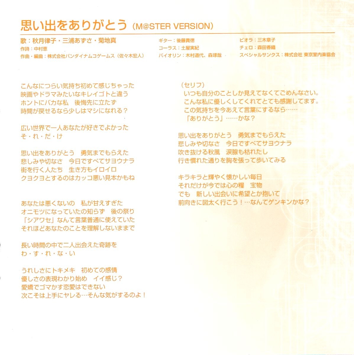 Vocals: Ritsuko Akizuki (CV: Naomi Wakabayashi), Azusa Miura (CV: Chiaki Takahashi), Makoto Kikuchi (CV: Hiromi Hirata)