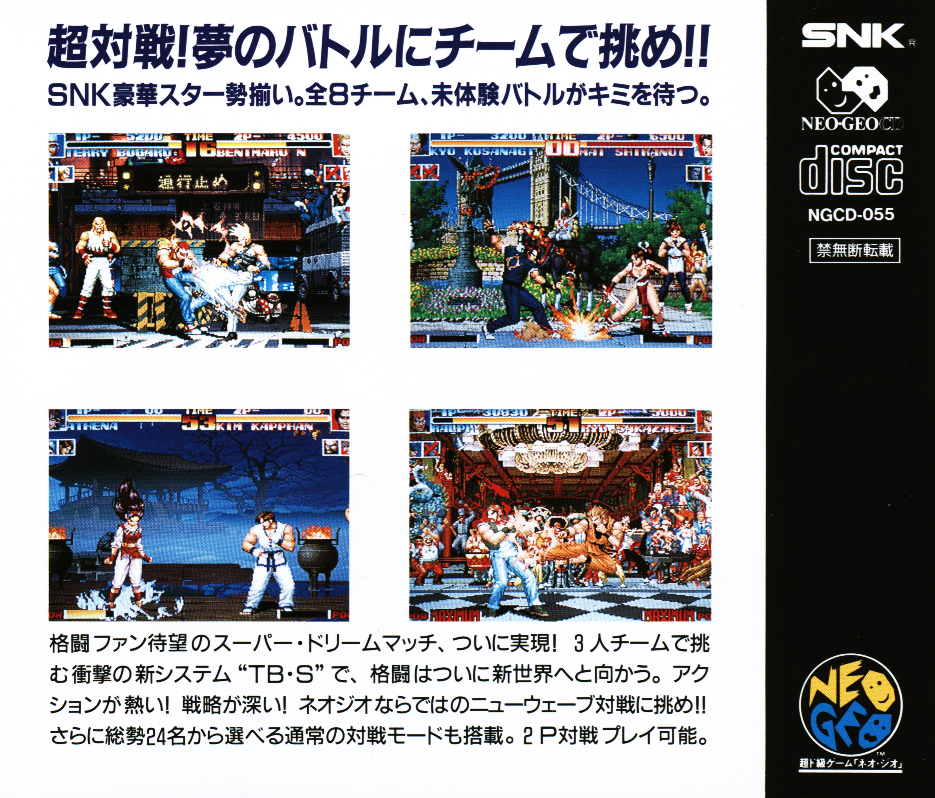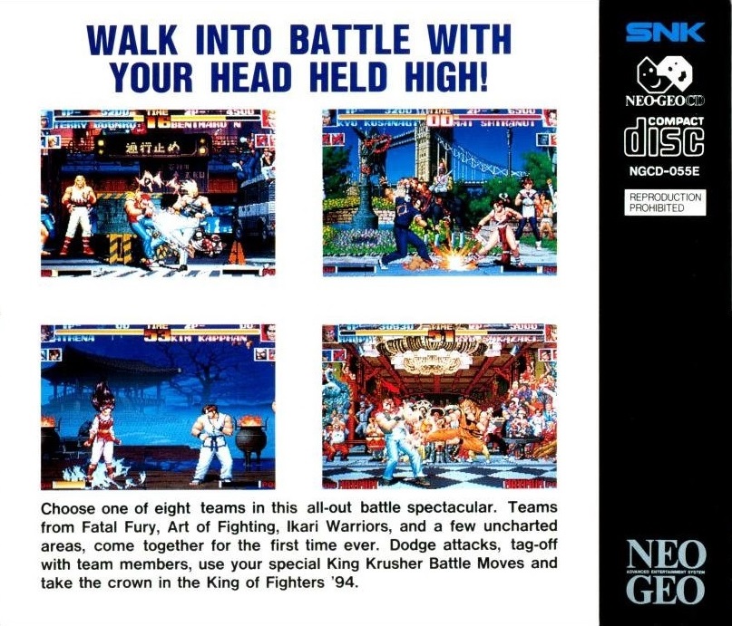 Walk into battle with your head held high! In The King of Fighters, you'll never fight alone! Choose one of eight teams in this all-out battle spectacular. Teams from Fatal Fury, Art of Fighting, Ikari Warriors, and a few uncharted areas come together for the first time ever. Dodge attacks, tag-off with team members, use your special King Krusher Battle Moves and take the crown in The King of Fighters '94!