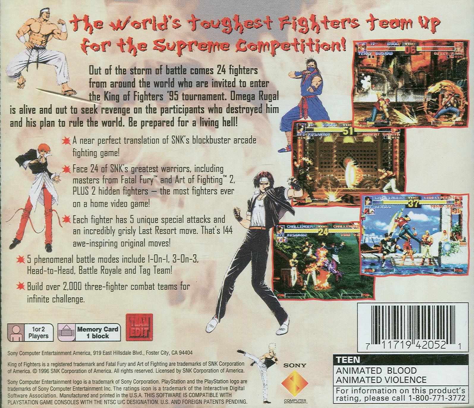 Out of the storm of battle comes 24 fighters from around the world who are invited to enter the King of FIghters '95 tournament. Omega Rugal is alive and out to seek revenge on the participants who destroyed him and his plan to rule the world. Be prepared for a living hell!
