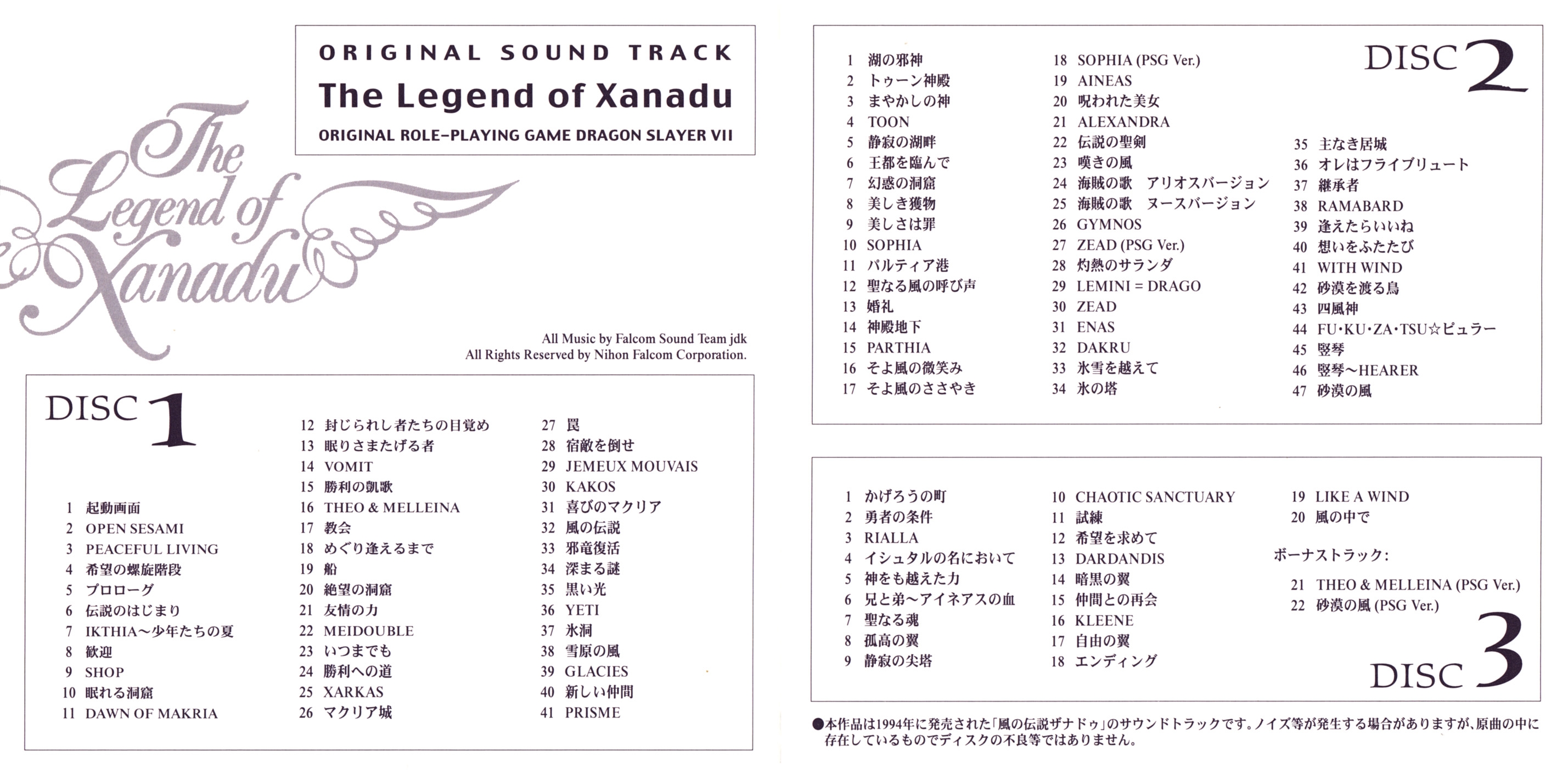 All Music by Falcom Sound Team J.D.K. (Mieko Ishikawa, Atsushi Shirakawa, Naoki Kaneda, Takahiro Tsunashima, Masaru Nakajima, Hirofumi Matsuoka)