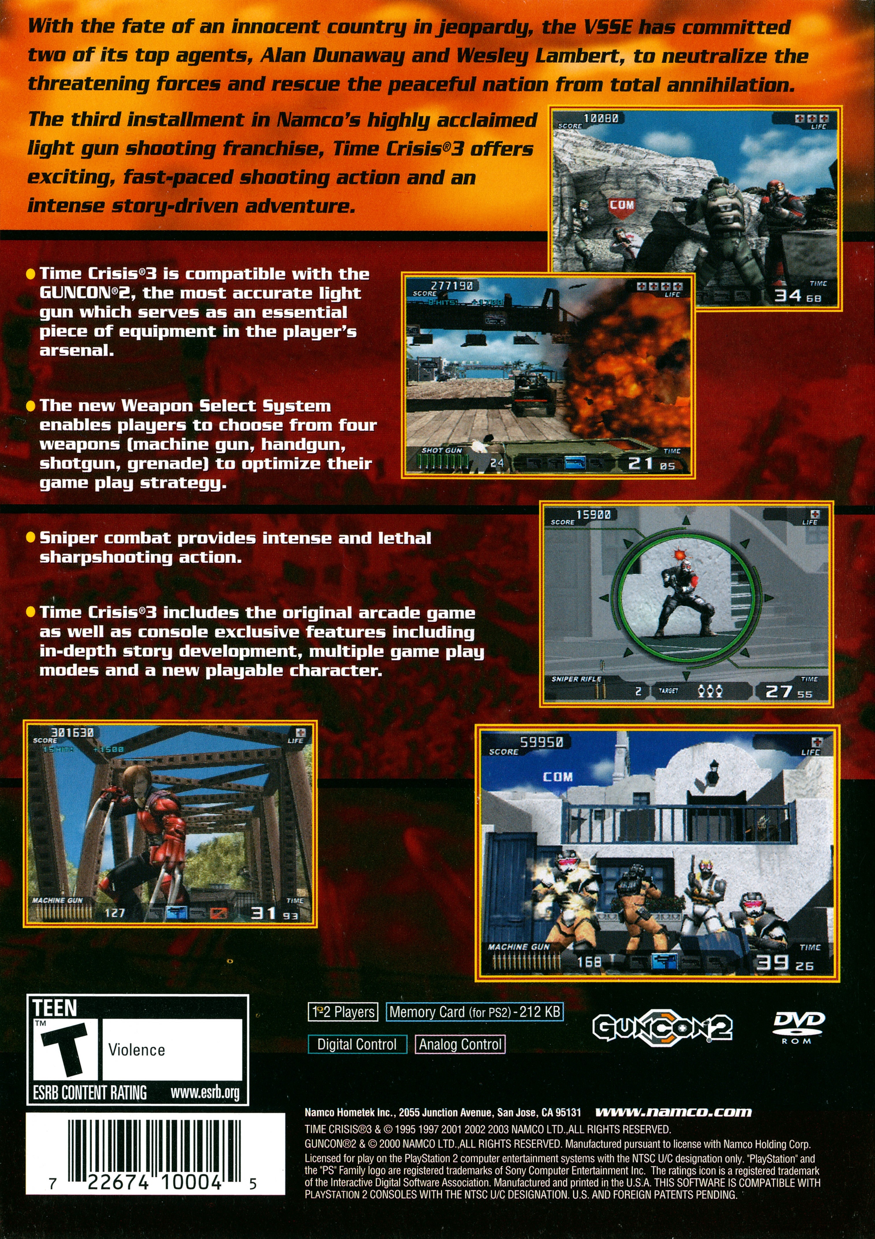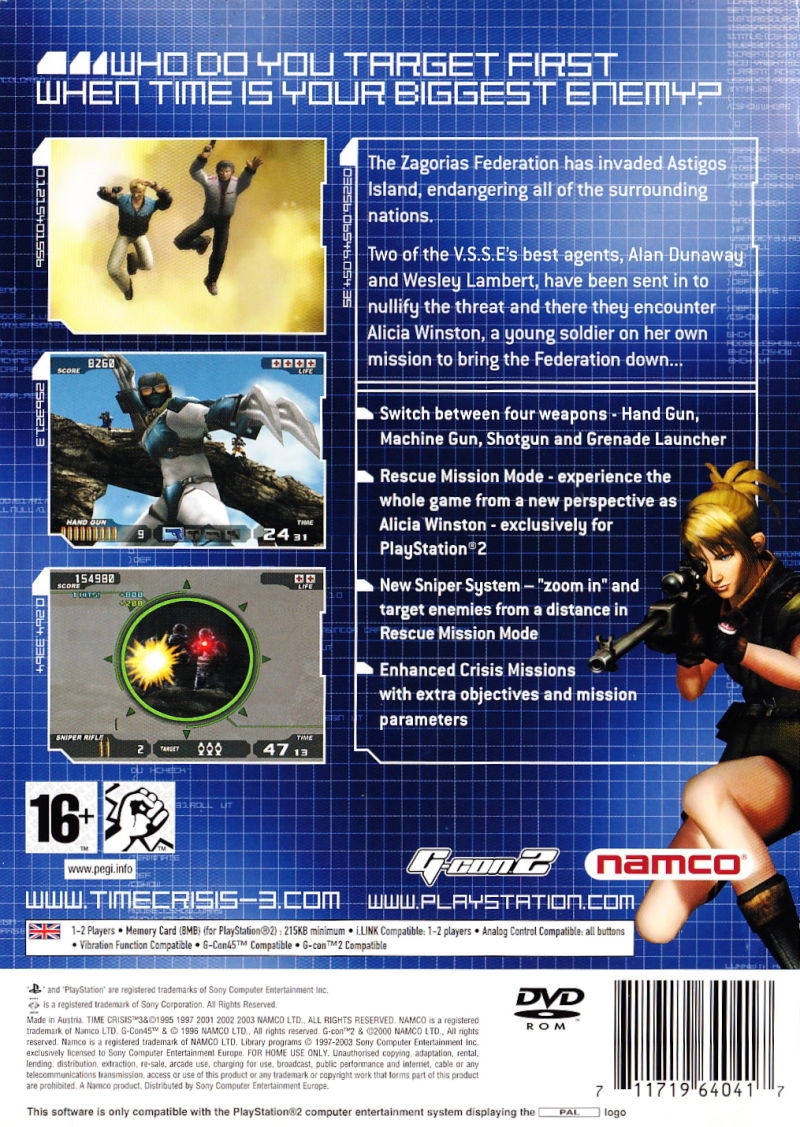 Time Crisis 3 (タイムクライシス3スリー Taimu Kuraishisu Surī?) is the third installment from the main Time Crisis series. The game stars VSSE agents Alan Dunaway and Wesley Lambert as they are sent to the island of Lukano. The neighboring Zagorias Federation, led by the ruthless General Giorgio Zott, has launched an unprovoked invasion of Lukano's territory, Astigos Island. The pair of agents work through enemy forces in order to put an end to the invasion.