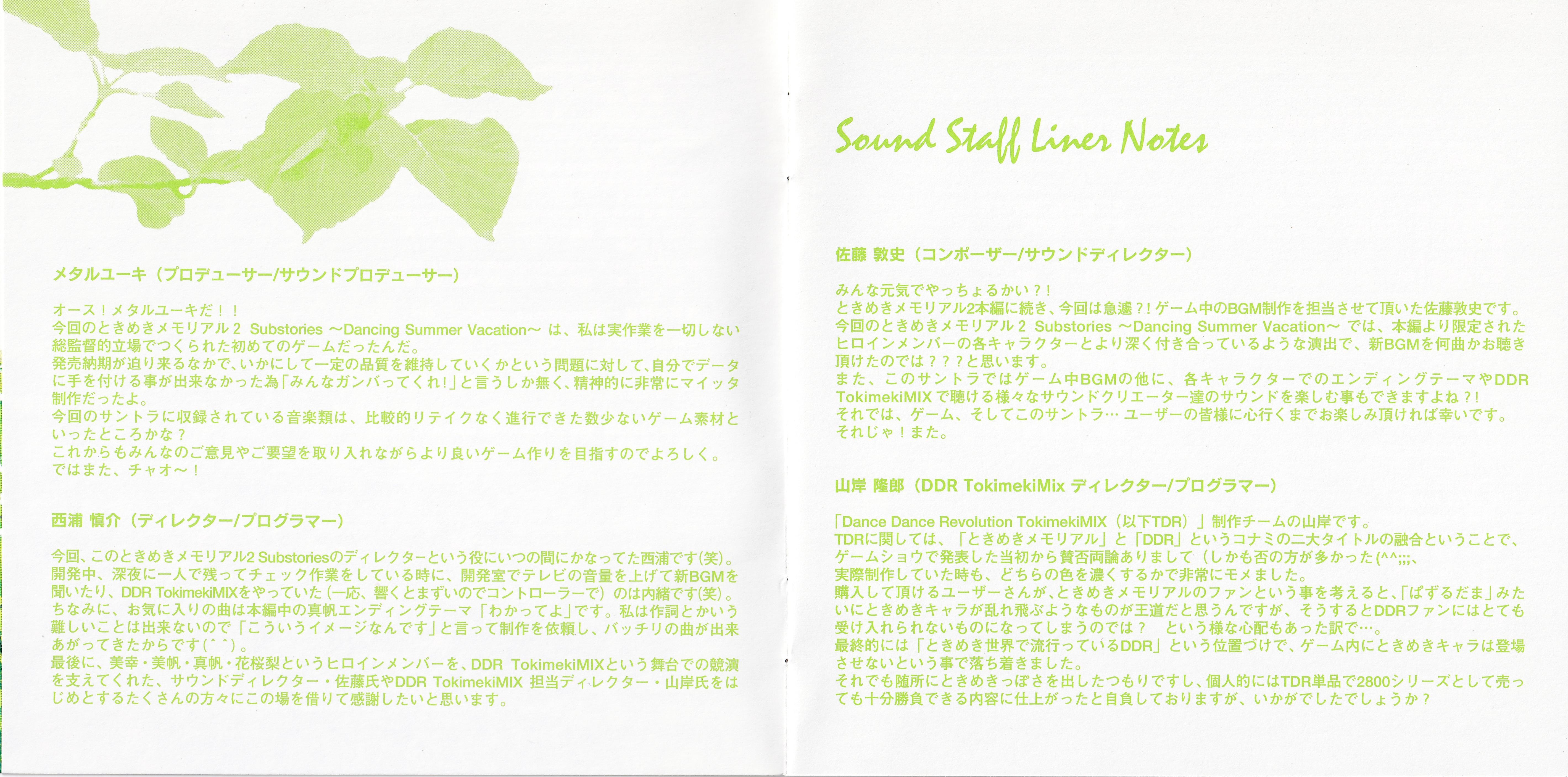 Sound Staff Liner Notes: Metal Yuhki (Producer/Sound Producer) (pg. 3), 西浦慎介 (Director/Programmer) (pg. 3), Atsushi Sato (Composer/Sound Director) (pg. 4), 山岸隆郎 (DDR TokimekiMix Director/Programmer) (pg. 4)