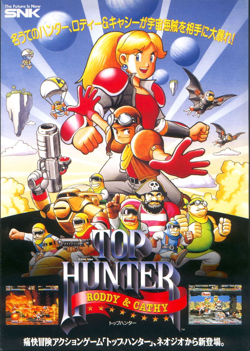 The gameplay style is similar to and inspired by Double Dragon, The Combatribes, Joe & Mac and Spinmaster. The player, as Roddy (the second player plays as Cathy), must navigate through the area, collecting items, killing enemies, and defeating a boss at the end of each stage. The characters can also execute special moves, done by moving the joystick in certain directions and pressing the attack button, similar to Street Fighter and The King of Fighters fame. Similar to Fatal Fury, Top Hunter features a plane-jumping system: the game field is divided in two lanes between the background and foreground, which the player can jump between at any time to attack enemies or avoid traps. The two fields are not always at the same elevation and one of them may be blocked off at certain points.