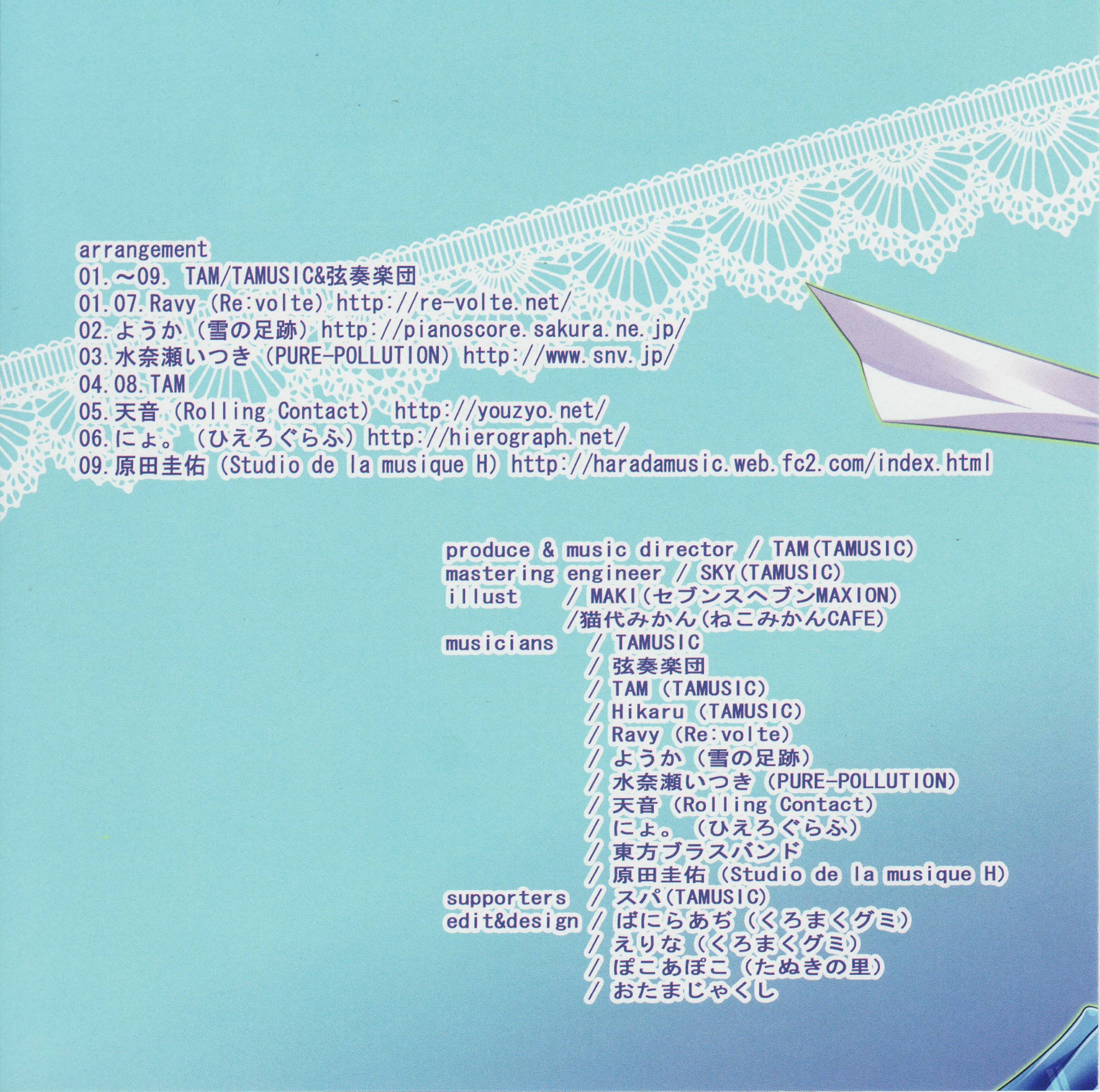 Arrangement: Ravy (Re:volte) (1,7), Yohka (2), Itsuki Minase (PURE-POLLUTION) (3), TAM (4,8), Amane (Rolling Contact) (5), Nyo. (Hierograph) 96), Keisuke Harada (Studio de la musique H) (9)