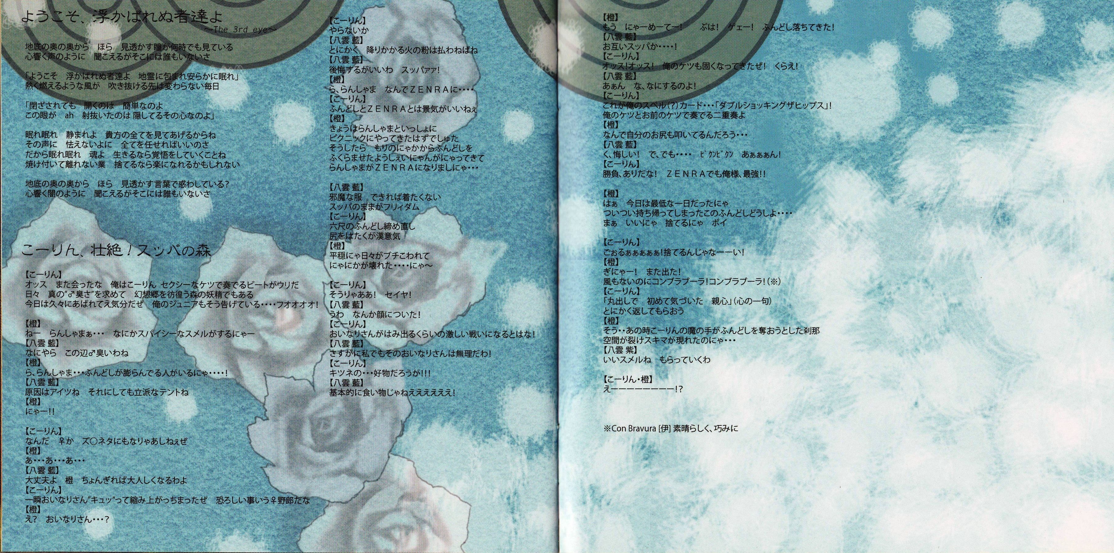 03. Lyrics: Yuma Mizonokuchi / Arrange: ARM (IOSYS) / Vocal: miko (alternative ending), Shinpu Yousuke, Yuma Mizonokuchi / Performance: Yukari Mano