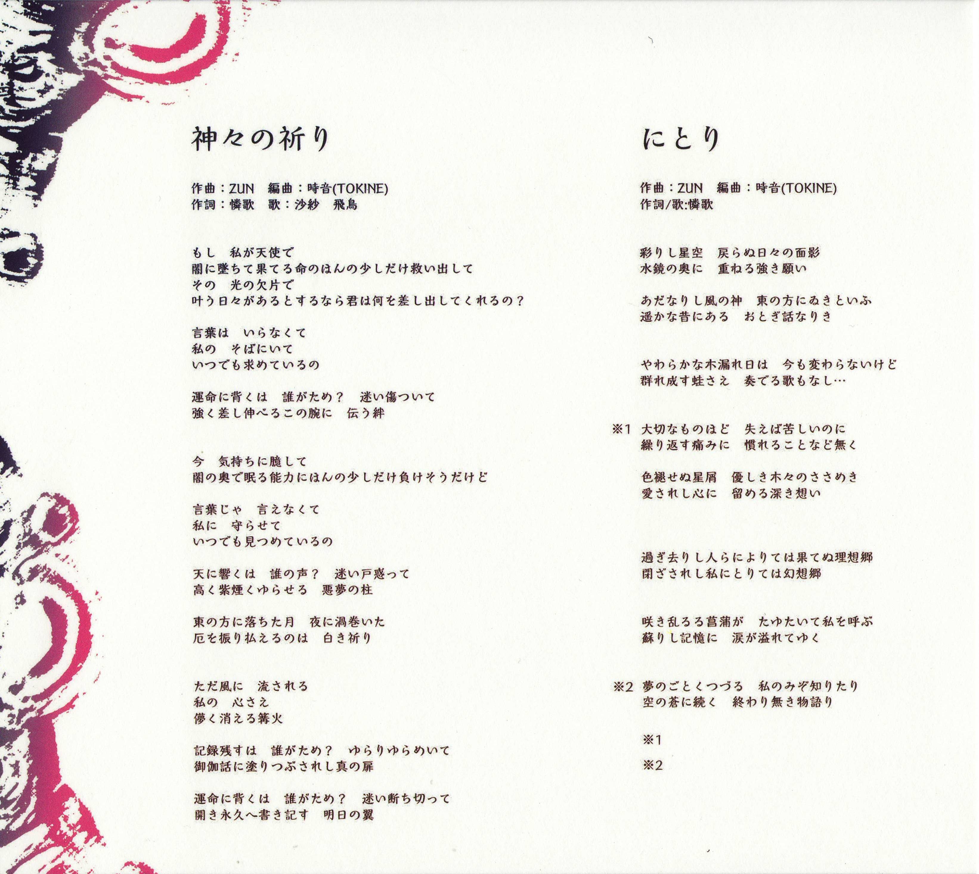 Tracks 07-09 and 13-14 are re-released tracks from Touhou Ameno Kouduki (MKTD-0801).