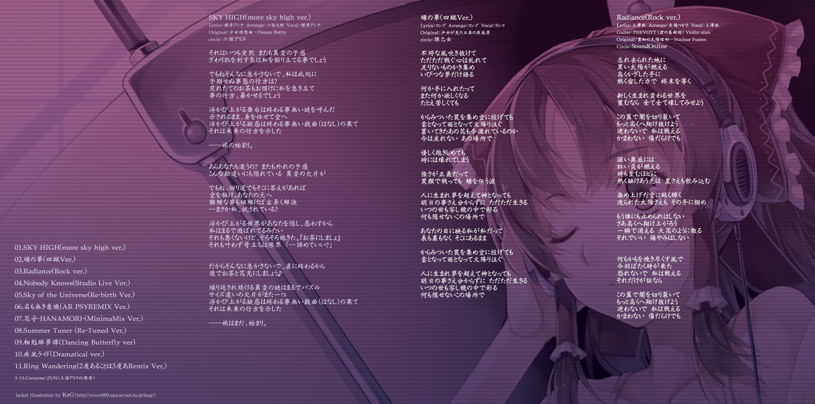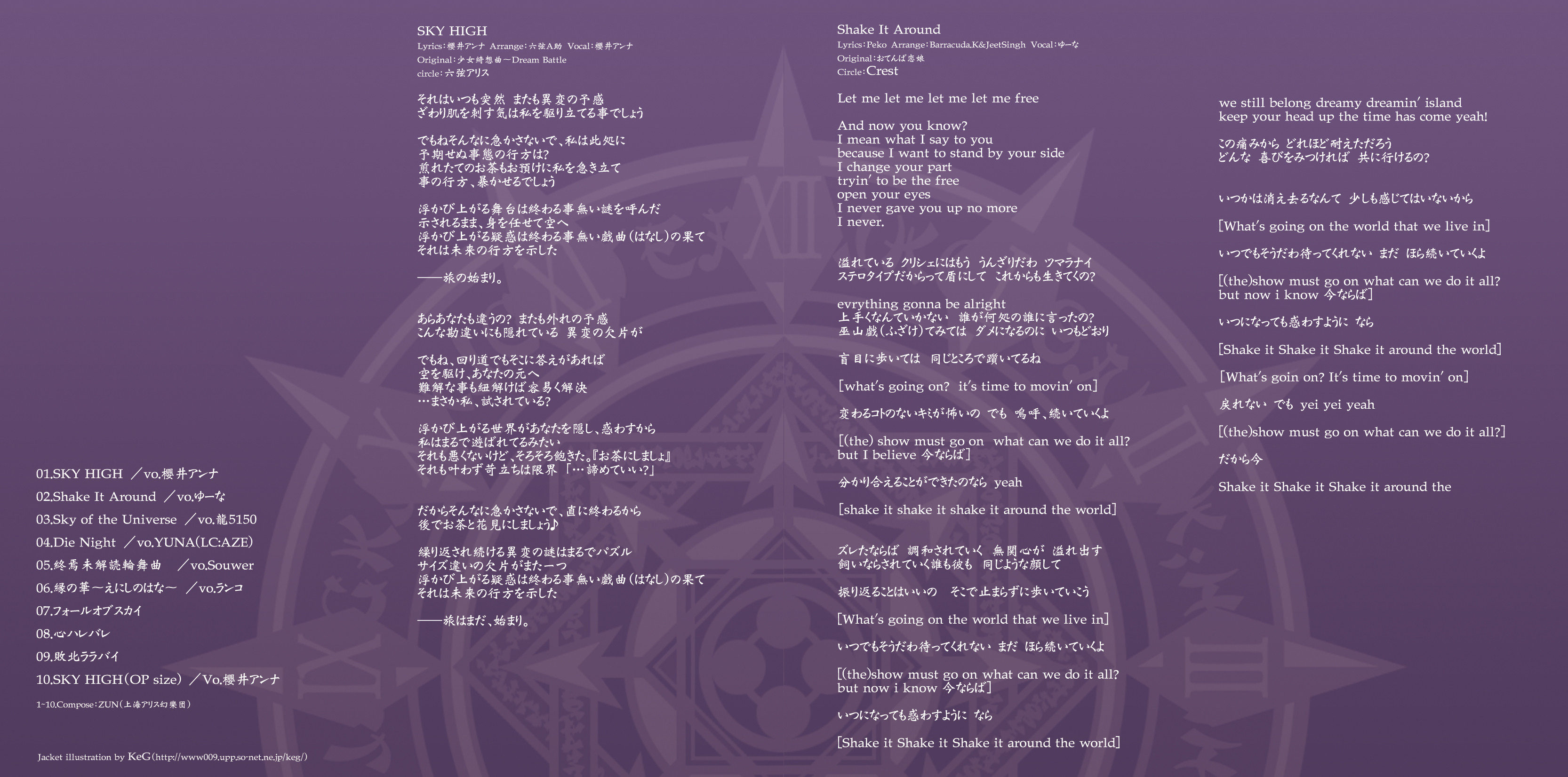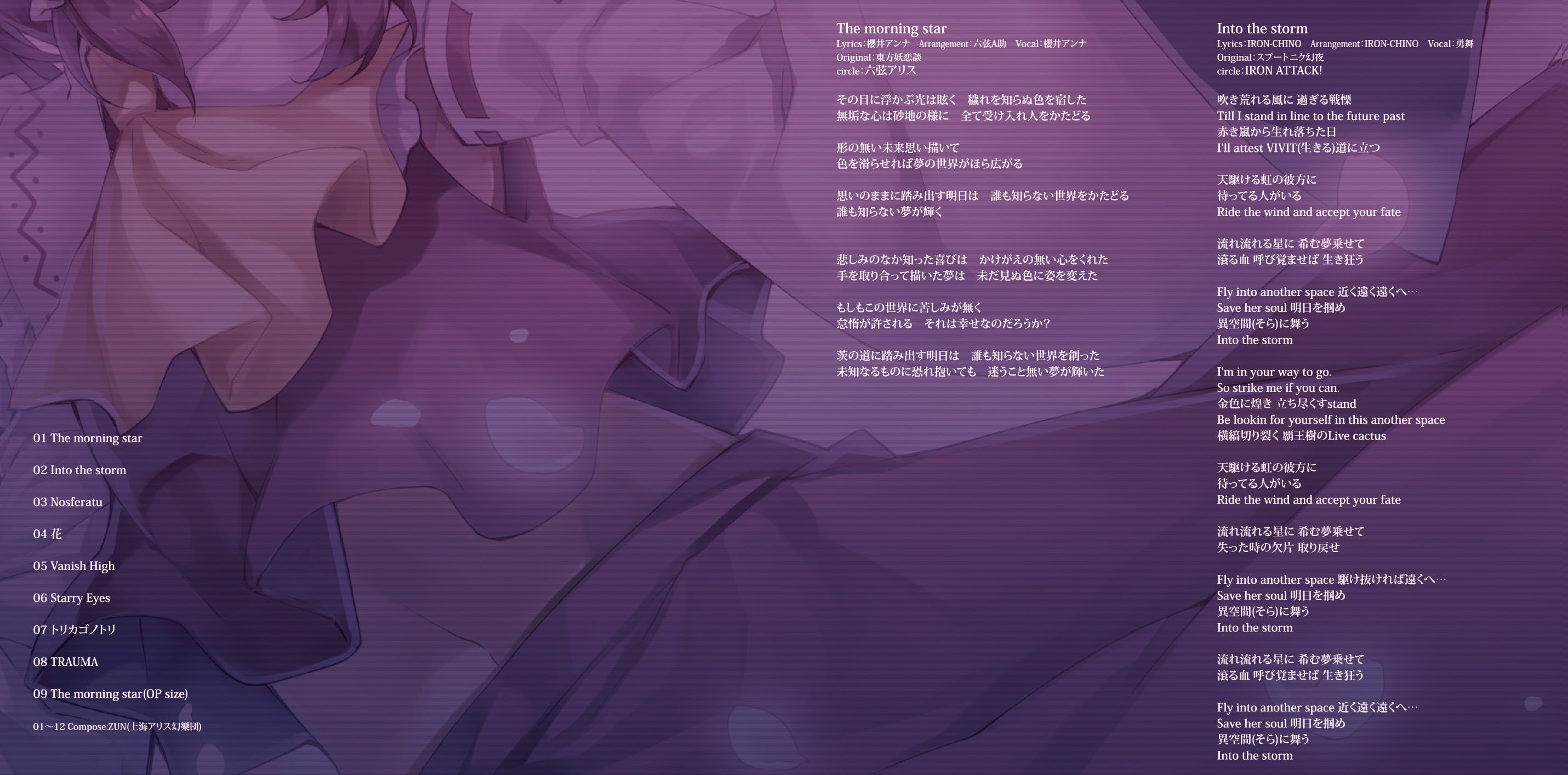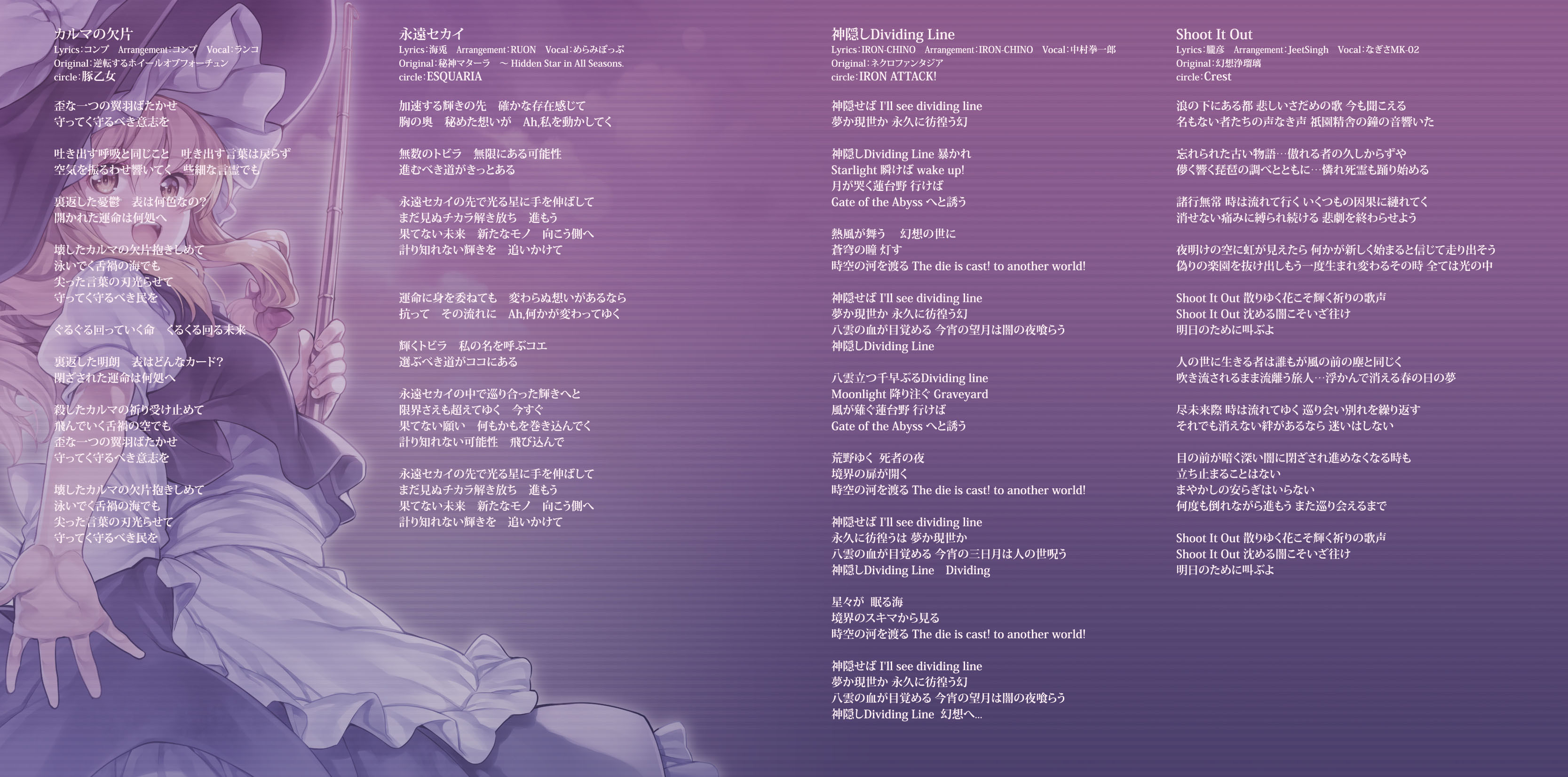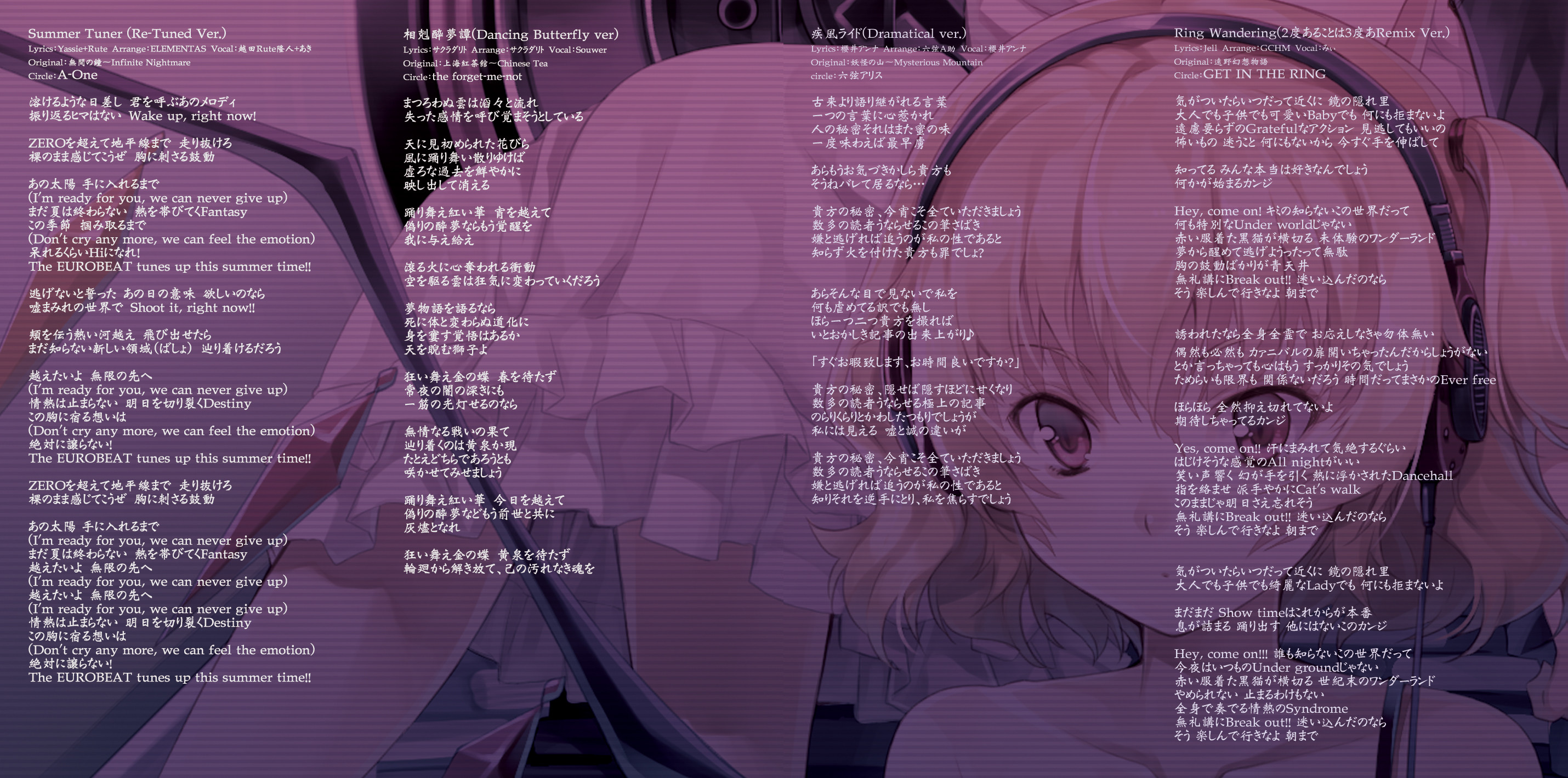 An on-parade of magnificent Touhou arrangements, performed by famous Japanese Doujin Circles such as Rokugen Alice, BUTAOTOME, A-One, C-CLAYS and Yuuhei Satellite to heat up the battles to infinity!