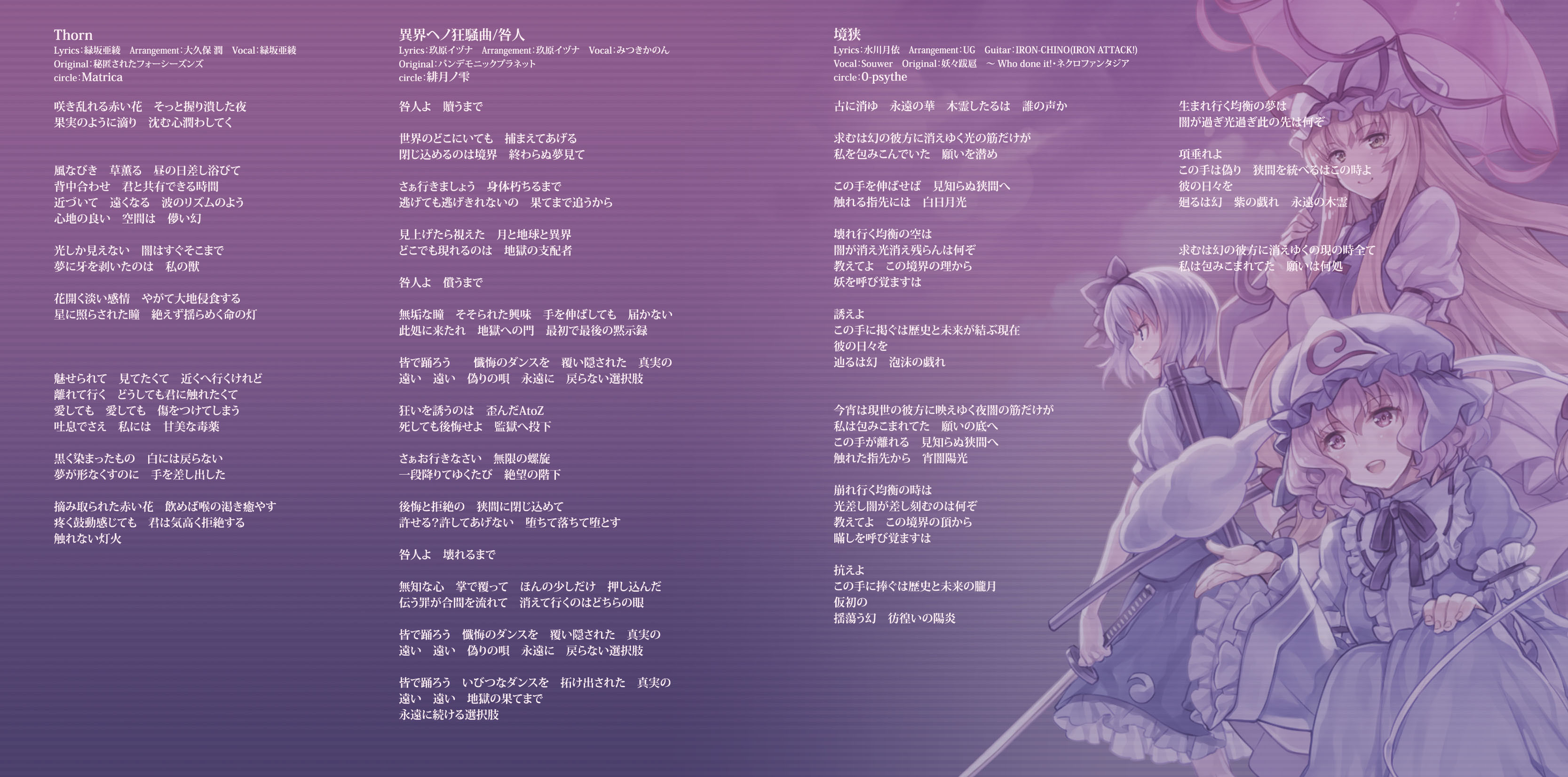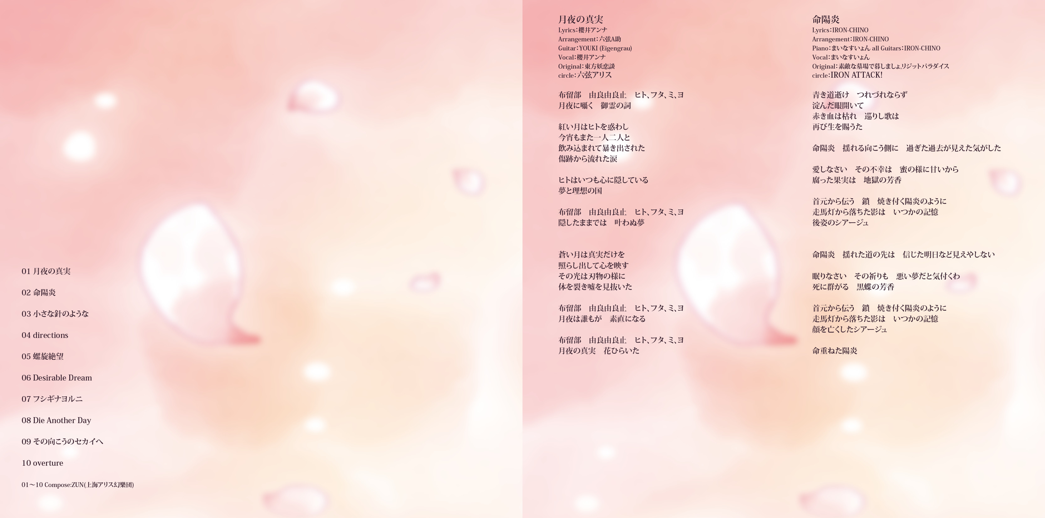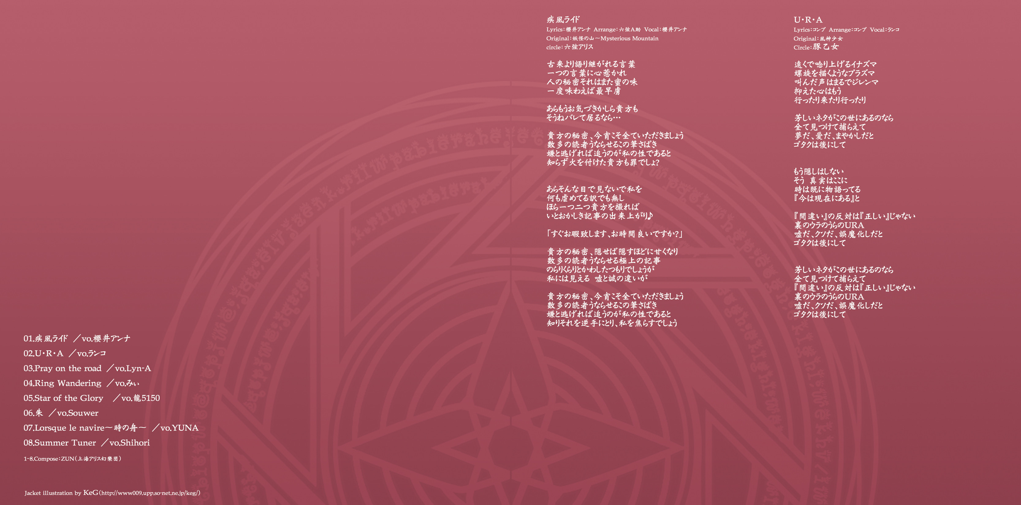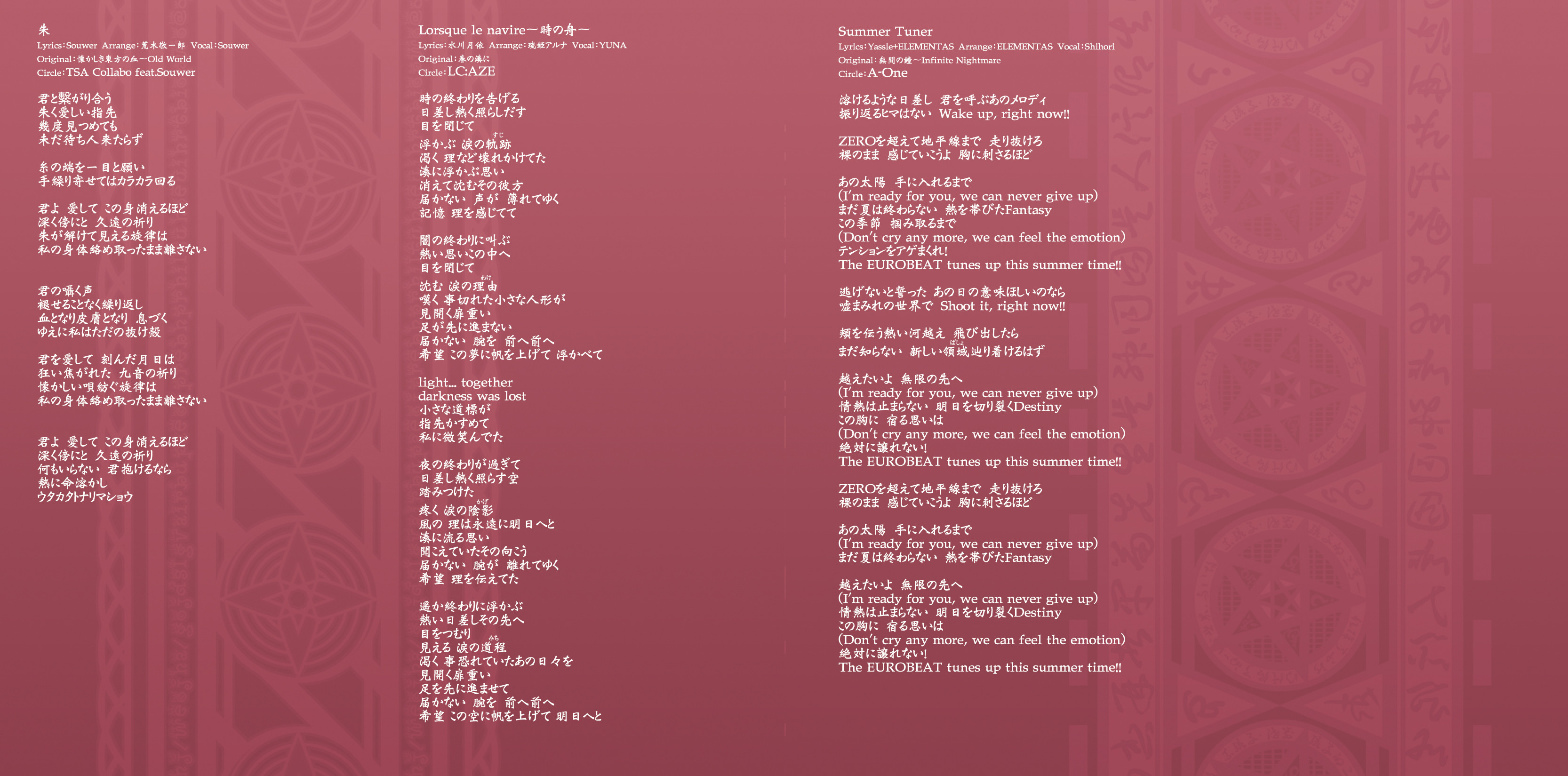 An on-parade of magnificent Touhou arrangements, performed by famous Japanese Doujin Circles such as Rokugen Alice, BUTAOTOME, A-One, C-CLAYS and Yuuhei Satellite to heat up the battles to infinity!