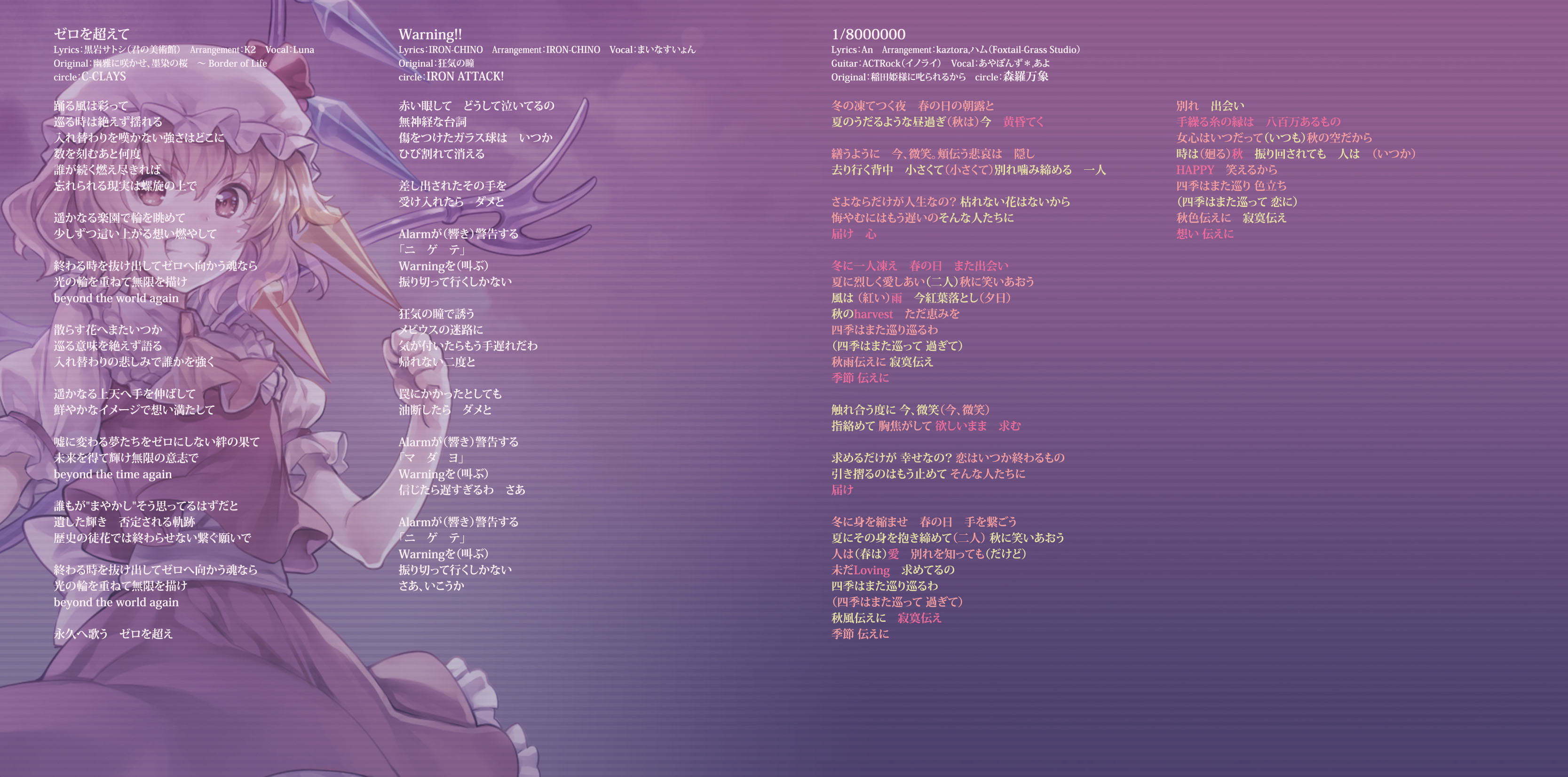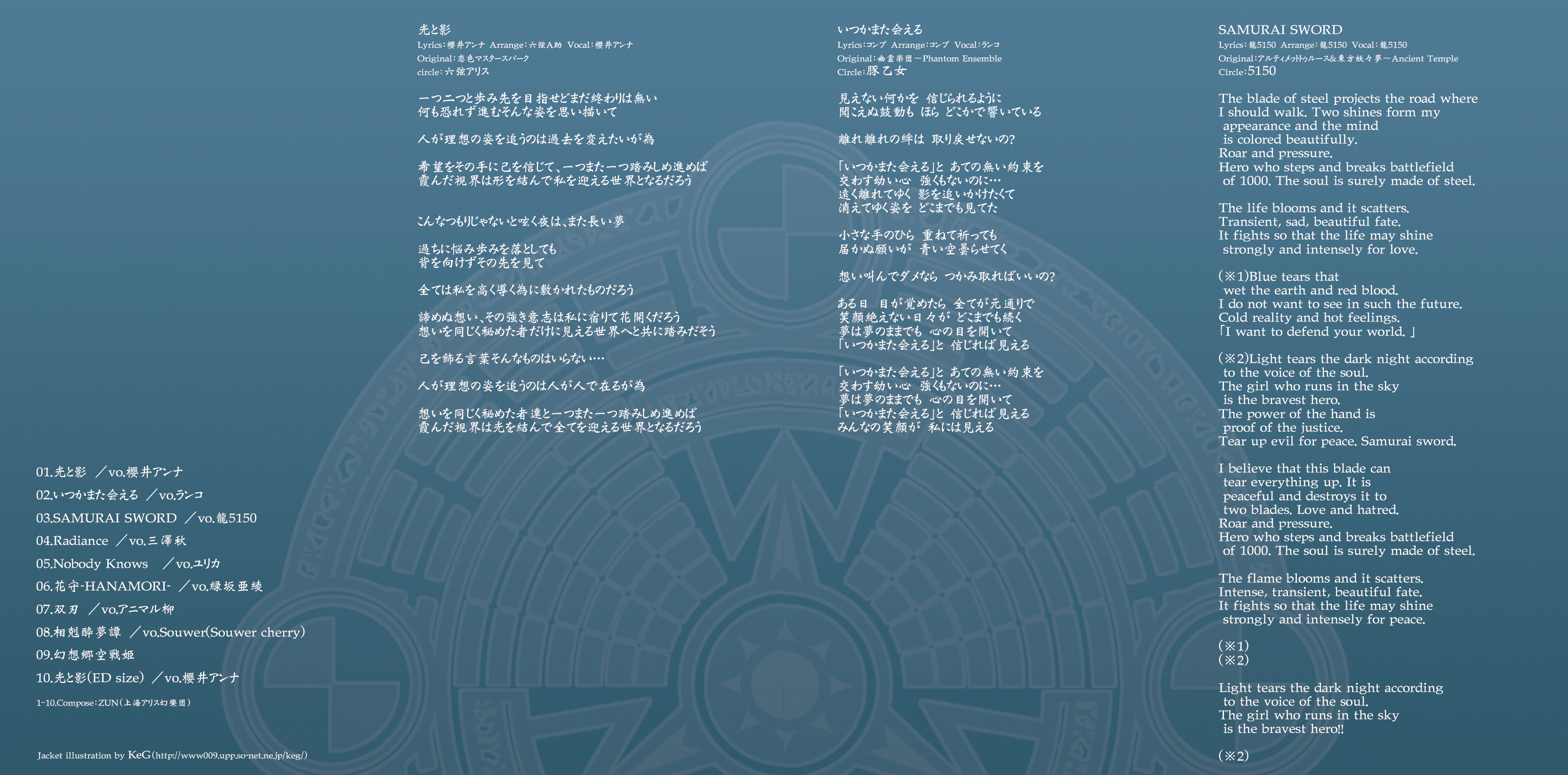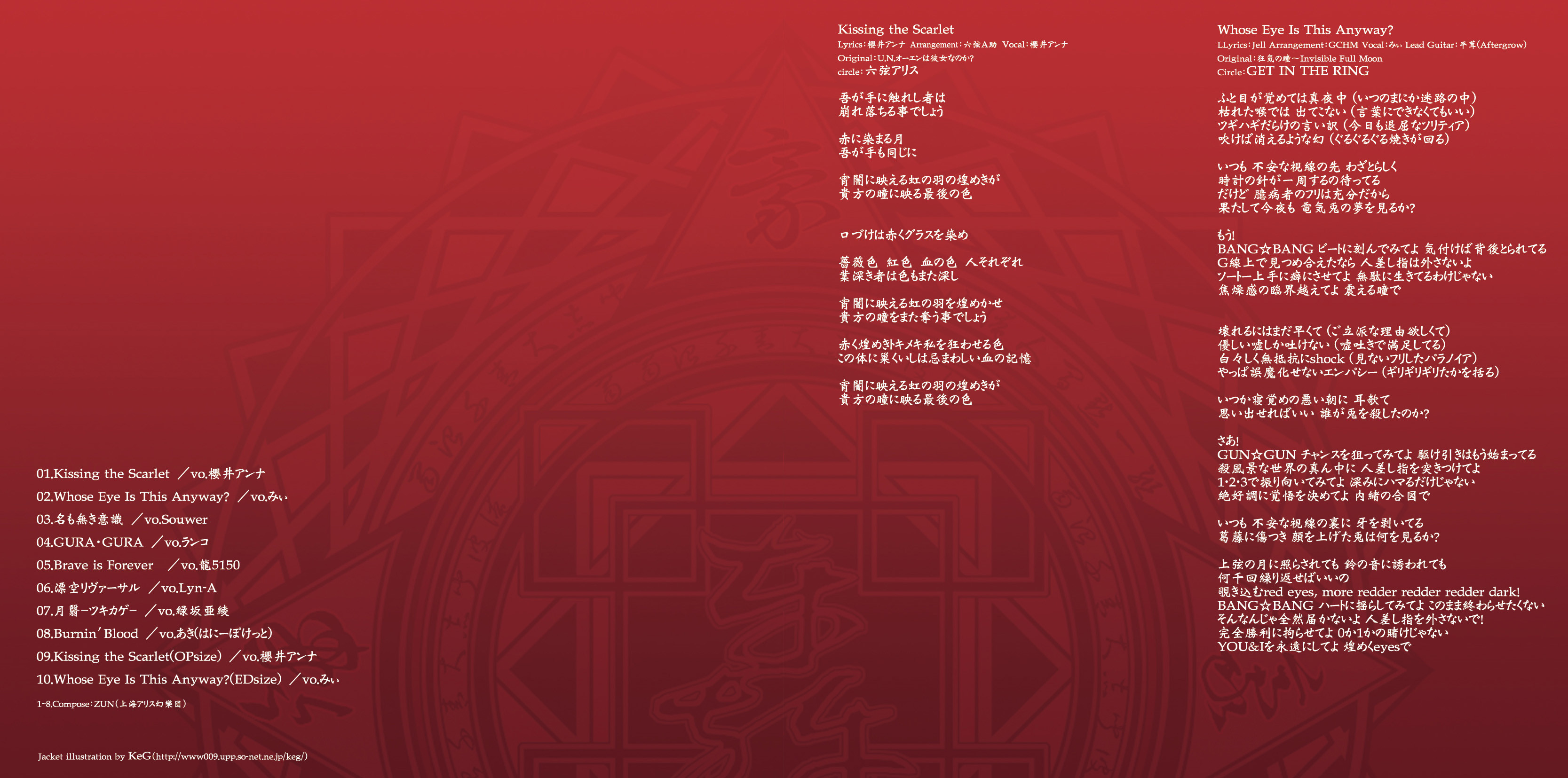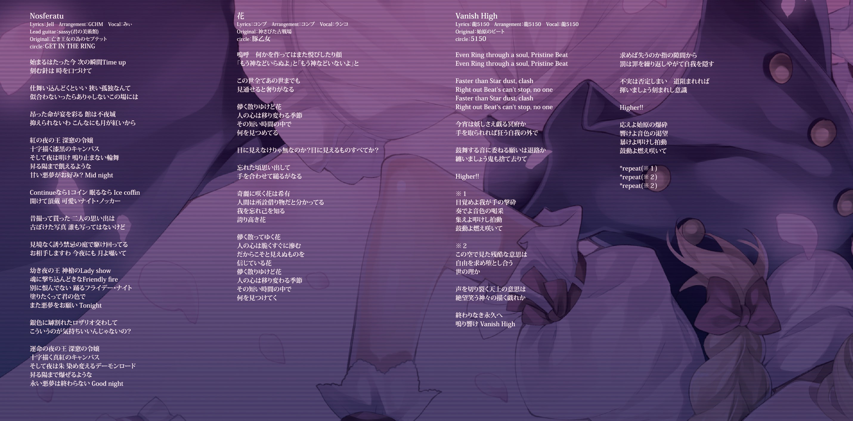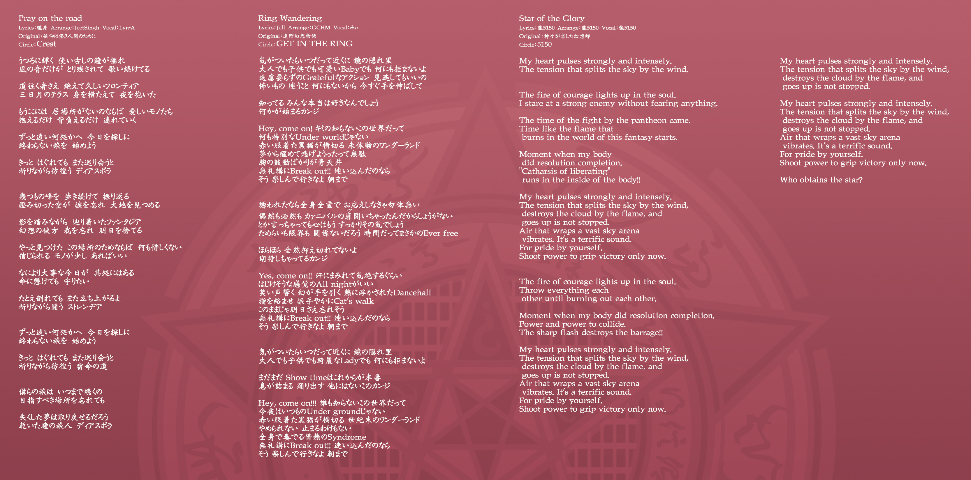 An on-parade of magnificent Touhou arrangements, performed by famous Japanese Doujin Circles such as Rokugen Alice, BUTAOTOME, A-One, C-CLAYS and Yuuhei Satellite to heat up the battles to infinity!