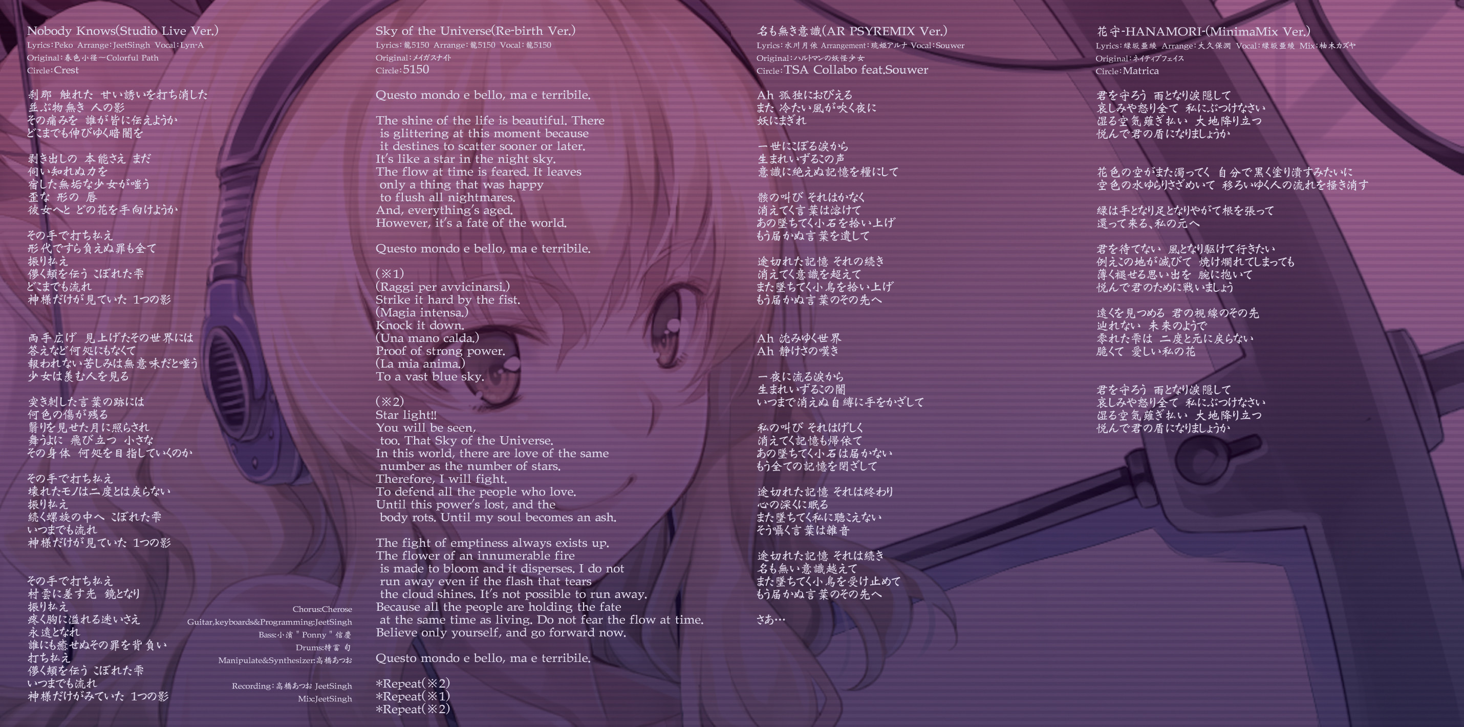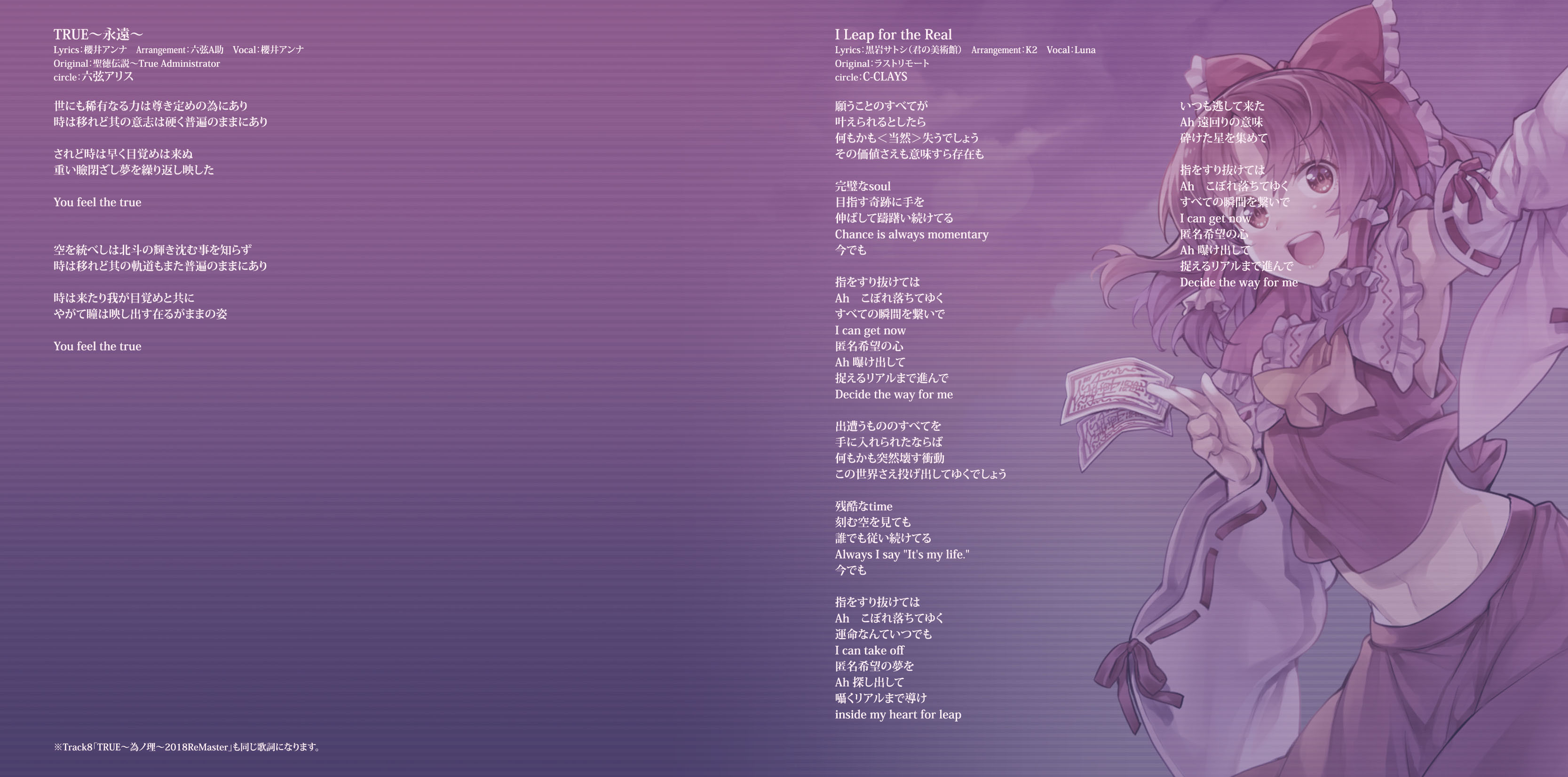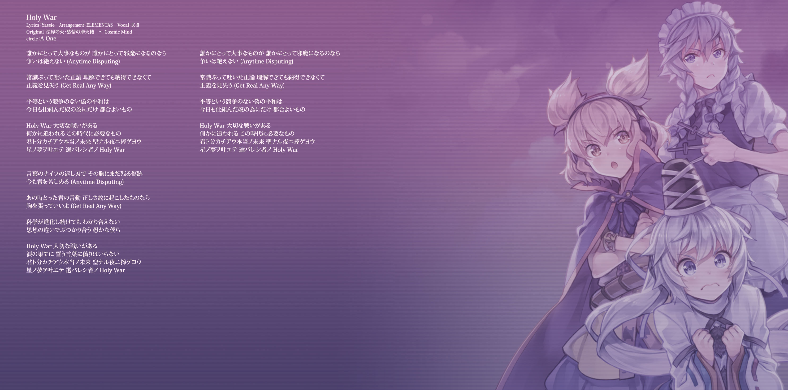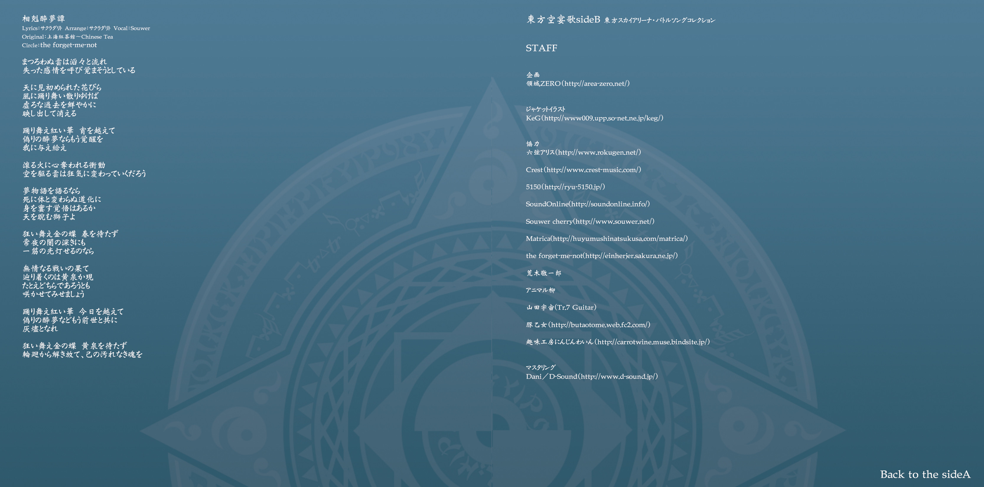 An on-parade of magnificent Touhou arrangements, performed by famous Japanese Doujin Circles such as Rokugen Alice, BUTAOTOME, A-One, C-CLAYS and Yuuhei Satellite to heat up the battles to infinity!