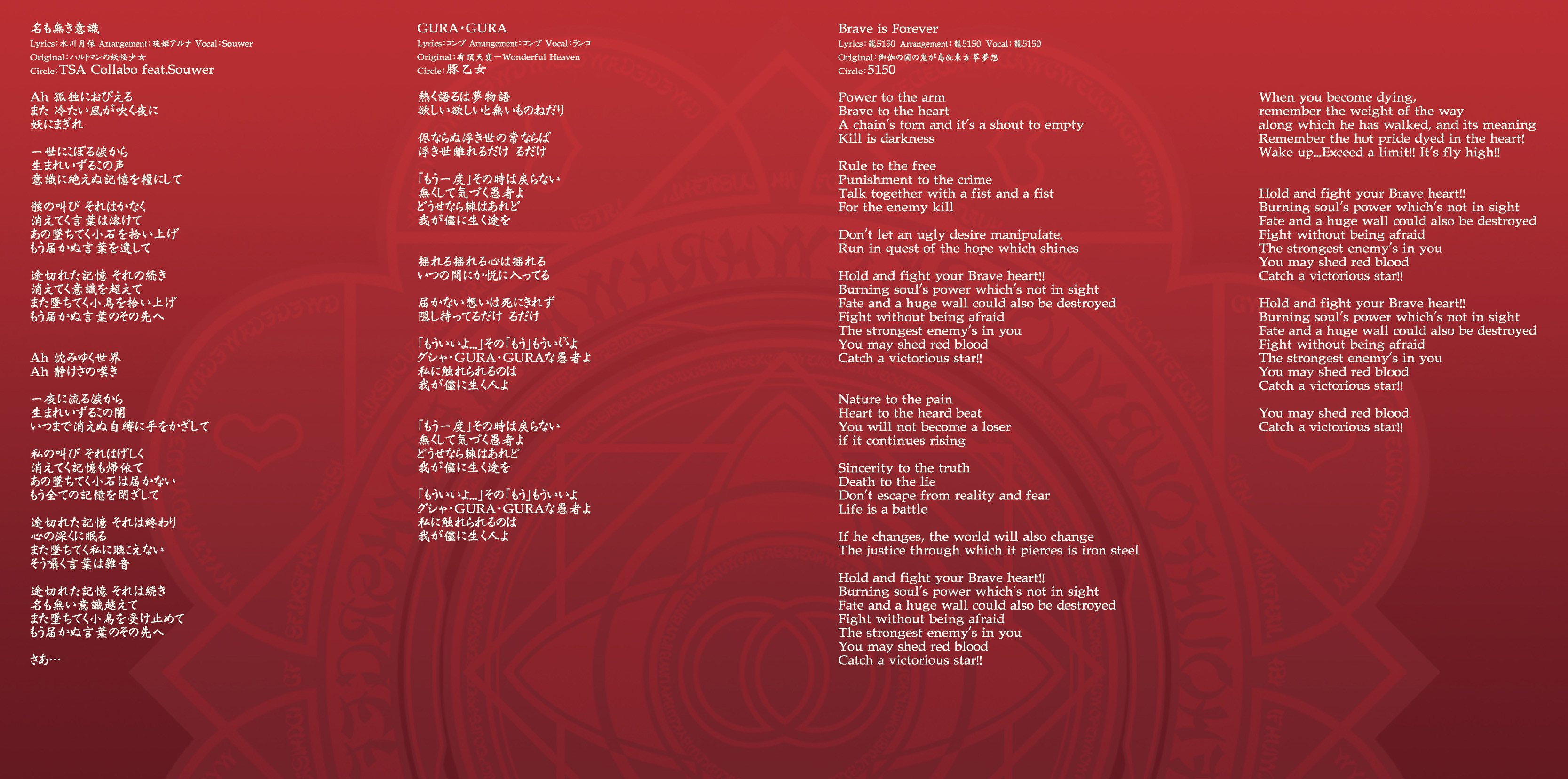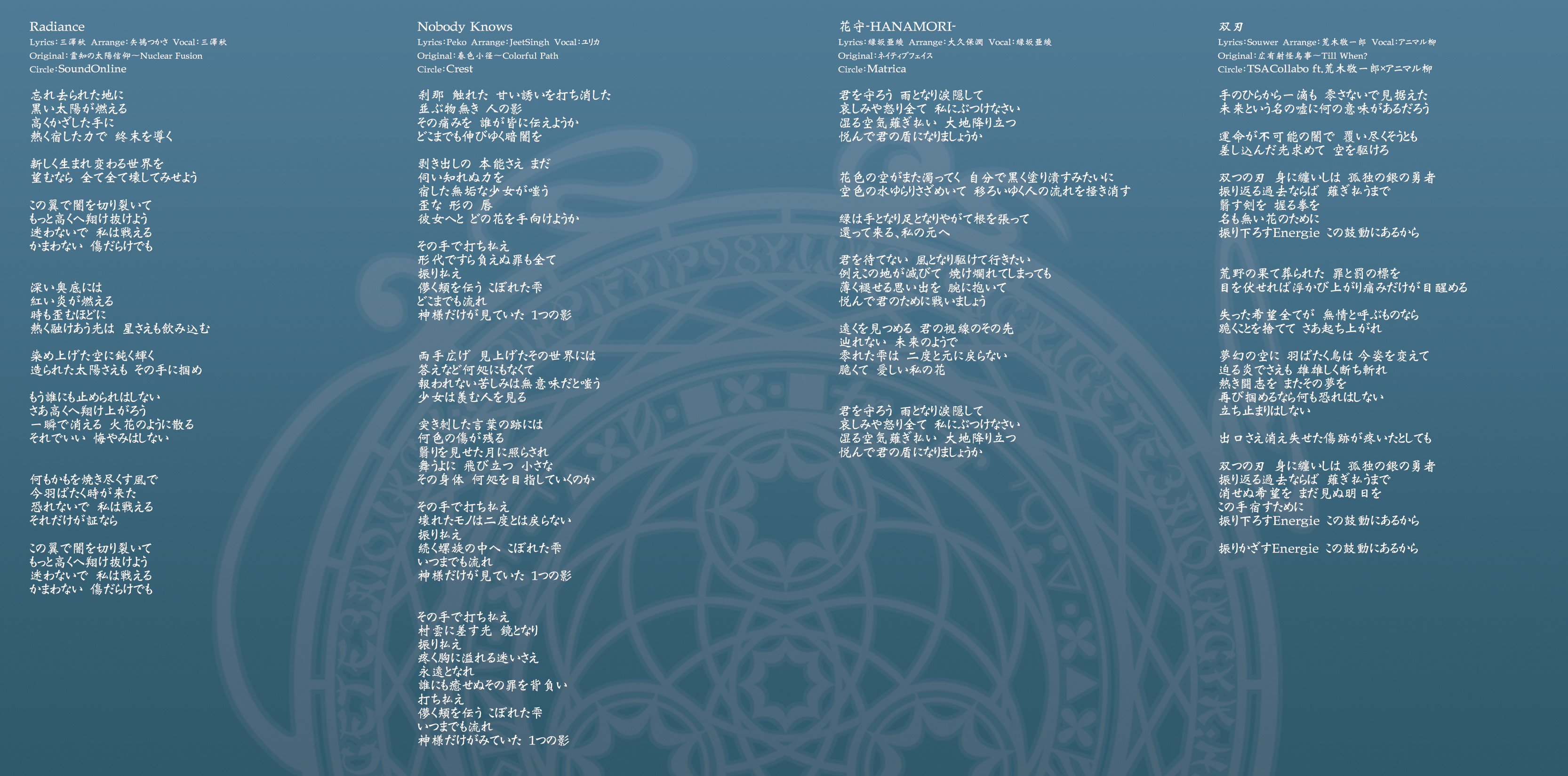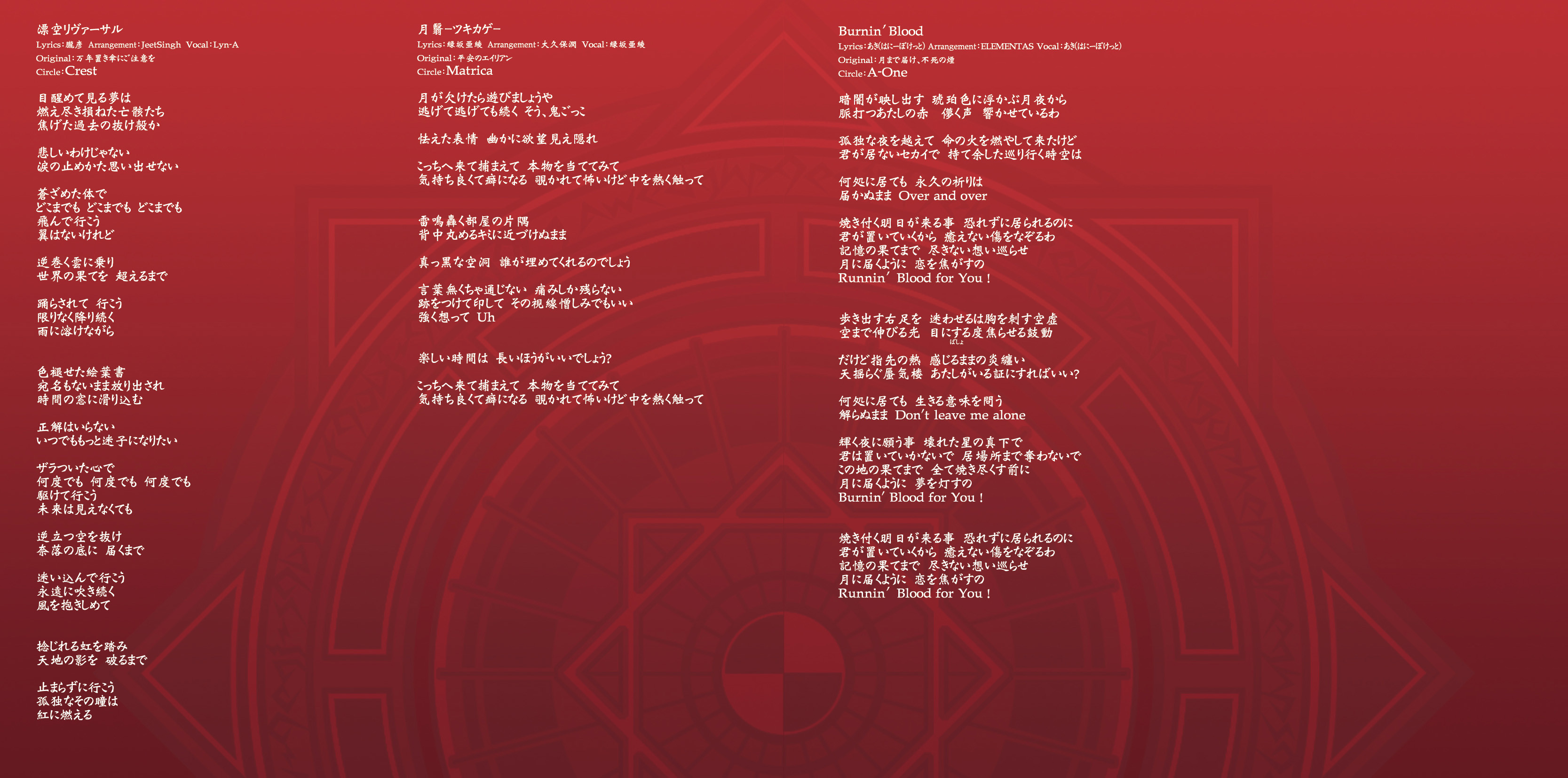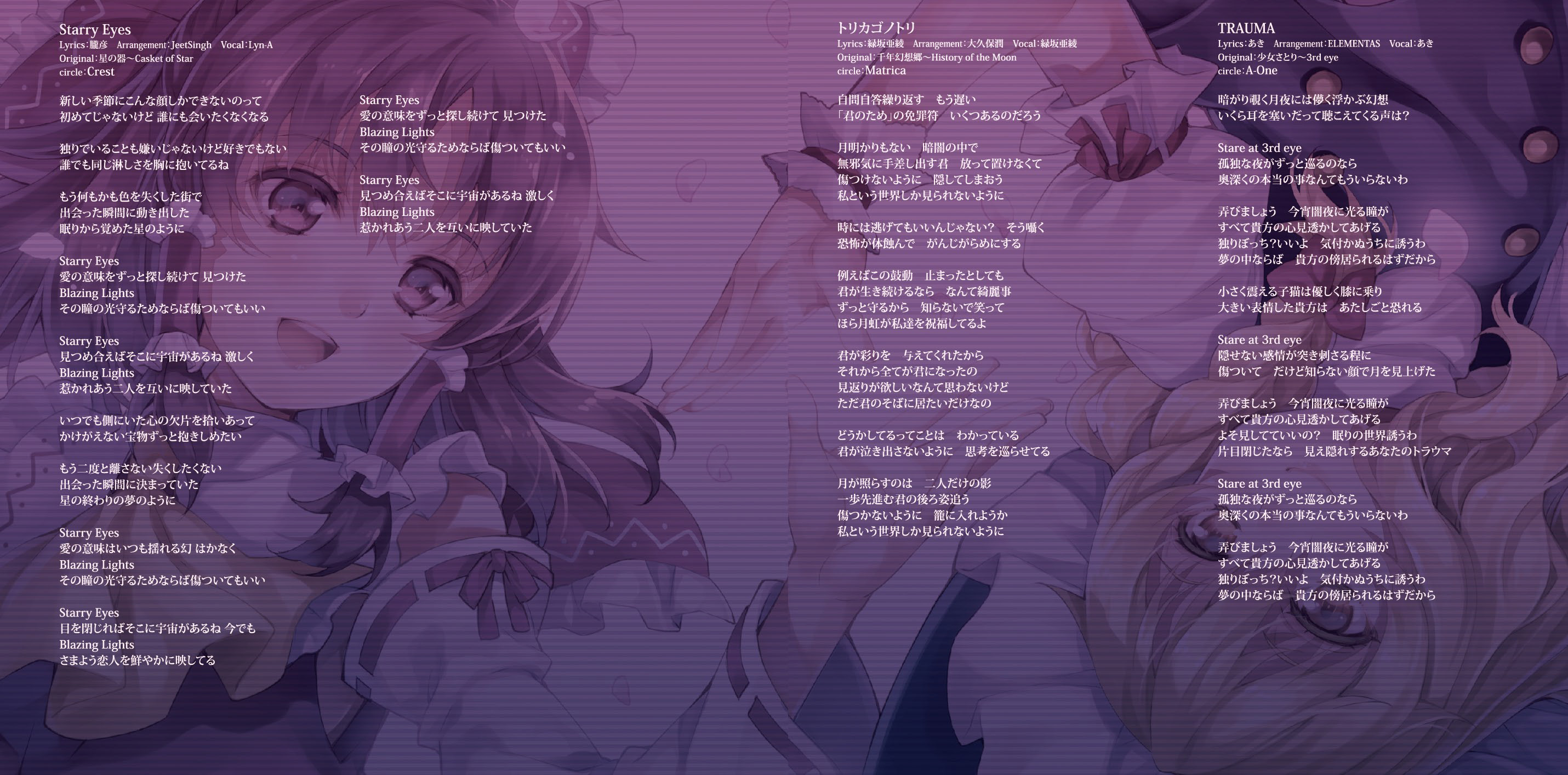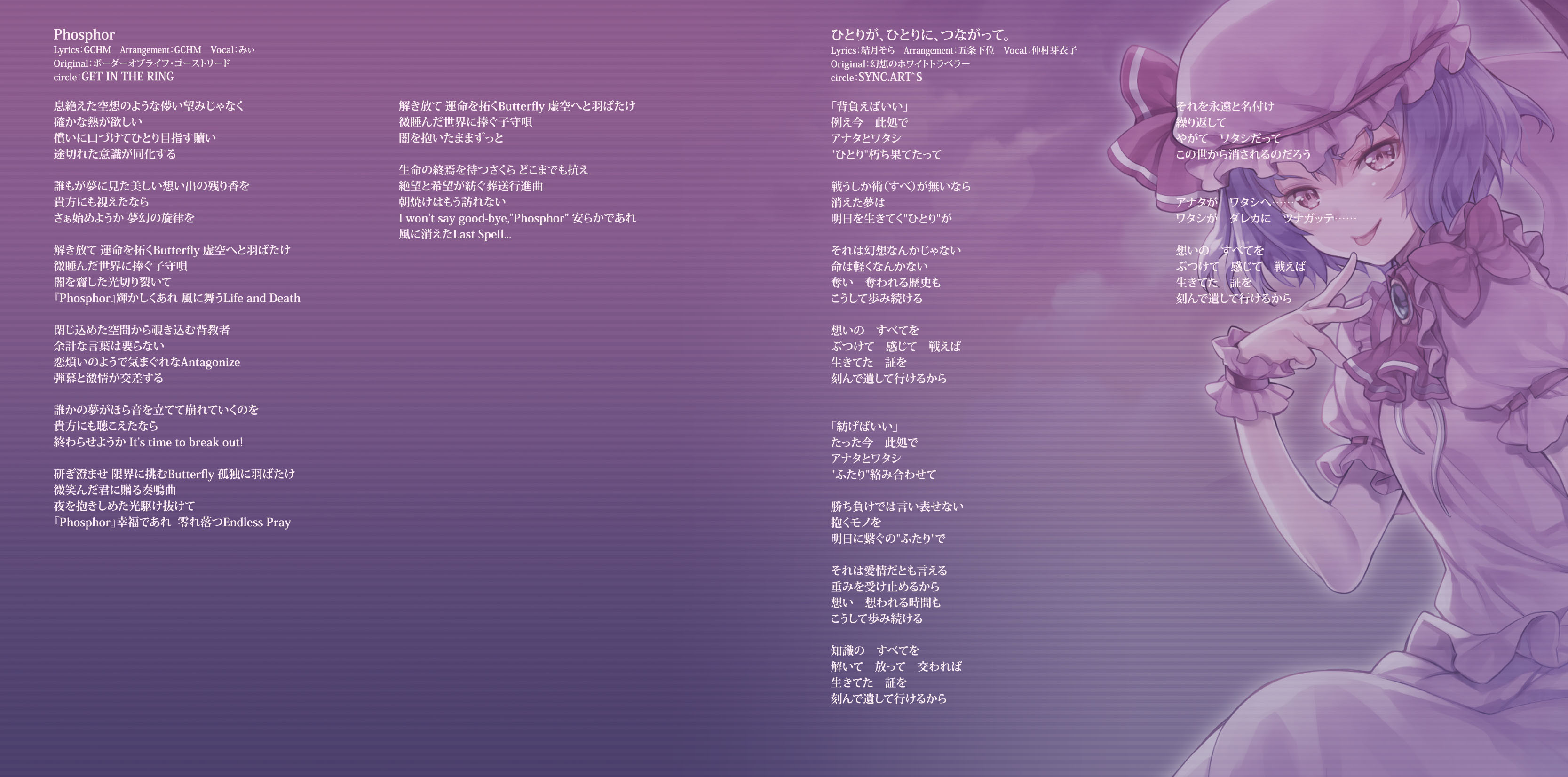 An on-parade of magnificent Touhou arrangements, performed by famous Japanese Doujin Circles such as Rokugen Alice, BUTAOTOME, A-One, C-CLAYS and Yuuhei Satellite to heat up the battles to infinity!