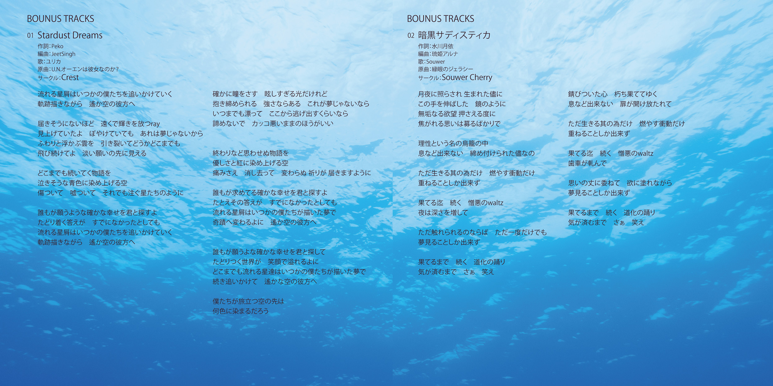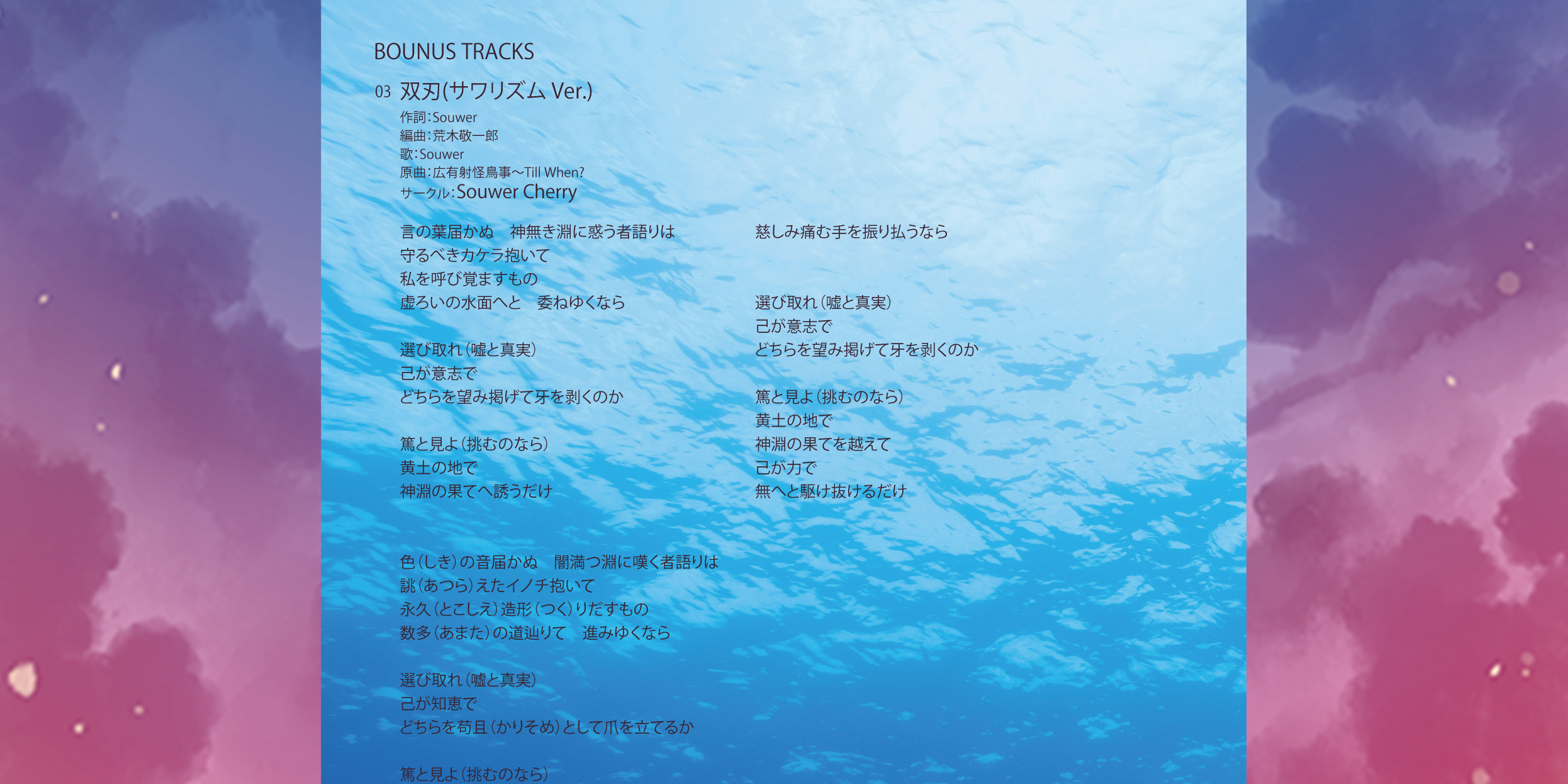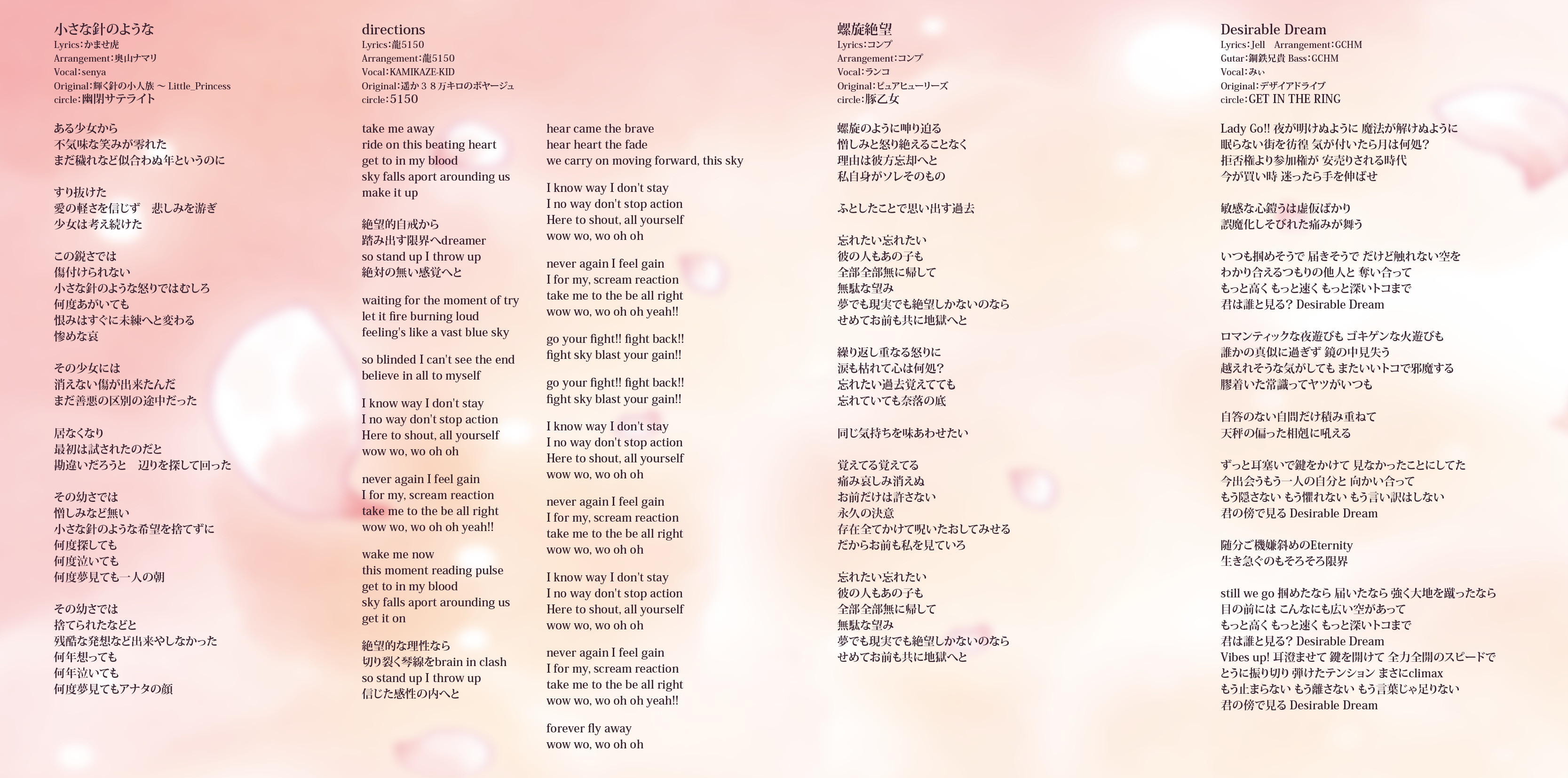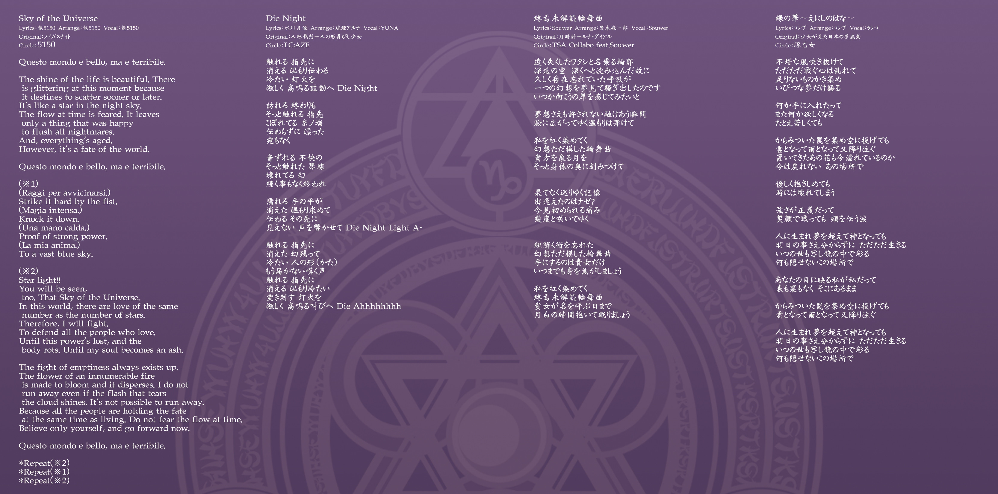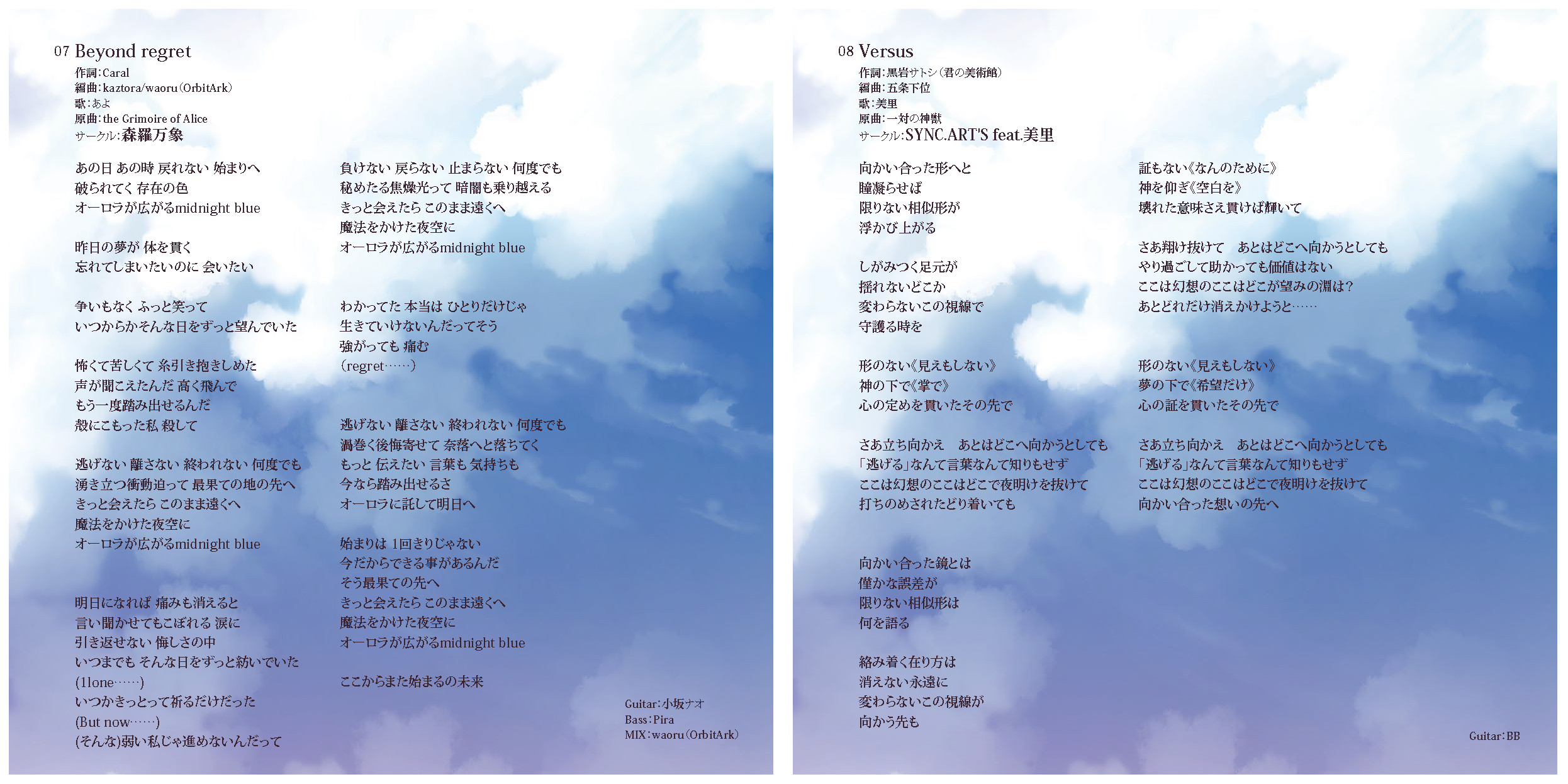 An on-parade of magnificent Touhou arrangements, performed by famous Japanese Doujin Circles such as Rokugen Alice, BUTAOTOME, A-One, C-CLAYS and Yuuhei Satellite to heat up the battles to infinity!