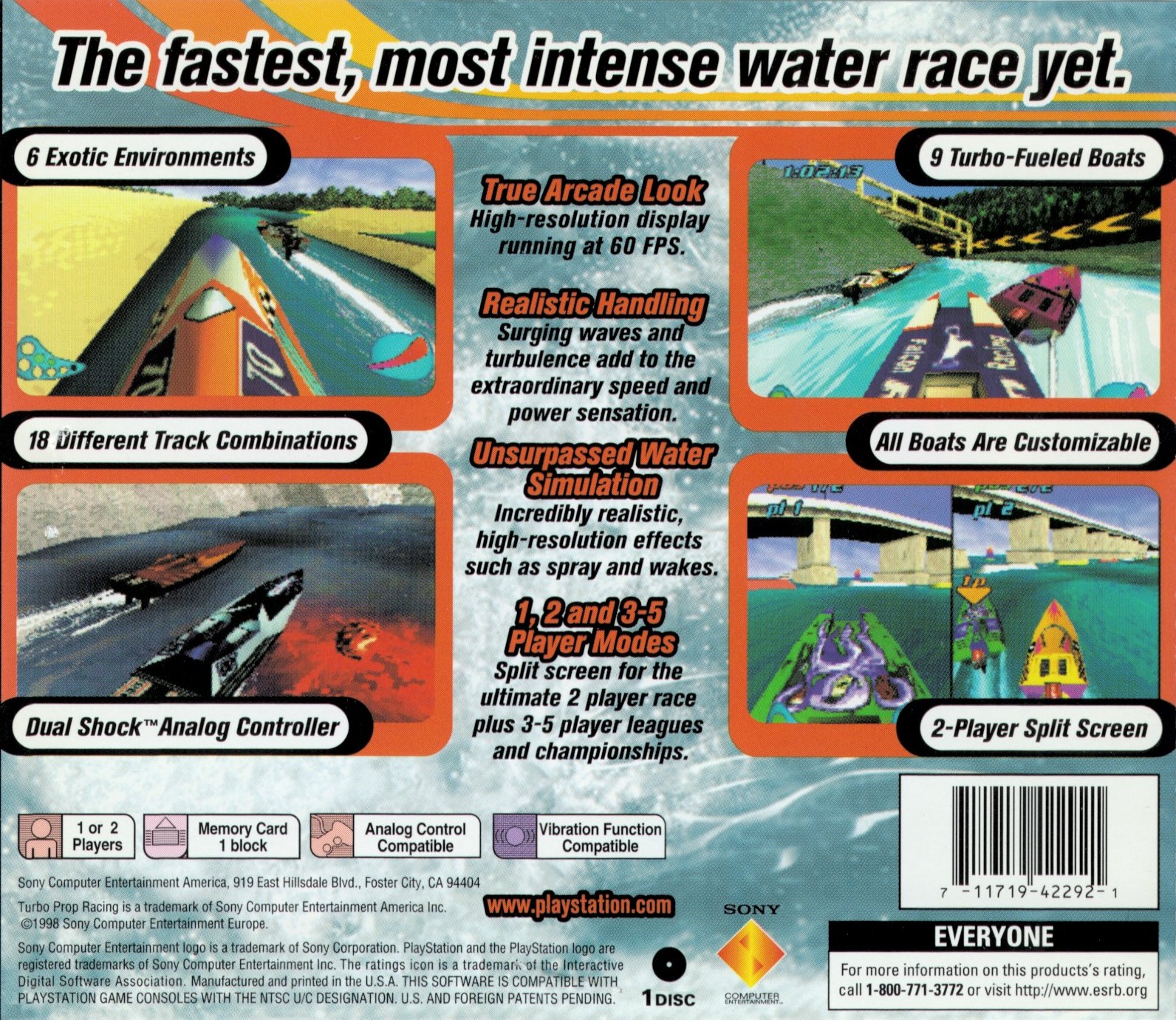 The fastest, most intense water race yet. TRUE ARCADE LOOK - High-resolution display running at 60 FPS. REALISTIC HANDLING - Surging waves and turbulence add to the extraordinary speed and power sensation. UNSURPASSED WATER SIMULATION - Incredibly realistic, high-resolution effects such as spray and wakes. 1,2 AND 3-5 PLAYER MODES - Split screen for the ultimate 2 player race plus 3-5 player leagues and championships.