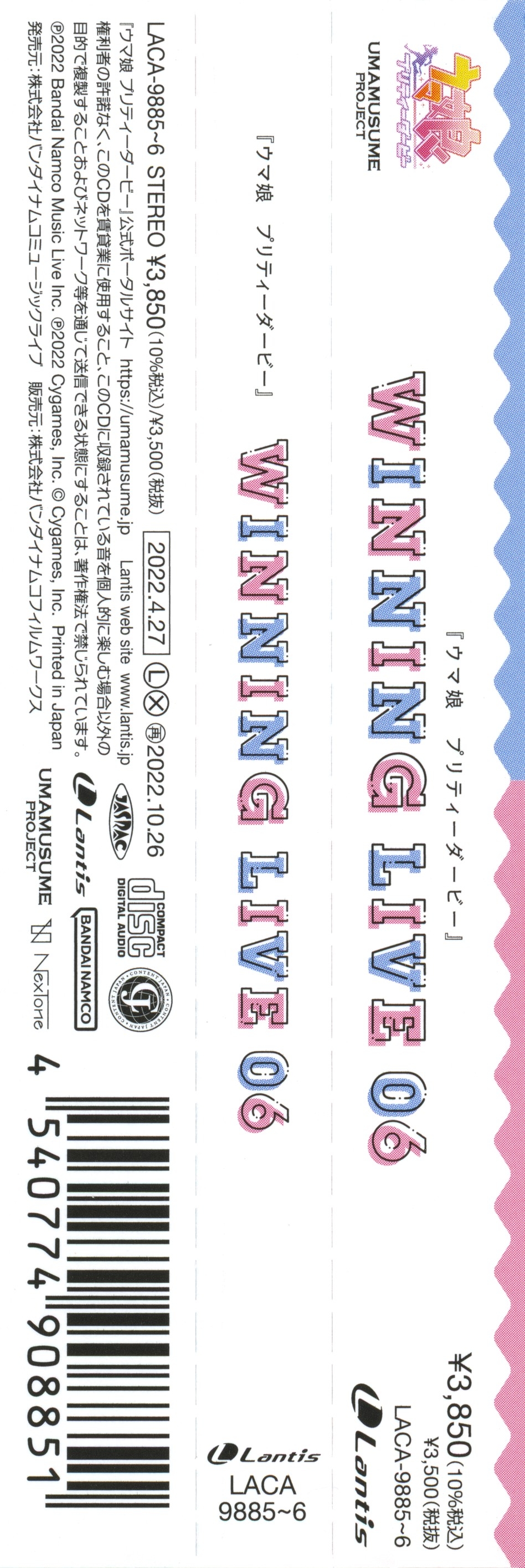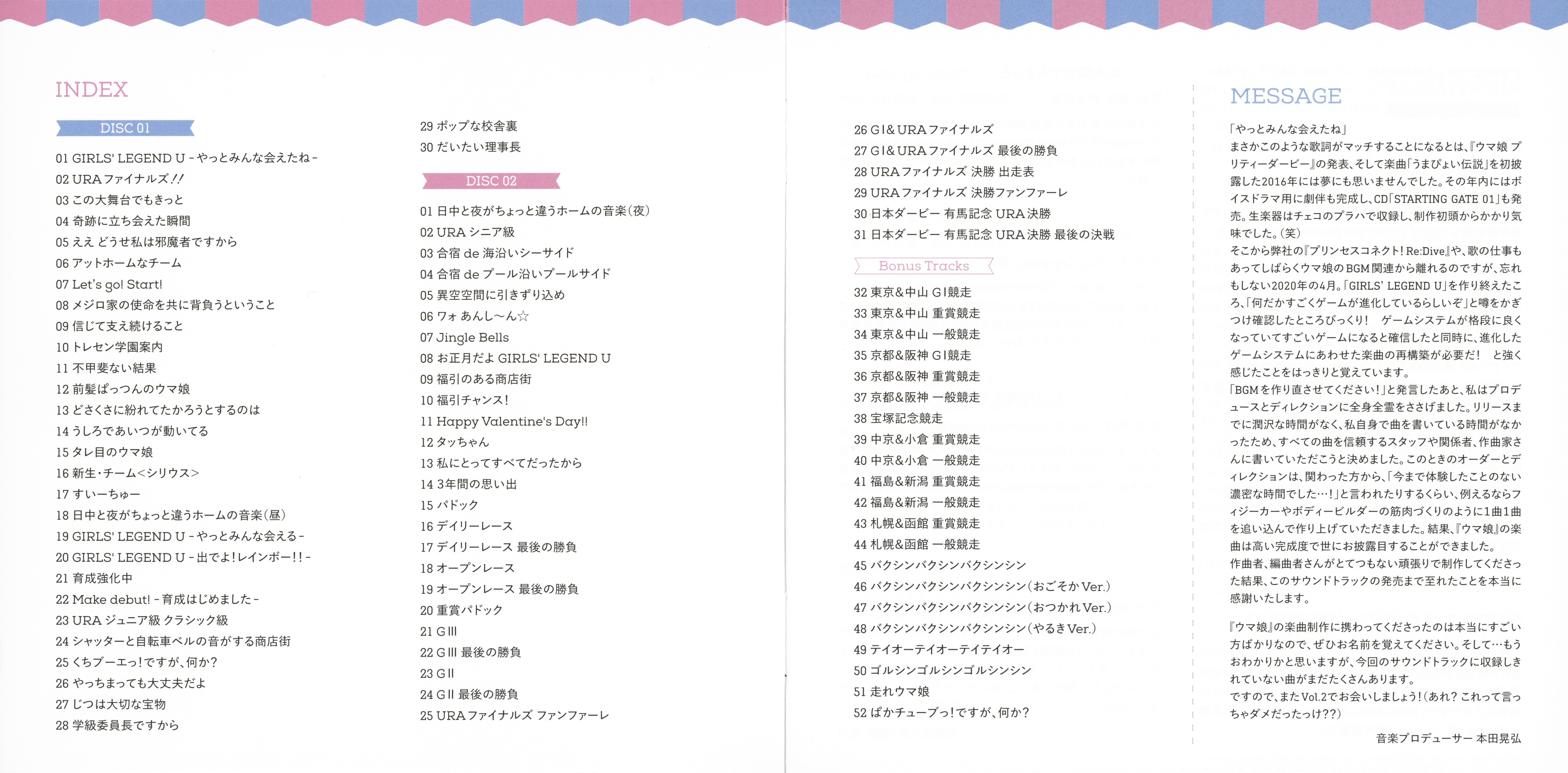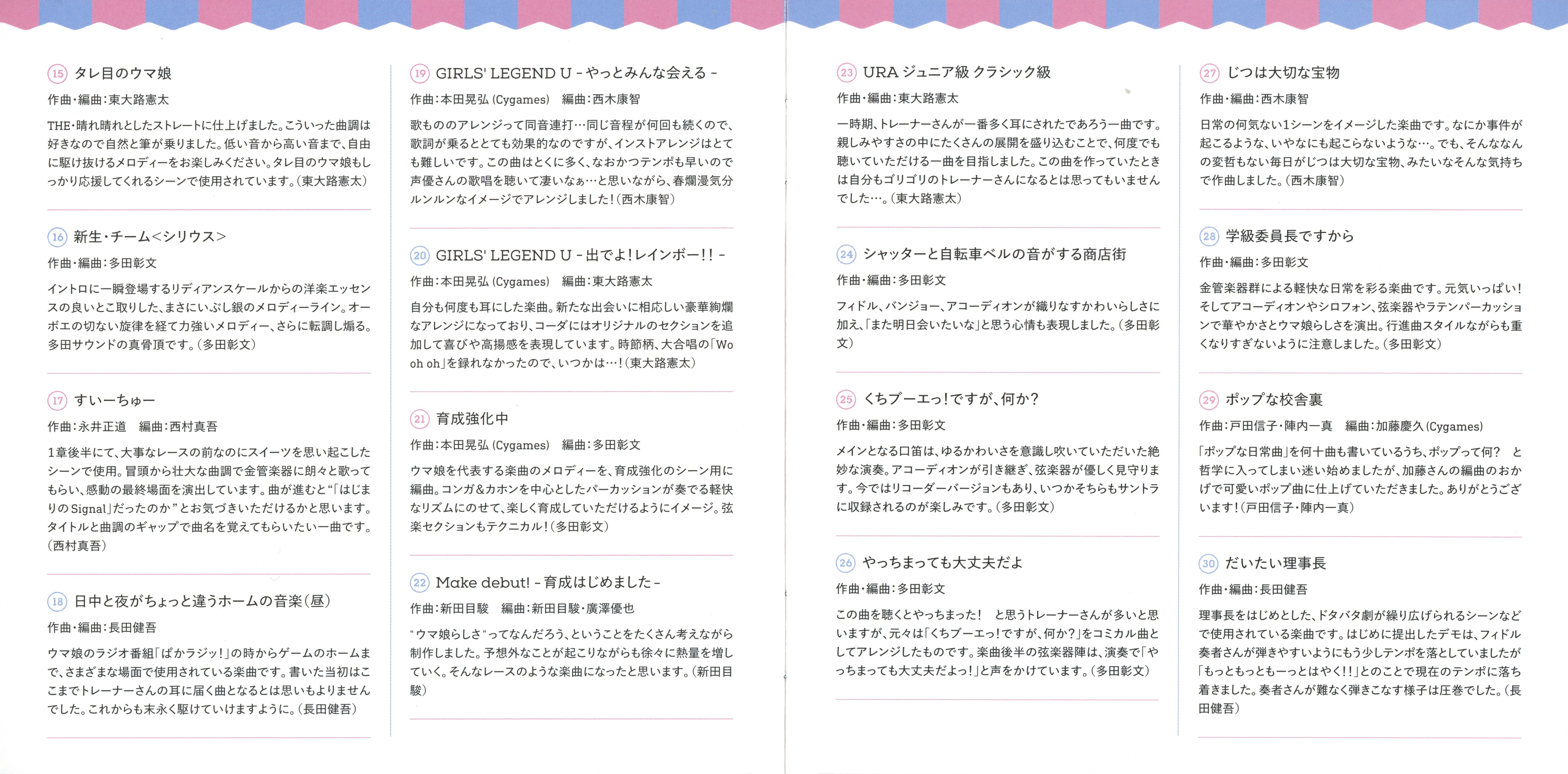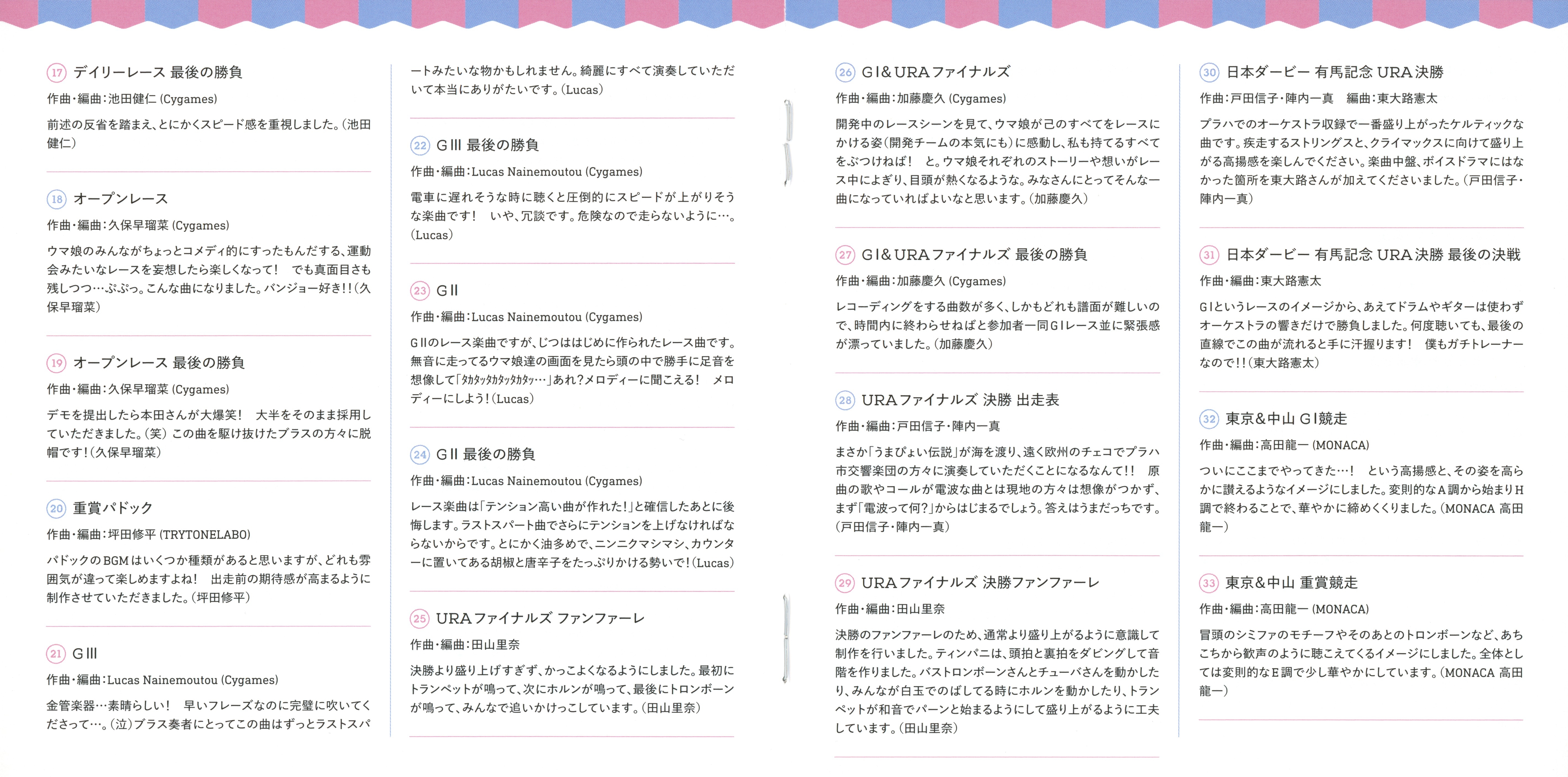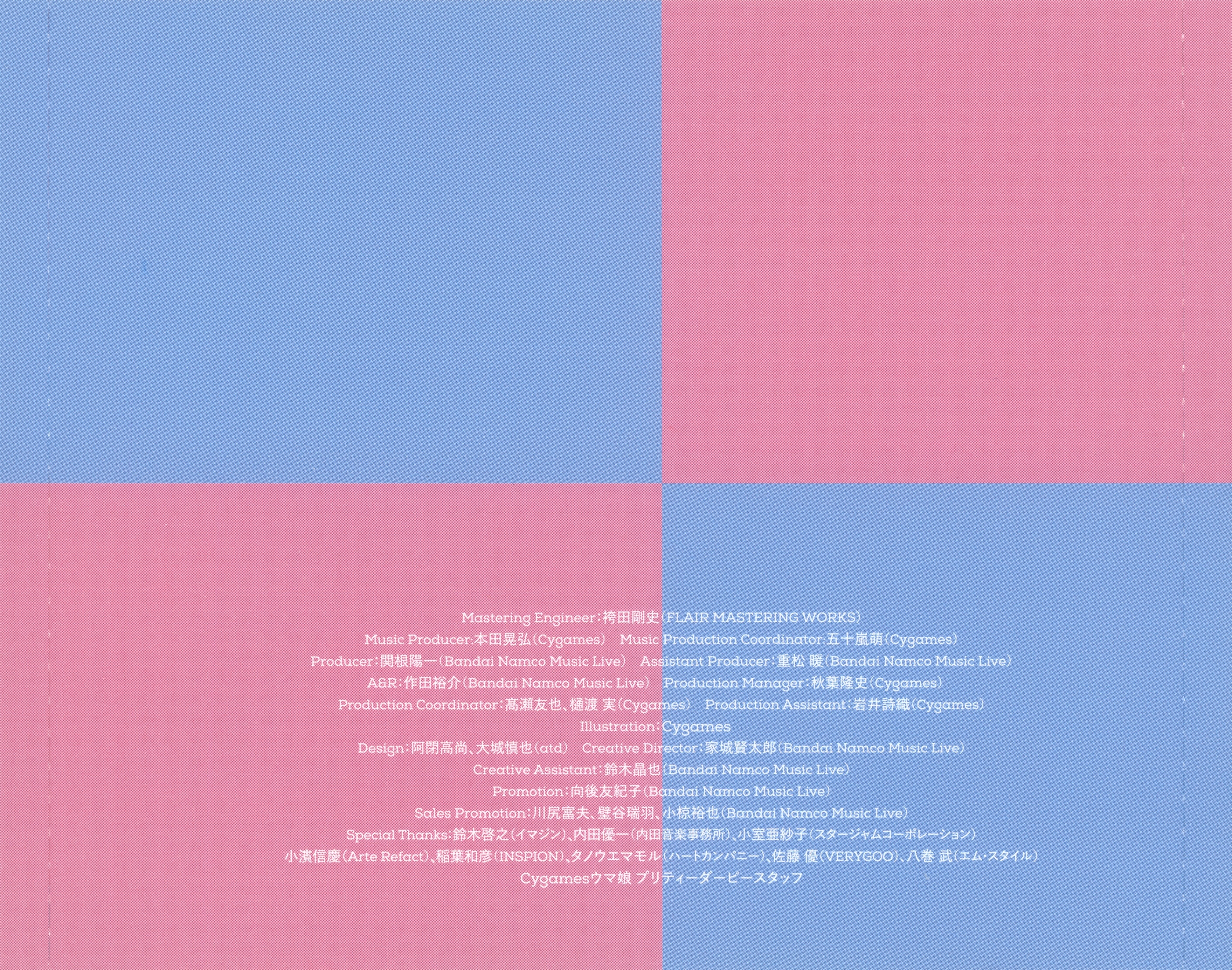 Special Thanks: Yoshiyuki Suzuki (IMAGINE), Yuichi Uchida (UCHIDA ONGAKU JIMUSHO), Asako Komuro (StarJam Corporation), Nobuyoshi Kohama (Arte Refact), Kazuhiko Inaba (INSPION), Mamoru Tanoue (Heart Company), Yu Sato (VERYGOO), Takeshi Yamaki (M-style), Cygames Umamusume Pretty Derby Staff