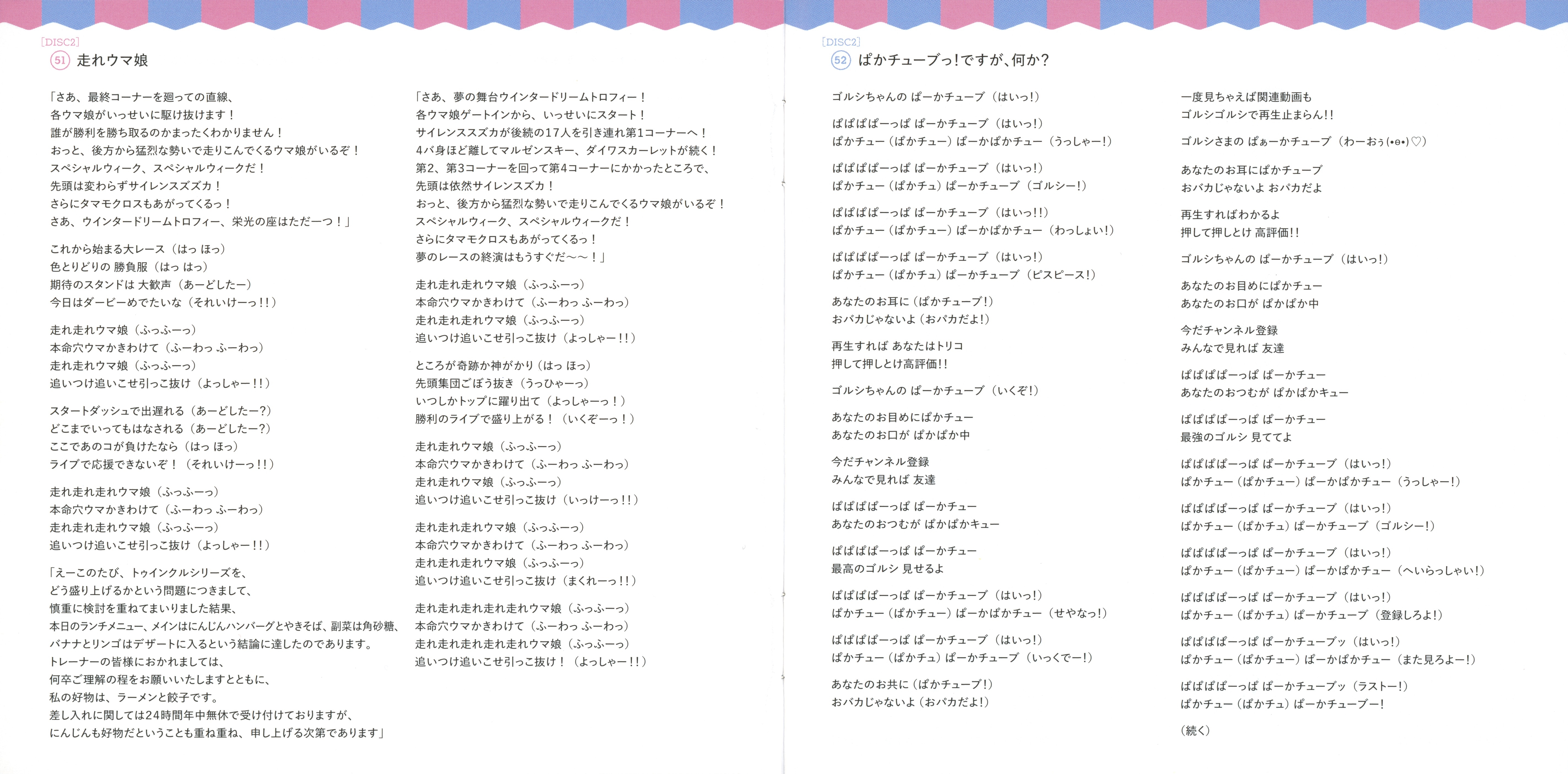 Vocals: Special Week (CV. Azumi Waki), Silence Suzuka (CV. Marika Kohno), Tokai Teio (CV. Machico), Maruzensky (CV. Lynn), Oguri Cap (CV. Tomoyo Takayanagi), Gold Ship (CV. Hitomi Ueda), Vodka (CV. Ayaka Ohashi), Daiwa Scarlet (CV. Chisa Kimura), Taiki Shuttle (CV. Yuka Otsubo), Grass Wonder (CV. Rena Maeda), Mejiro McQueen (CV. Saori Onishi), El Condor Pasa (CV. Minami Takahashi), Symboli Rudolf (CV. Azusa Tadokoro), Air Groove (CV. Ruriko Aoki), Mayano Top Gun (CV. Mio Hoshitani), Mejiro Ryan (CV. Afumi Hashi), Rice Shower (CV. Manaka Iwami), Agnes Tachyon (CV. Sumire Uesaka), Winning Ticket (CV. Yui Watanabe), Sakura Bakushin O (CV. Sachika Misawa), Super Creek (CV. Kana Yuuki), Haru Urara (CV. Yukina Shuto), Matikanefukukitaru (CV. Hiyori Nitta), Nice Nature (CV. Kaori Maeda), King Halo (CV. Iori Saeki)