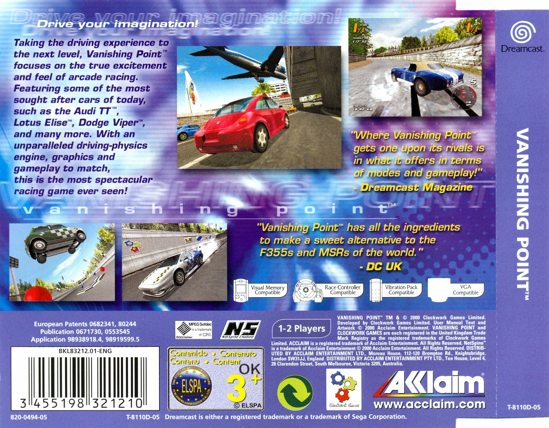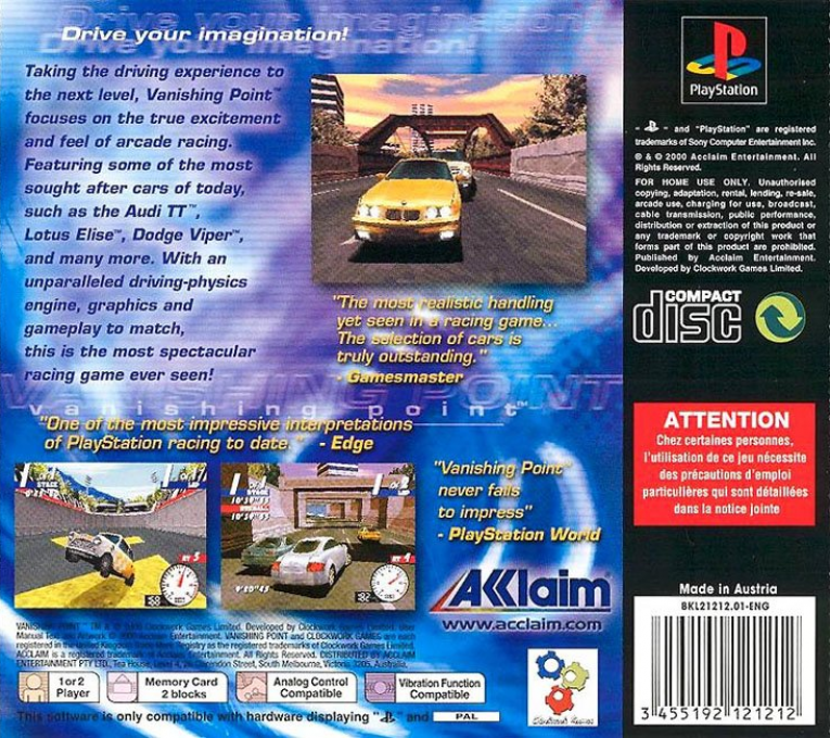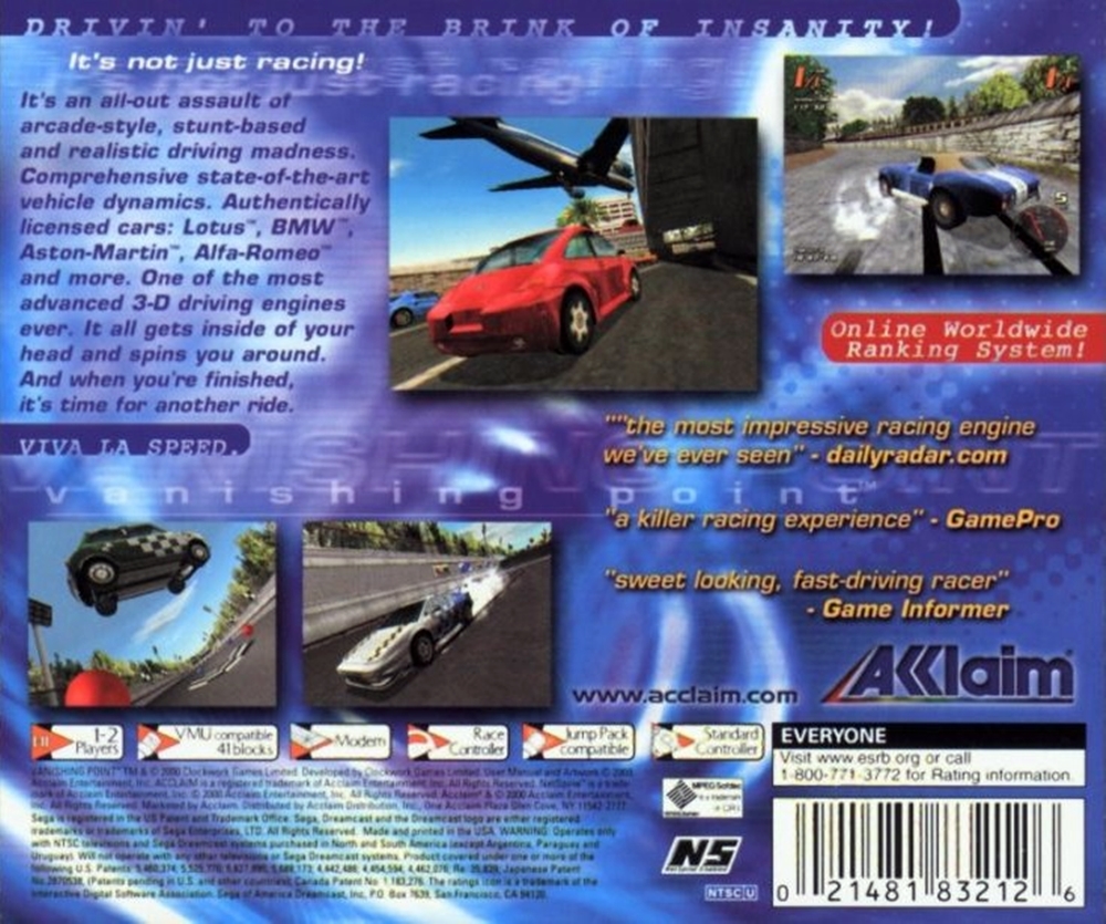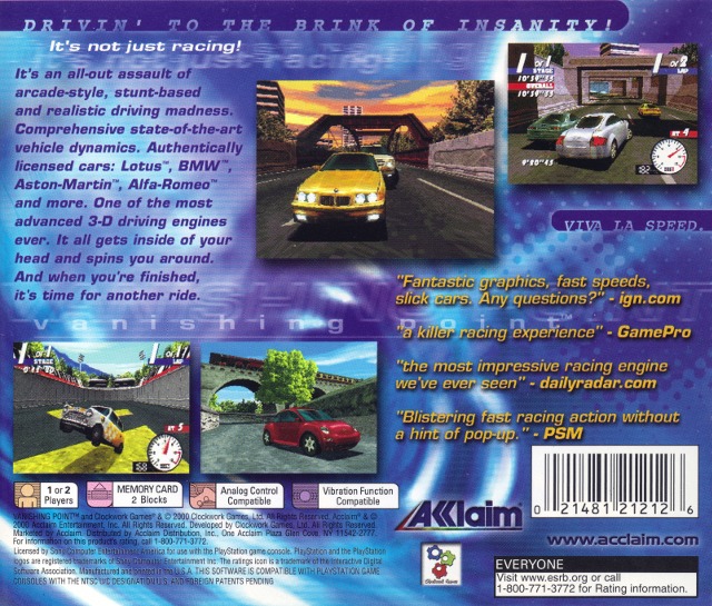 It's an all-out assault of arcade-style, stunt-based and realistic driving madness. Comprehensive state-of-the-art vehicle dynamics. Authentically licensed cars: Lotus, BMW, Aston-Martin, Alfa-Romeo and more. One of the most advanced 3-D driving engines ever. It all gets inside of your head and spins you around. And when you're finished, it's time for another ride.