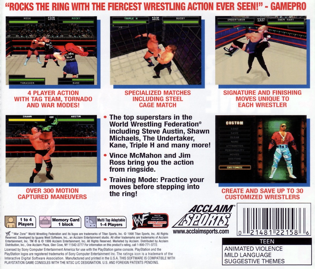 WWF War Zone is here for your PS1, featuring the top superstars in the World Wrestling Federation! Signature and finishing moves unique to each wrestler. Specialized matches including Steel Cage Match. Four-player action with Tag Team, Tornado, War, and Training Modes! Over 300 motion captured maneuvers. Create and save up to 30 customized wrestlers!
