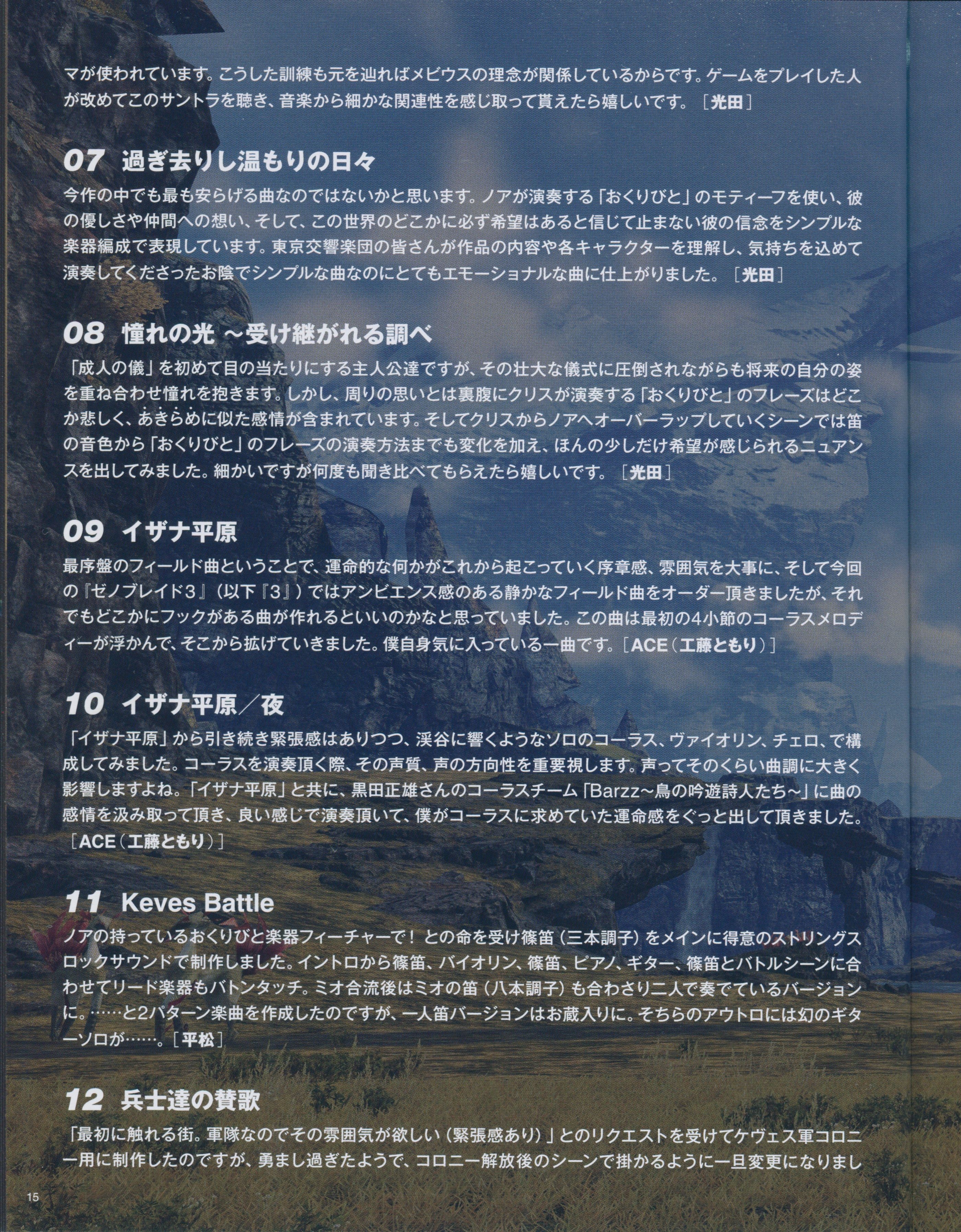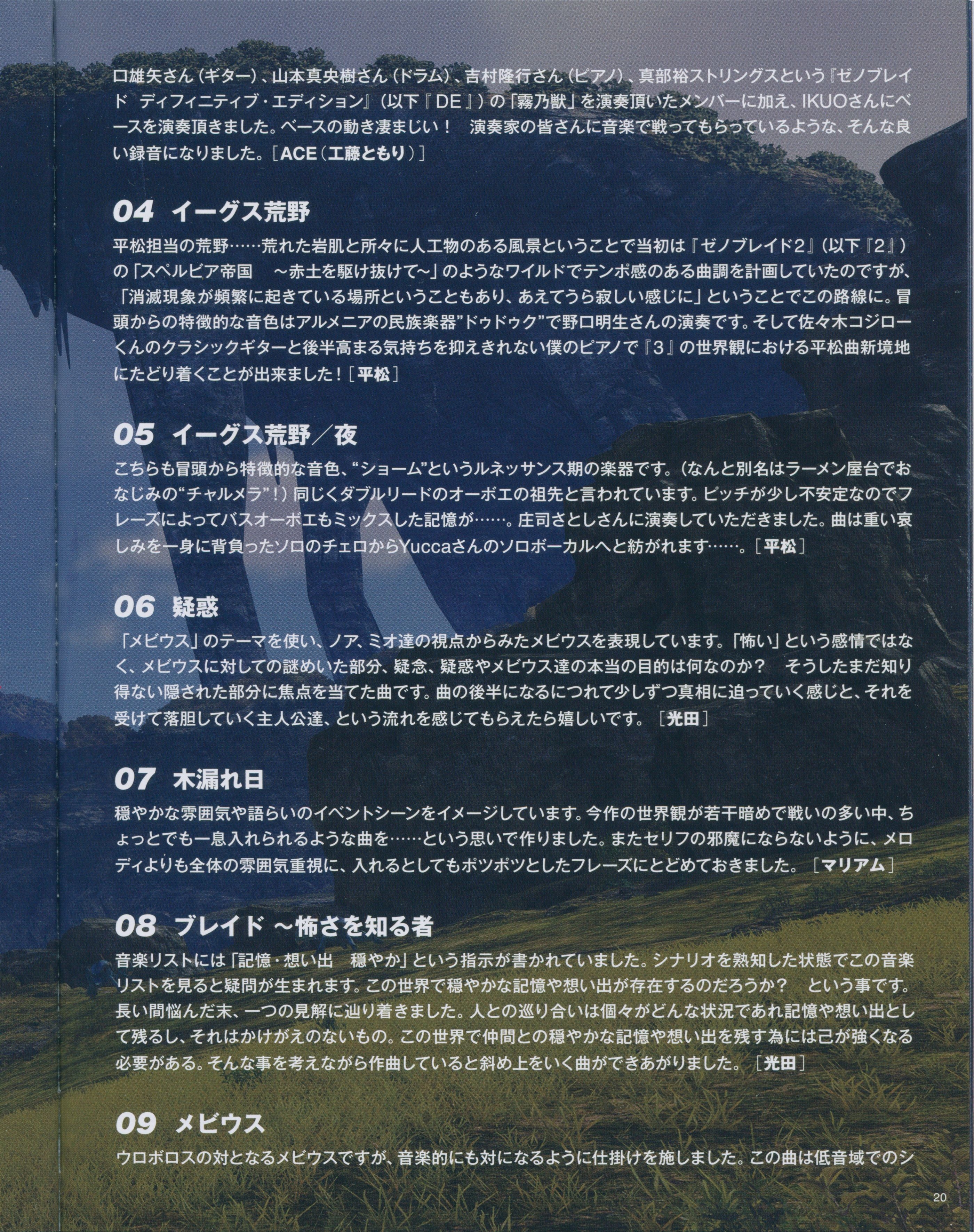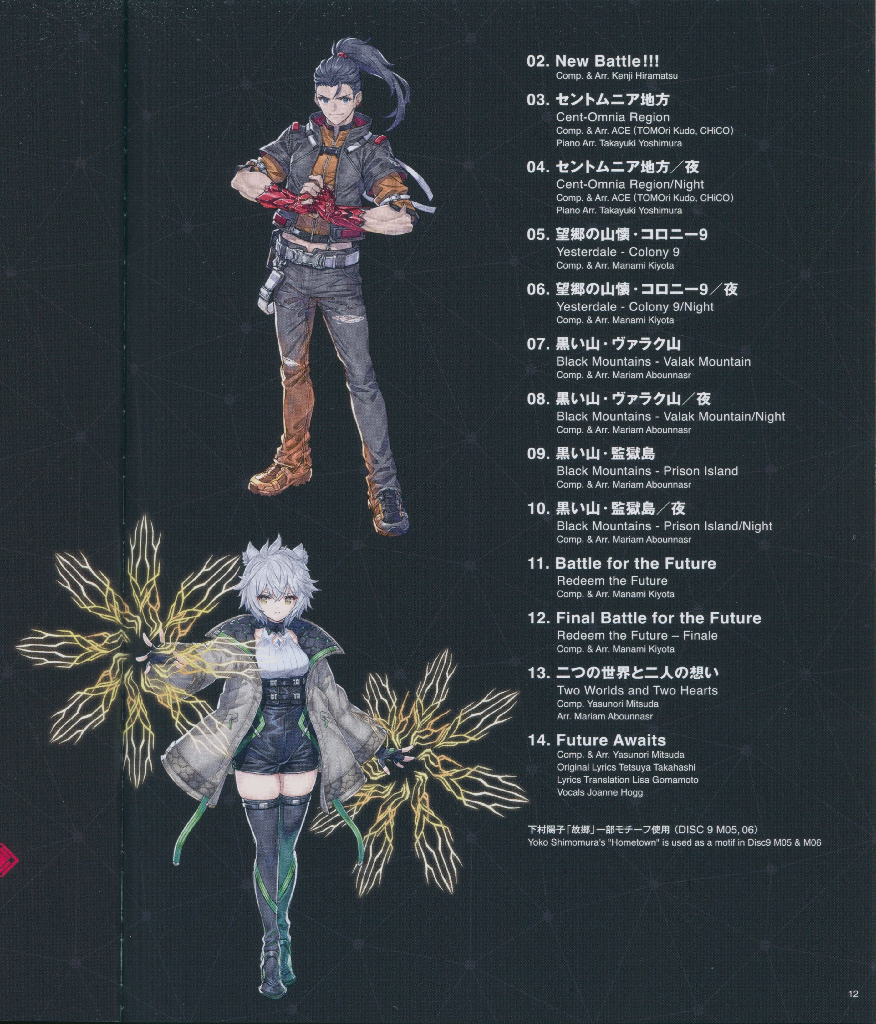 SPECIAL THANKS: Tetsuya Takahashi [MONOLITHSOFT], Koh Kojima [MONOLITHSOFT], Koji Hayashi [MONOLITHSOFT], Takako Shijyo [MONOLITHSOFT], Genki Yokota [Nintendo], Yuki Sakamoto [Nintendo], Sachiko Miyano [SHANGRI-LA INC.], Tetsuya Kakita [Sony Music Solutions Inc.]